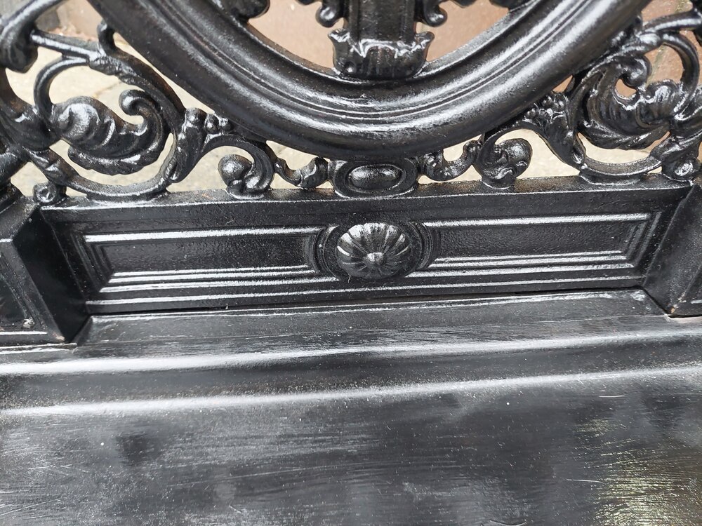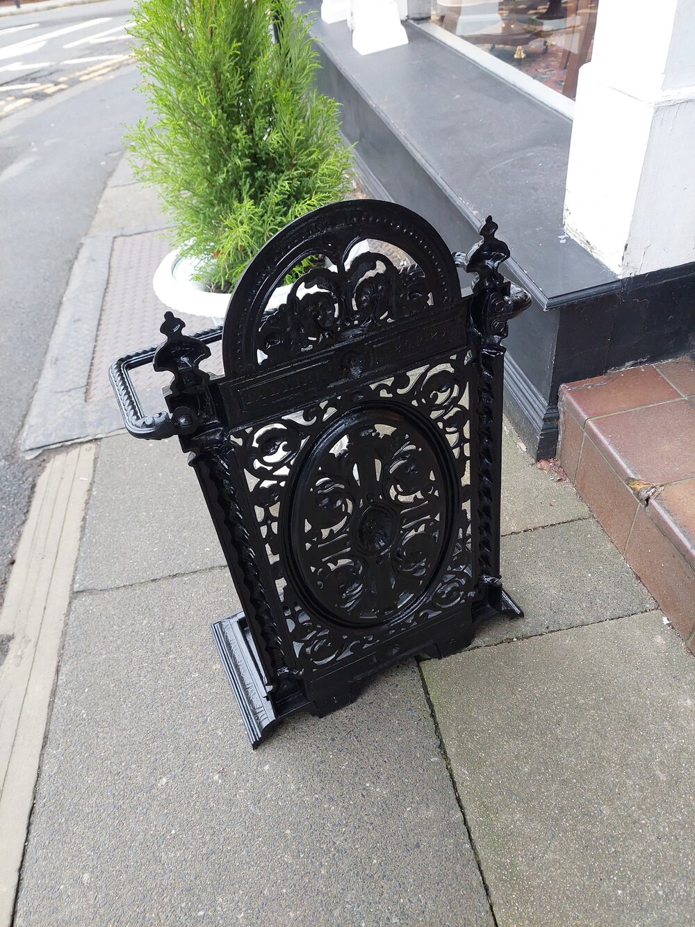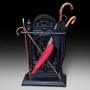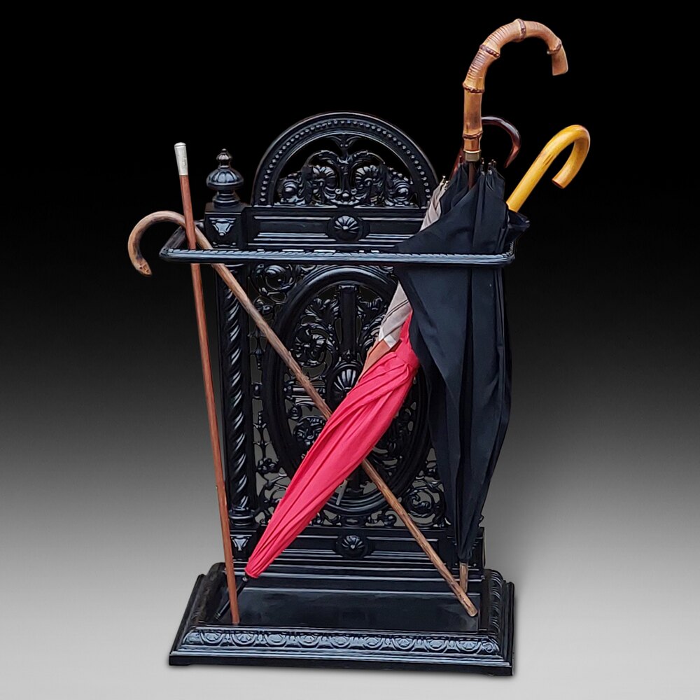 Victorian Coalbrookdale Style Black Painted Cast Iron Stick Stand with drip tray and decorated with flora and classical foliage 19.5"w x 29.5"h x 10"dDateVictorian