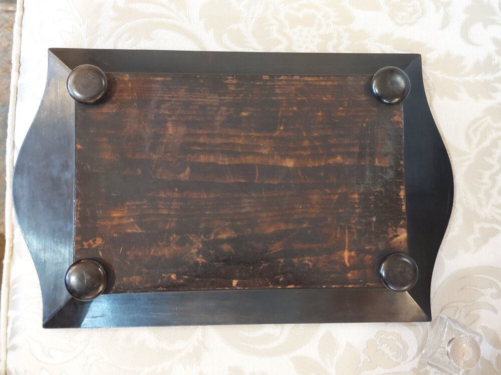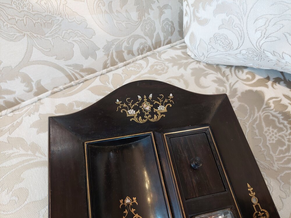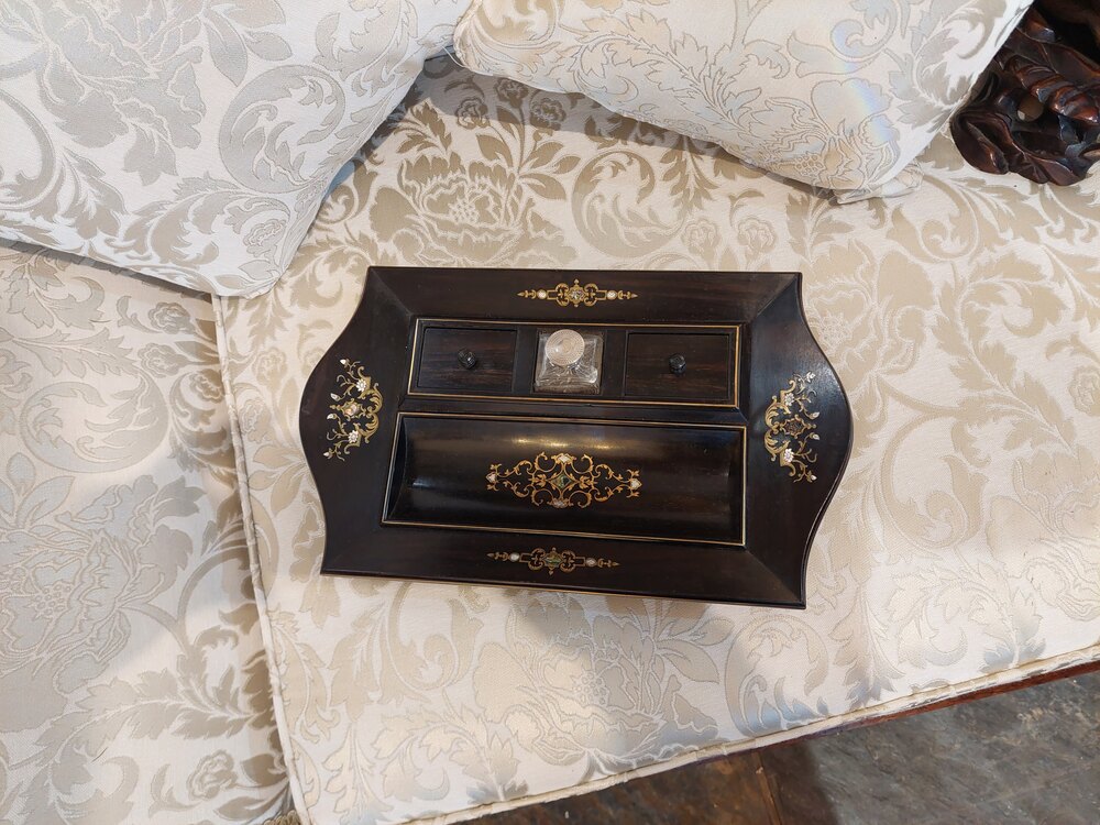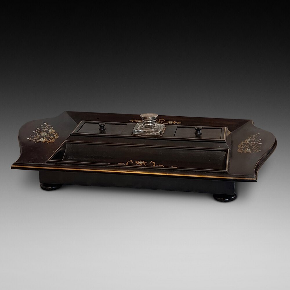 Mid 19thC Coramandel Inkwell Stand/Desk Tidy with Mother of Pearl Inlays, Original Ink Bottle all on Bun Feet - 14.5"w x 8.5"d x 2.5"hDateMid 19th Century