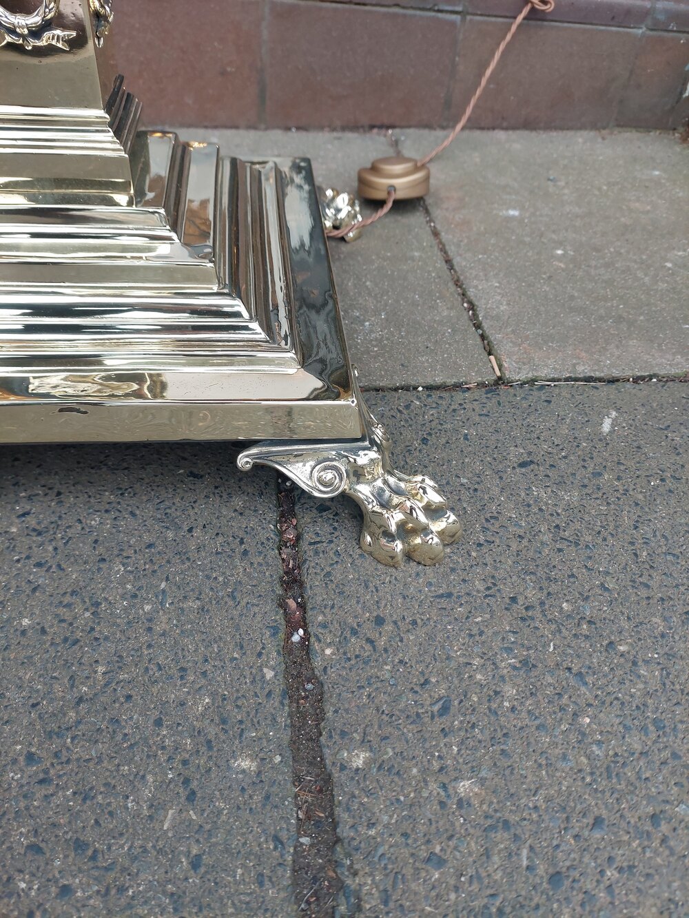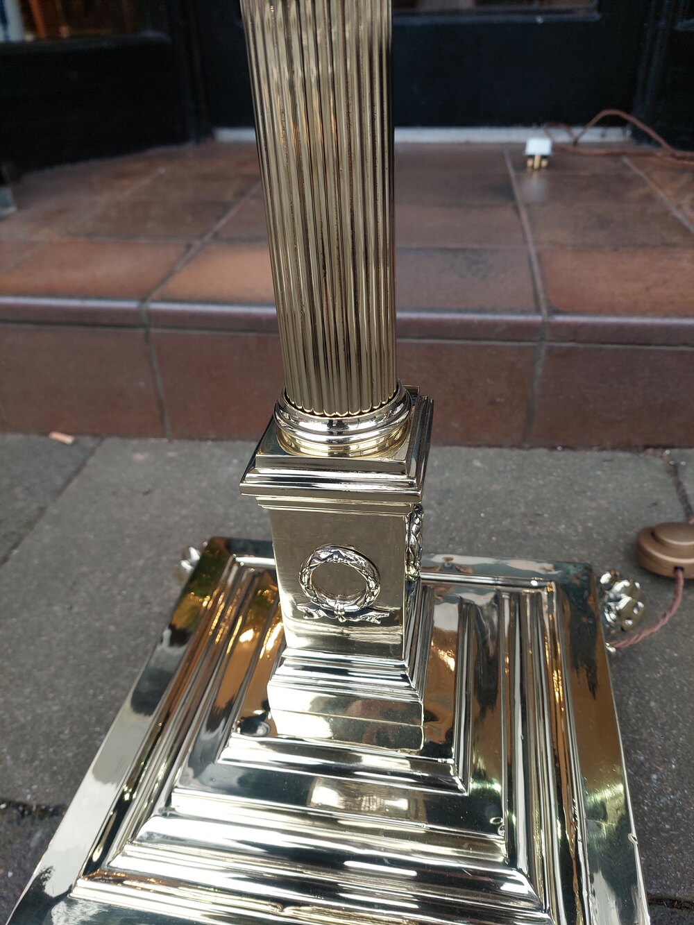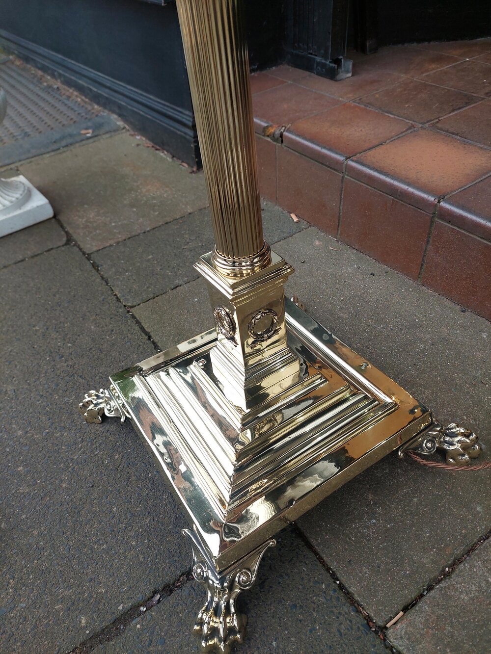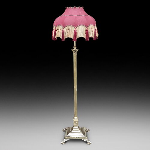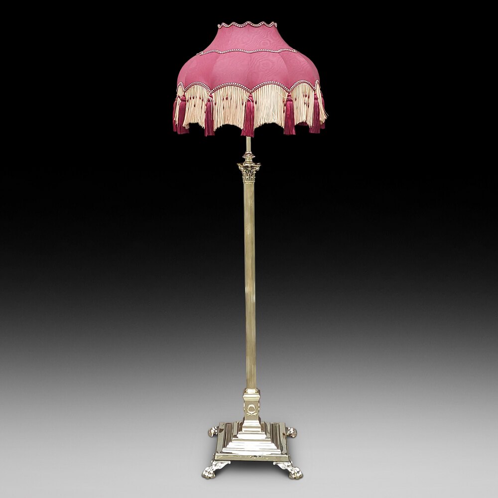 Late Victorian Brass Corinthian Column Standard Oil Lamp, on square stepped base raised on paw feet, converted to electric - adjustable height x 22" diam - The lampshade(s) are newly handmade silks by the same maker as provides the shades for Downton Abbey - all lights and lamps have been rewired with authentic corded flex, fitted with either foot switch or finger clicker switch and are Pat testedDateLate Victorian
