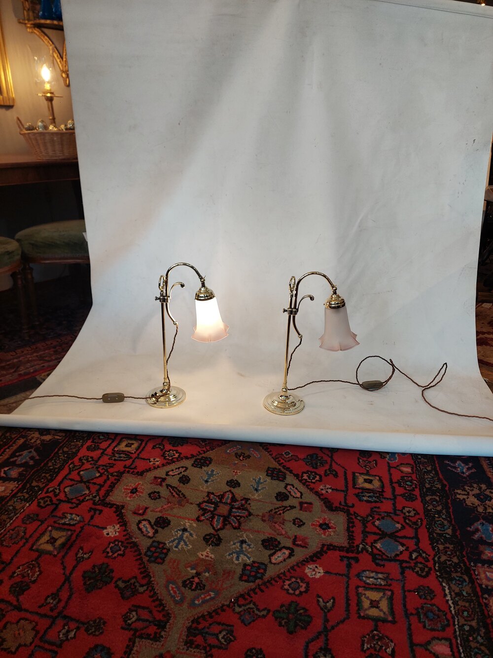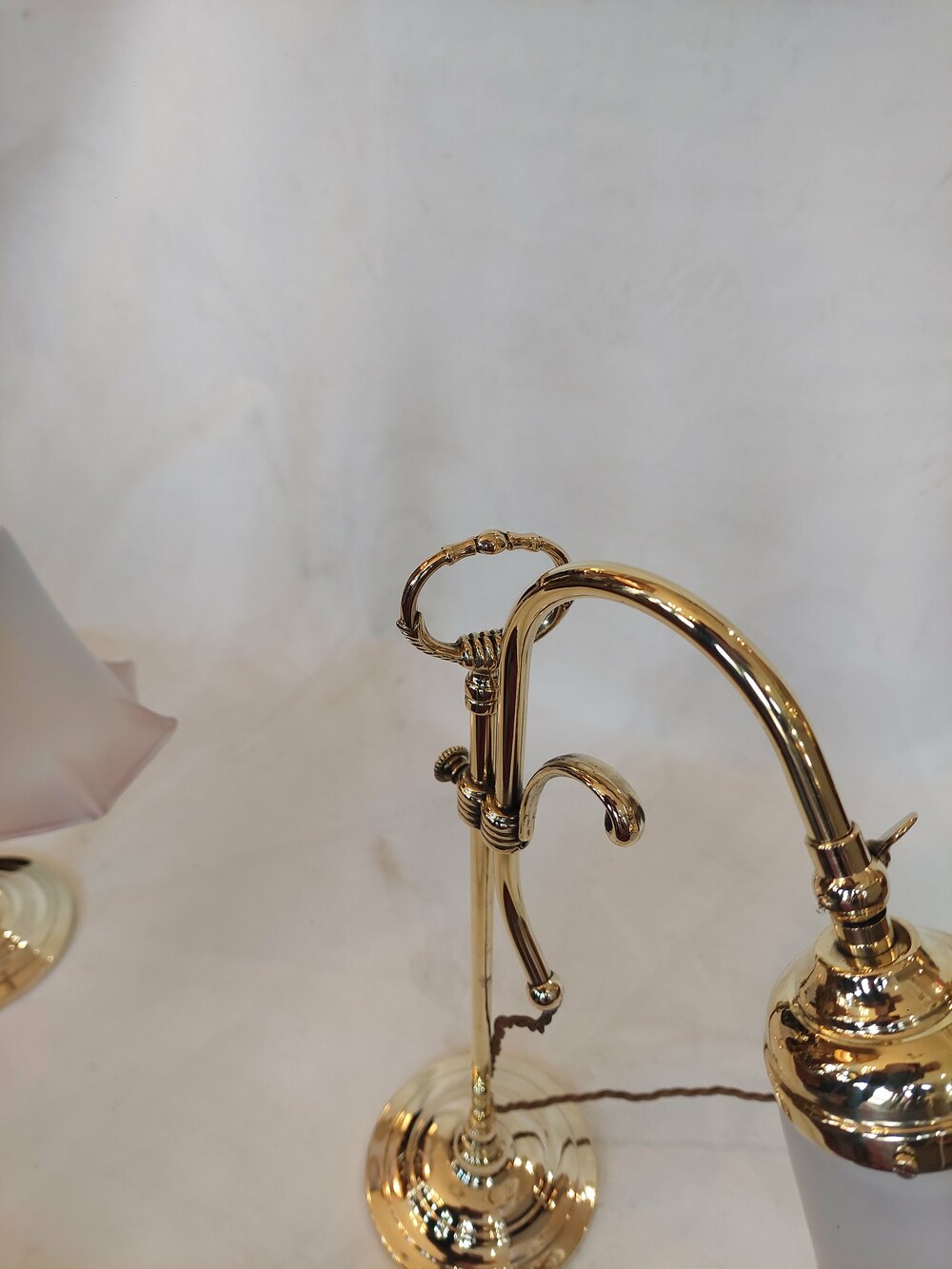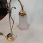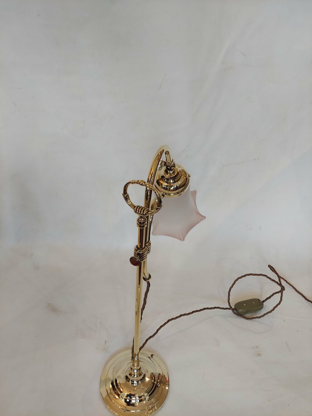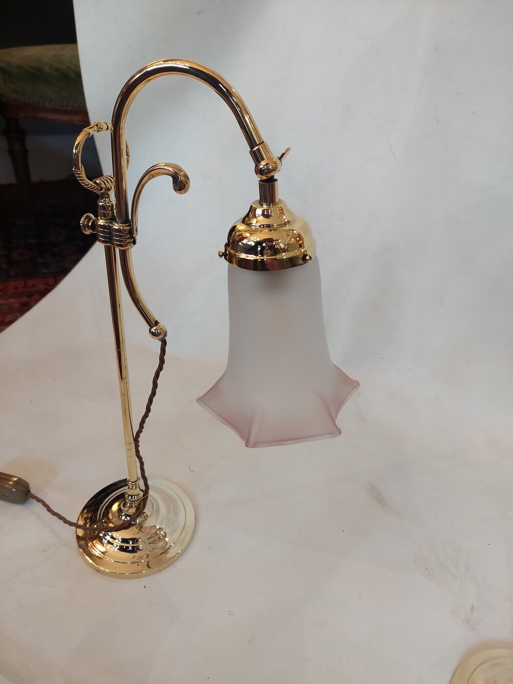 Pair of Early 20thC Brass Swan Neck Desk Lamps with Frosted Pink Glass Shades - all lights and lamps have been rewired with authentic corded flex, fitted with either foot switch or finger clicker switch and are Pat tested - 12" w x 6.5" diam at the base x 20"hDateEarly 20th Century