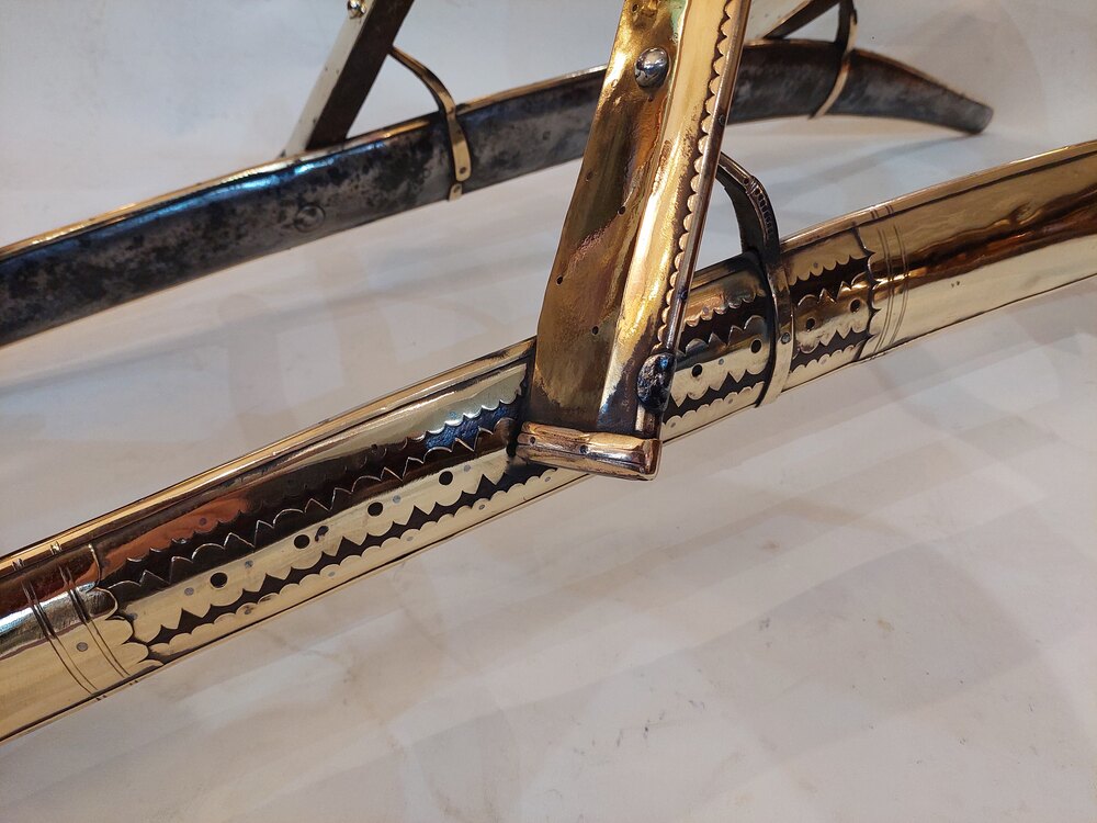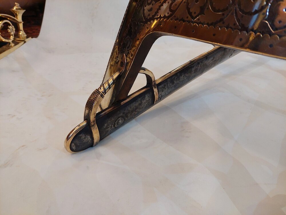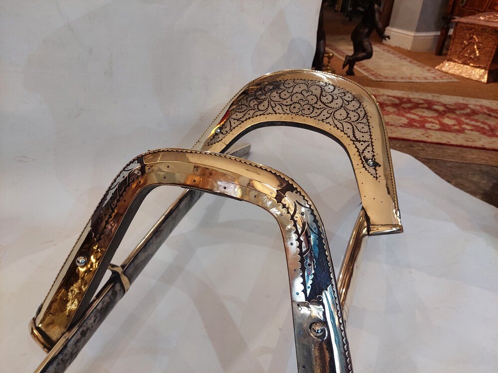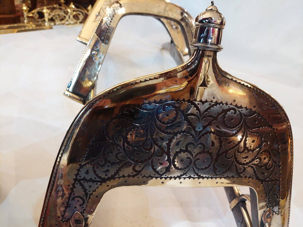 Late19th/Early 20thC Ceremonial Camel Saddle - Wood Frame overlain with Brass inlaid Steel. Made by Mishra Bogaram - Bhan Village near Srinigar Northern India - probably a souvenir from a Grand Tour - 52" w x 20"d x 16"hDateLate 19th Century