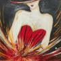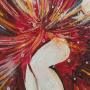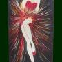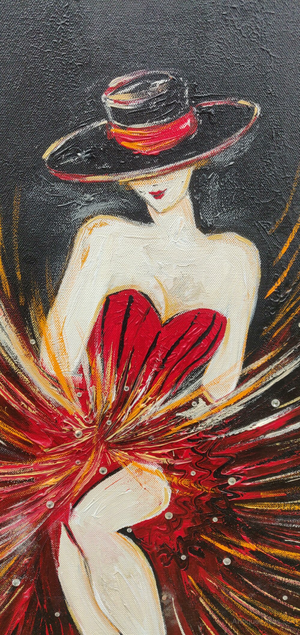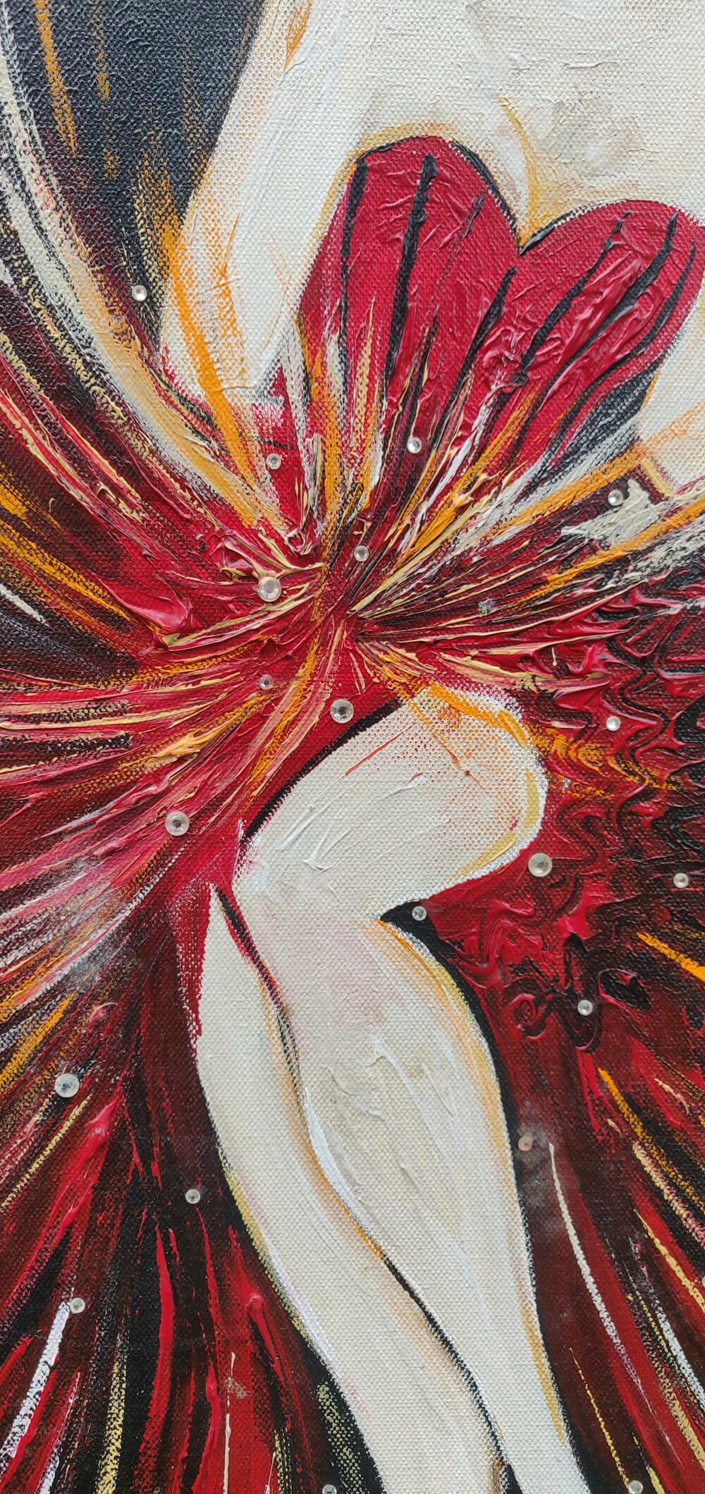 Set against a dramatic black background, the figure explodes with energy — her red and gold dress radiating vibrant brushstrokes and shimmering highlights.
