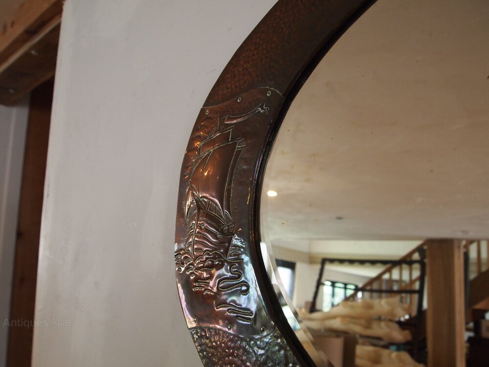 Here we have a wonderful large Arts and Crafts Copper mirror very much in the Newlyn manner c1900. As you can see the frame has wonderful colour and patina. There is an original thick mirror plate with bevelled edge. The frame has raised galleon decoration to the flanks. There are mounted and riveted shapes the top and bottom. The mirror and frame are in excellent condition and ready to hang. The dimensions are approx 94 cm wide 57 cm high 3 cm deep.Buy from a trusted LAPADA dealer