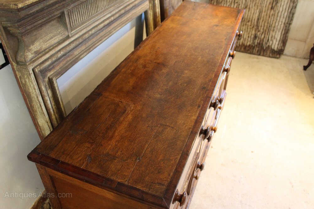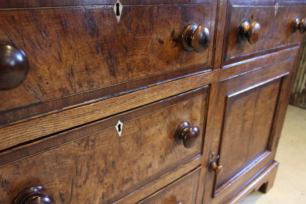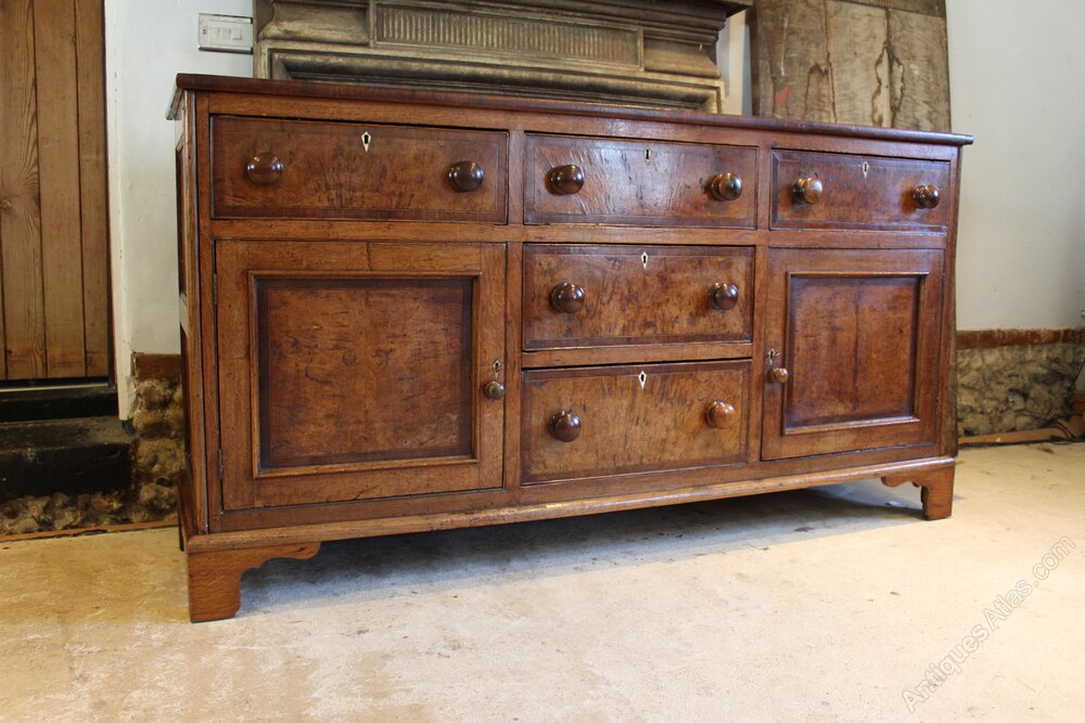 Here we have arare and outstanding George III burr Oak dresser or sideboard c1790. As you can see the dresser has the most amazing colour and patina. There is a straight grain plank top with fruitwood crossbanding to the edge. The drawers have cockbeaded edges and fruitwood cross banding. They also have hand cut dovetail joints and original turned wooden handles. The drawers and cupboard doors have the most beautiful burr Oak fronts which is a very rare feature. The cupboards open to reveal the original green Georgian paint. The sides are panelled and the whole sits on bracket feet. A truly wonderful dresser in great retail condition ready for your home. The dimensions are approx 176 cm long 43 cm deep 93 cm high.Buy from a trusted LAPADA dealer