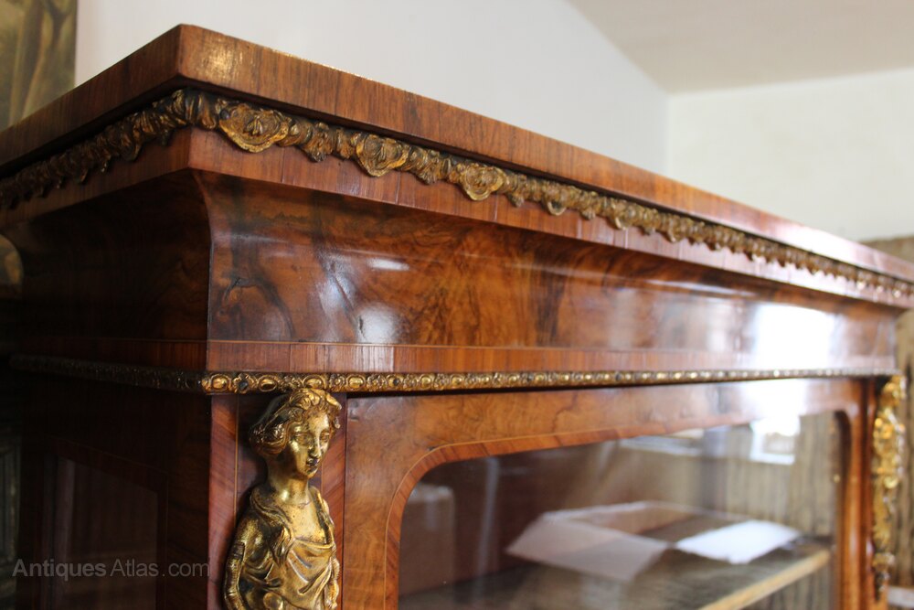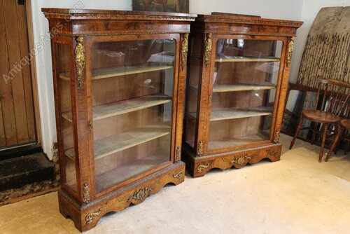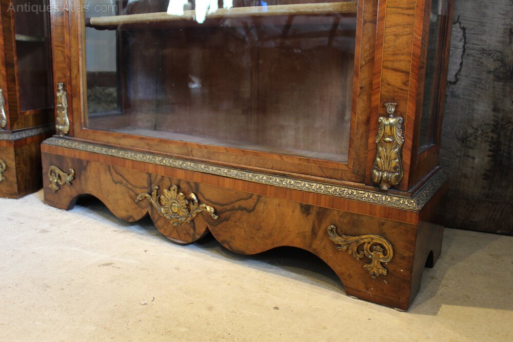 Here we have an exhibition quality pair of fine Victorian Walnut cabinets c1840. As you can see the cabinets have fantastic colour and patina. These beautiful figured Walnut cabinets are of the finest quality and reputedly once stood at Benacre Hall Suffolk. They truly are stunning and being a certain size they were undoubtedly commissioned pieces. There are figured Walnut tops with a stepped crossbanded edges. There is a remarkable and complicated ormolu band below with concave pediment and a more typical ormolu bead below that. There are beautiful gilt ormolu figureheads to the flanks and glass side panels for extra light. There is a Tulip wood band with box wood string around the door and this is also replicated to a greater degree on the sides. The single large doors retain the original glass and have the original working locks and gilt mounted key. Internally there are three shelves and the orignal velvet linings. There is a further complcated ormolu moulding to the top of the plinth base and additonal ormolu mounts to the plinth. These breathtaking cabinets are in wonderful retail condition ready for your home. The dimensions are approx 108 cm wide 33 cm deep 145 cm high.Buy from a trusted LAPADA dealer