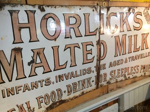 Horlicks malted milk enamel sign. Was originally on the front of a tram that’s why it’s curved at the bottom. Condition is as per photos, the sign has a great look and really attracts your attention. Dimensions are 200cm x 80cmDate1940s