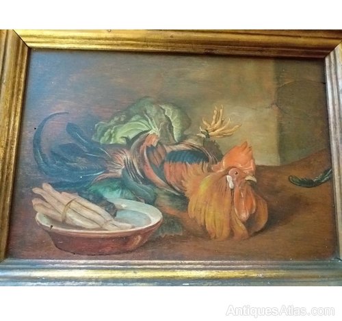 19th Century oil painting of chicken and veg game scene country house painting. 12” x 9” the colours are good and has been well painted. In good condition with three small worm hole.Date19th Century