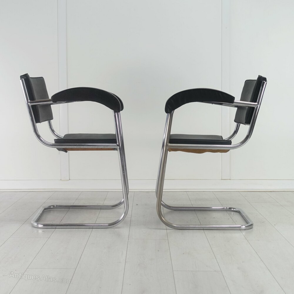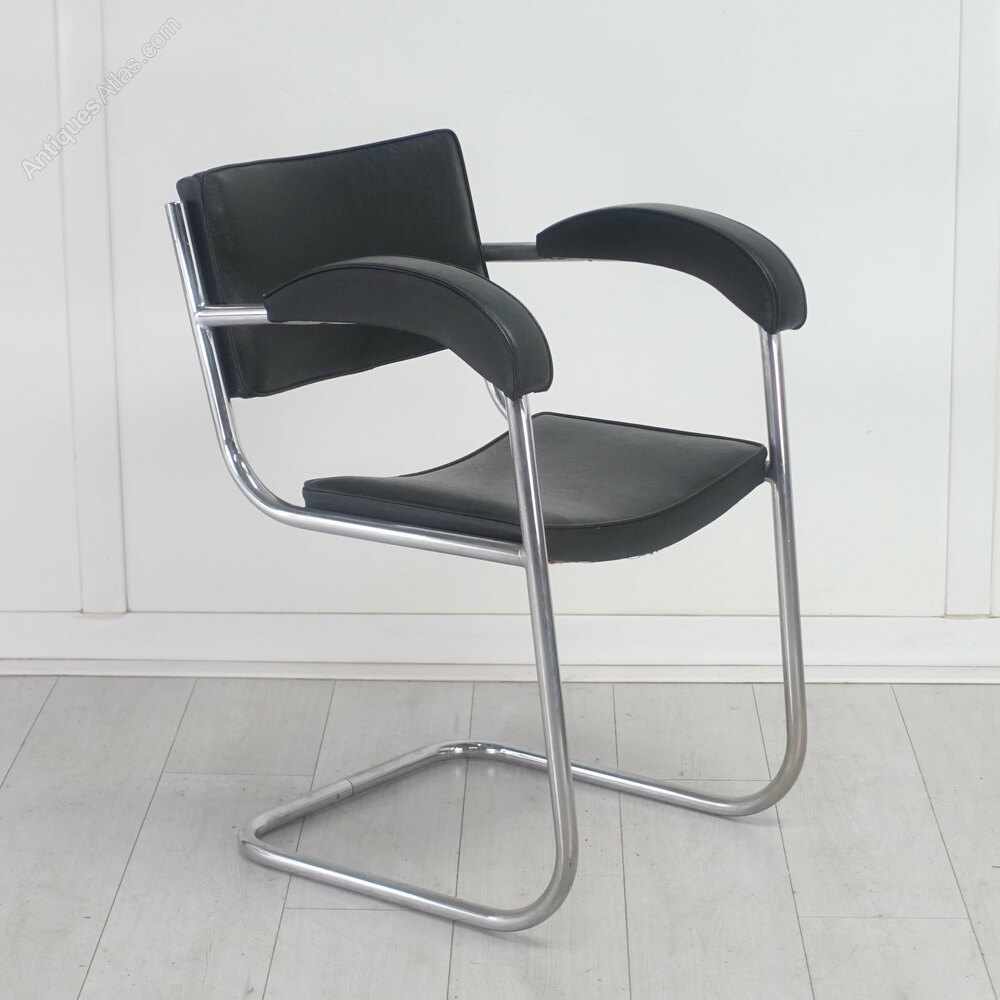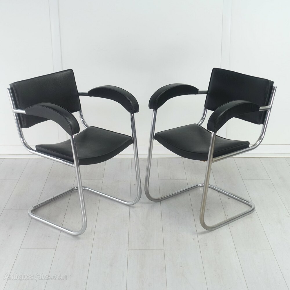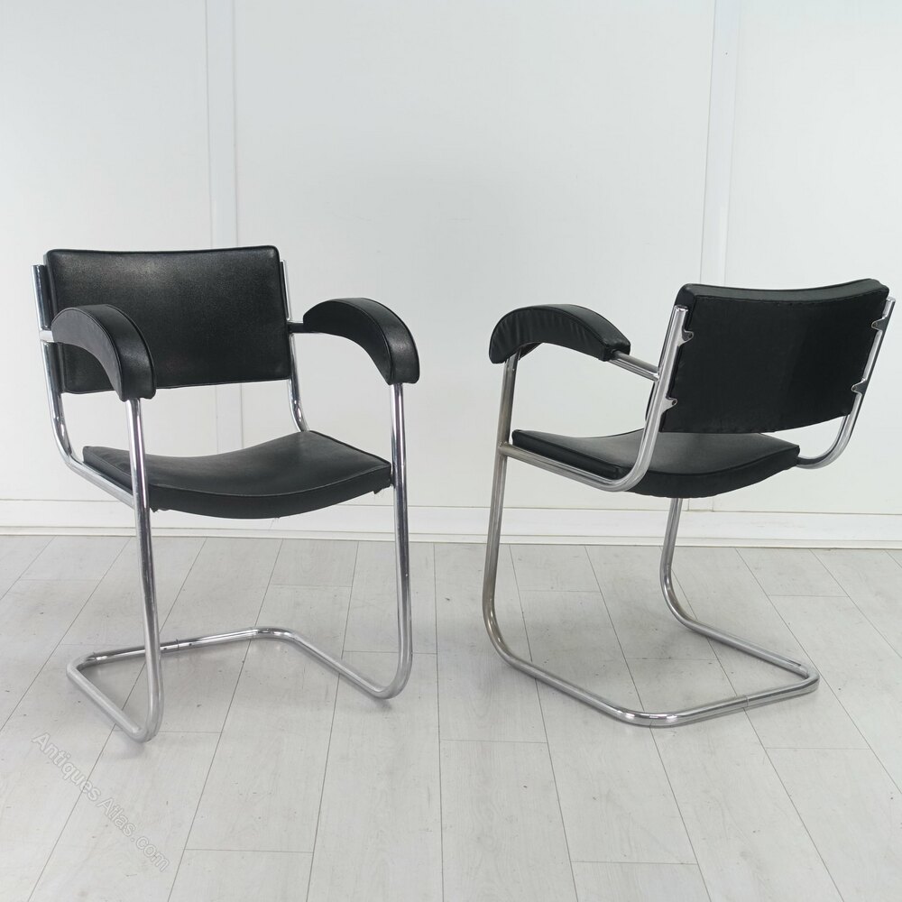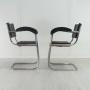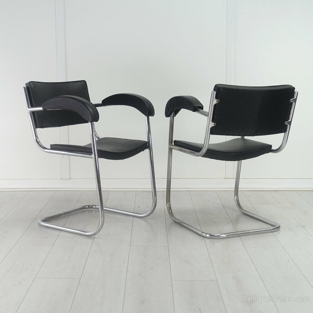 Original English Modernist BBC studio armchairs by Serge Chermayeff, c.1931–32. Tubular steel cantilever design with black Rexine upholstery. Manufactured by Cox and Co Circa 1935.A stylish pair of English Art Deco BBC studio chairs, designed by Serge Chermayeff for use in the new BBC Broadcasting House studios, 1931–32. These modernist cantilever chairs feature chromium-plated tubular steel frames and original black Rexine upholstery.