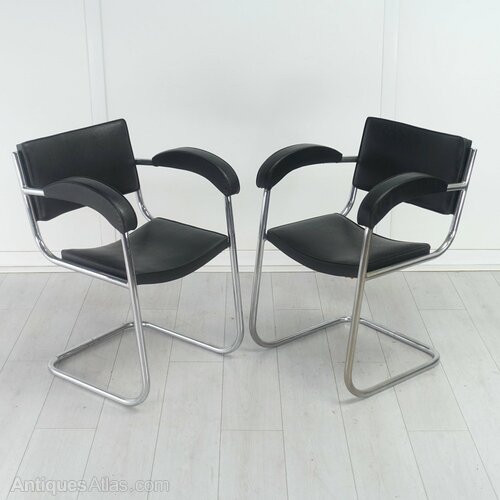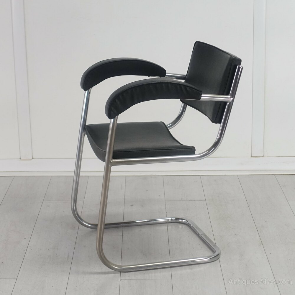 Manufactured in England by Cox & Co (M52 armchair), with the same model also sold by PEL without the distinctive flared arm rests (SP9 armchair). These chairs are excellent examples of early 1930s modernist design, combining functionality with the clean geometric lines typical of the Art Deco period.