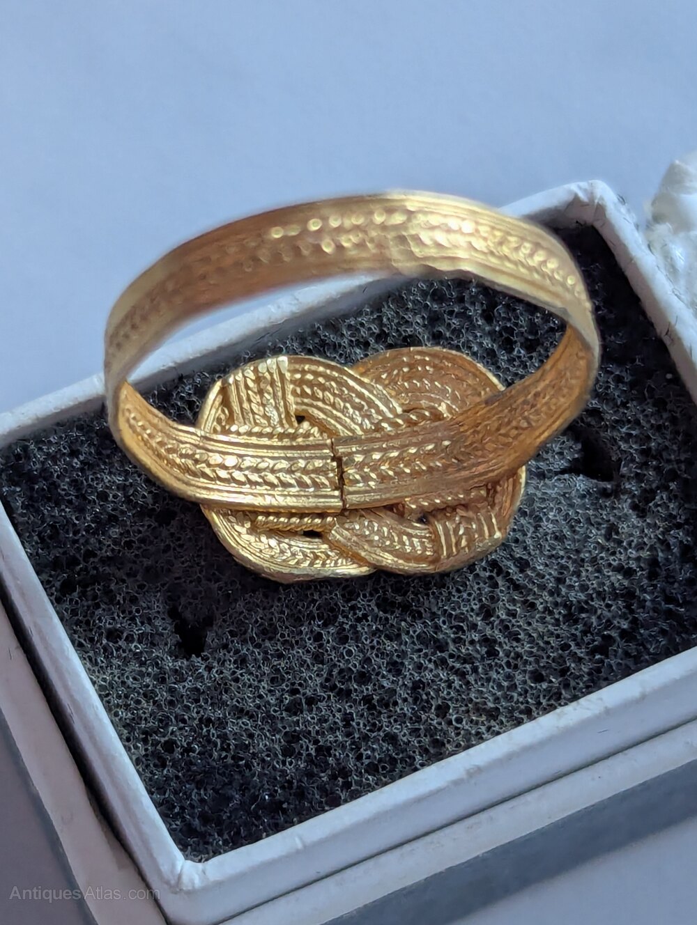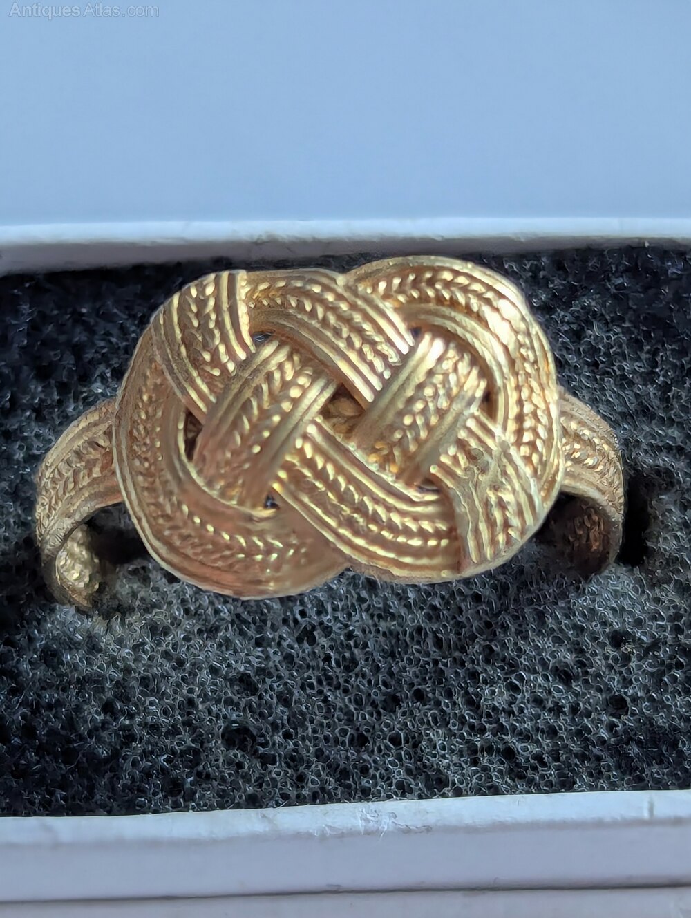 To one side of the knot a small piece of the banding is just showing daylight through, nothing is missing and all still strong and wearable for a delicate ring.