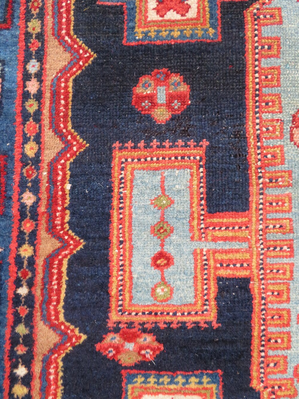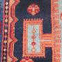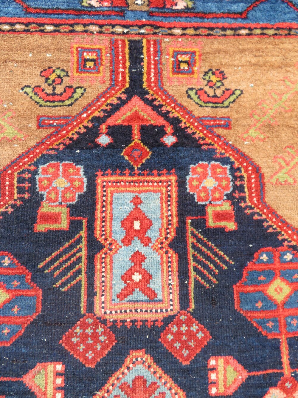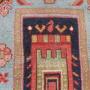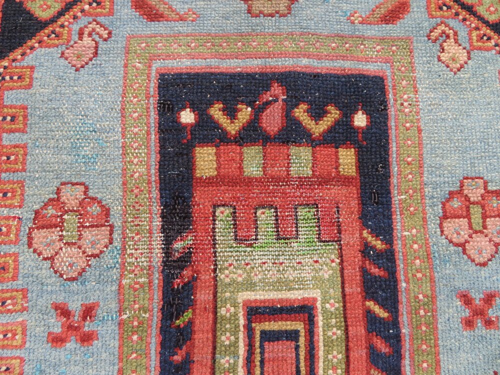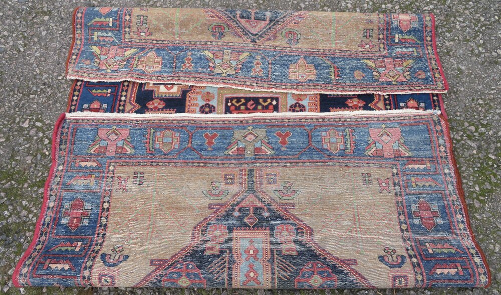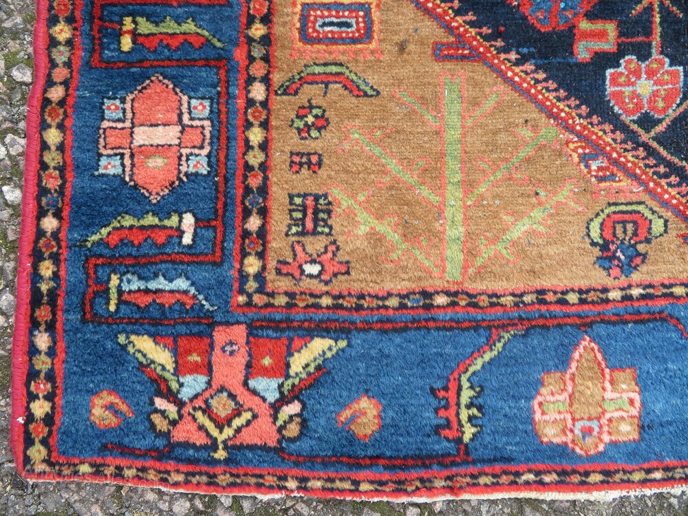 West persia. Geometric design with a lovely electric blue colour as I call it and four stylised tree of life to each triangular spandrel in a light green. Reasonably even pile. Some tinting done by myself and partially rebound side cords done by myself all in all making it a very good value and tidy rug for the money at £325. 6 foot 4 inches by 4 foot 5 inches. 193cm x 135cm. U. K post £20. Now selling no frills priced rugs. Don''t like condition,plenty more restored rugs at more money. For every better condition rug I sell,sell ten times more rugs under £500 than anything else. Wonder why that is? Purveyors of unusual rare distinctive quality tribal rugs & carpets,howard & sons seating,some orientalist items & decorative objects for the everyman.Shipping information