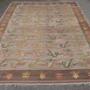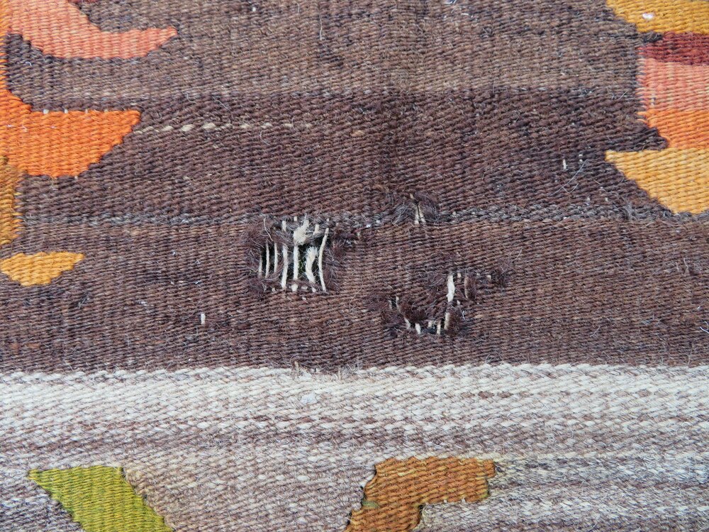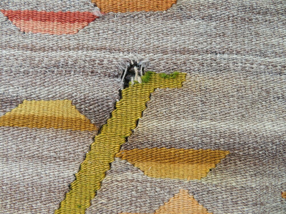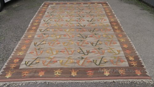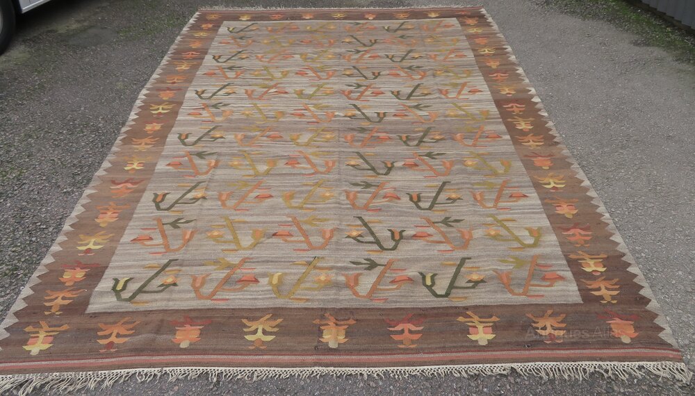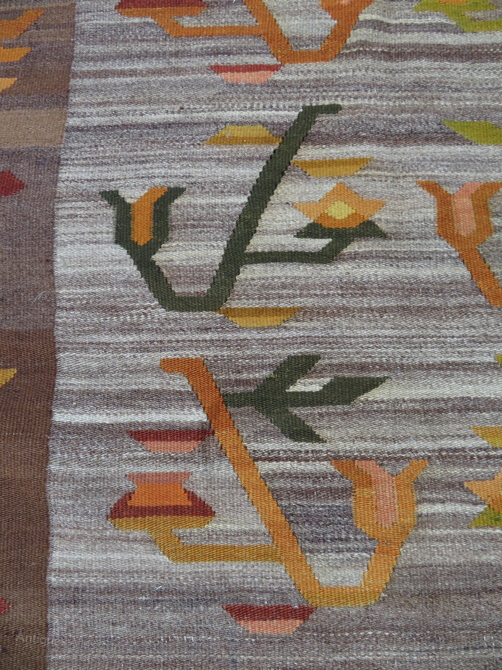 West anatolia. Carpet sized kilim very much in the bessarabian style with repeat alternating tulip patterns on the attractive abrashed grey field. Has some small holes mainly in the border edges,all imaged. But for its size and pricing represents excellent value for money. 11 foot 4 inches by 8 foot 7 inches. 345cm x 261cm. At widest points. Size excluding fringes. Wool construction on wool and cotton warp threads. U. K post £25. Tob 25. Now selling very reasonably priced rugs and carpets at prices that will not break you! Purveyors of unusual rare distinctive quality tribal rugs & carpets,howard & sons seating,some orientalist items & decorative objects for the everyman.Shipping information