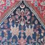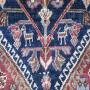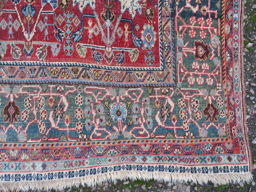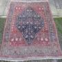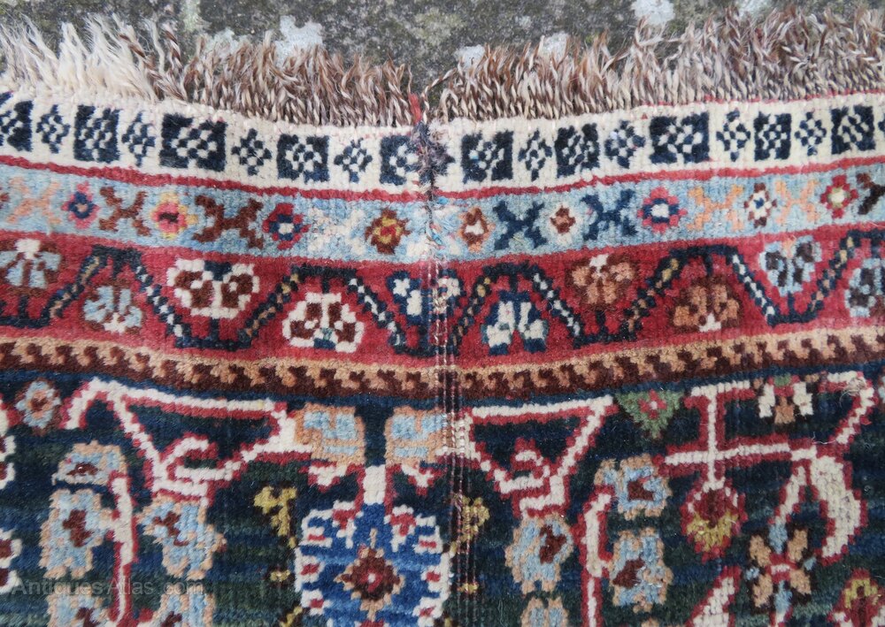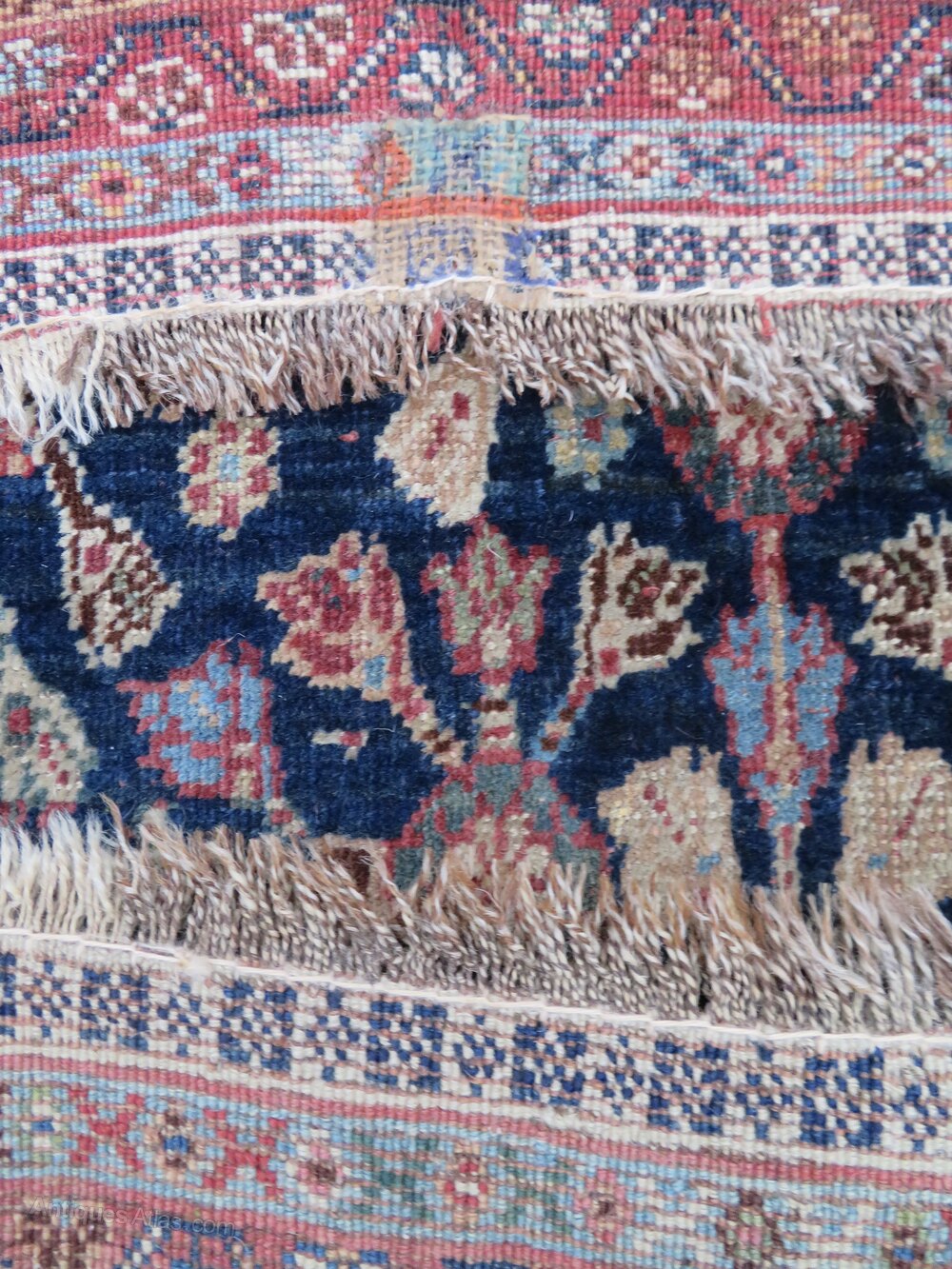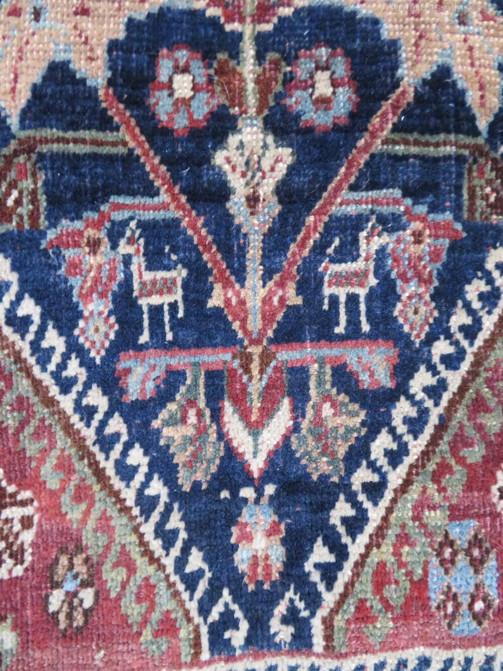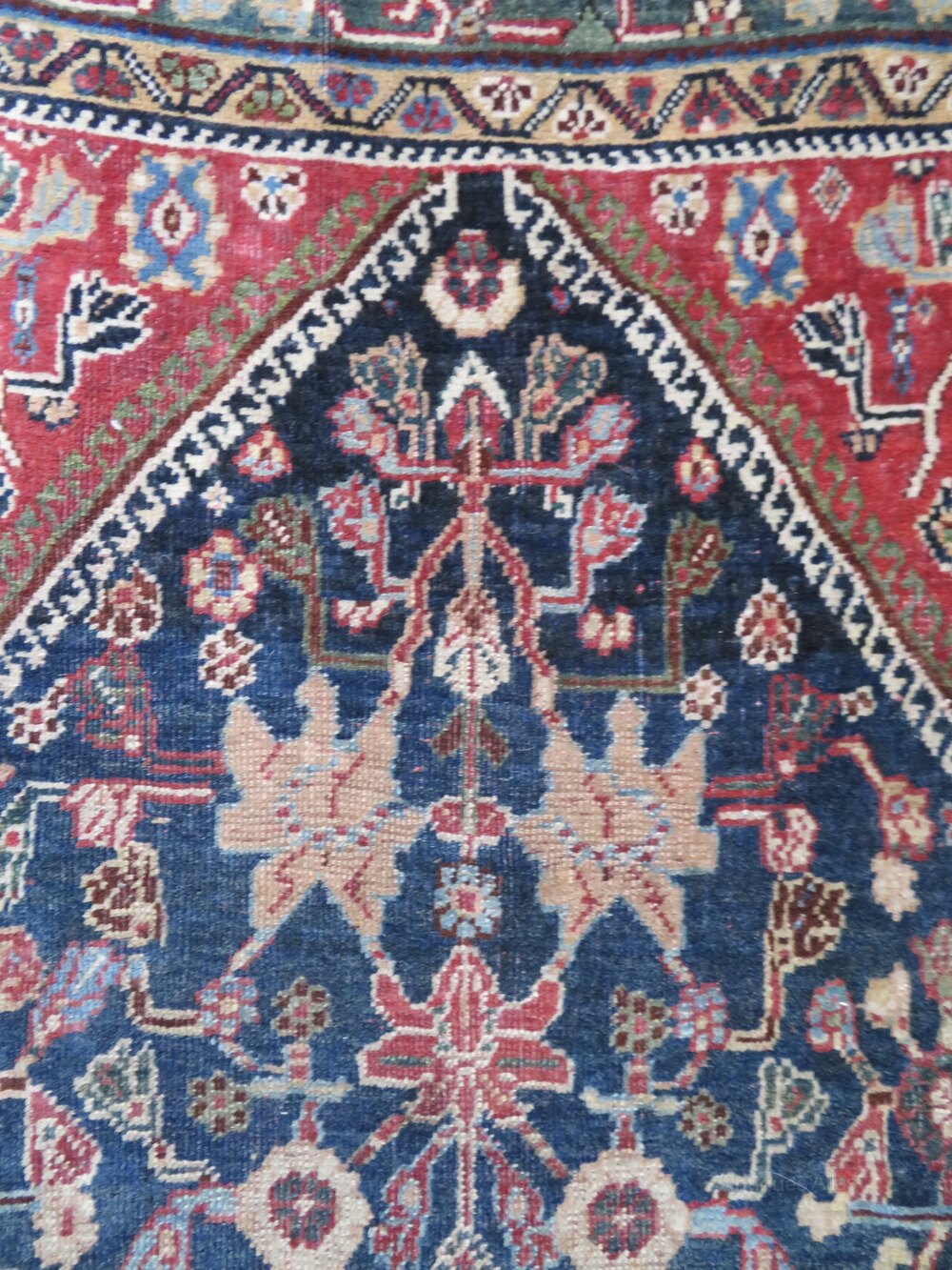 South west persia,circa 1900. Fine and unusual design qashqai kashkuli. Particular details of almost abstract like stiff floral designs within the midnight blue field and within the red surroundings. Spot the pair of animal motifs with chequer design bodies towards the bottom of the blue field. For me the broad main turquoise border of floral motifs almost becoming stiff abstract interpretations compliments its overall unusual look for this tribal group. A thoroughly individual and spontaneously laid out designed tribal weaving. Size is 6 foot 7 inches by 4 foot 9 inches. 201cm x 145cm. At widest points. All wool construction. Pile is fine and velvety. Even low pile. Top end with an edge repair imaged both sides. Not that noticeable from the front. U. K post £20. Now selling realistically priced rugs and carpets. Purveyors of unusual rare distinctive quality tribal rugs & carpets,howard & sons seating,some orientalist items & decorative objects for the everyman.Shipping information