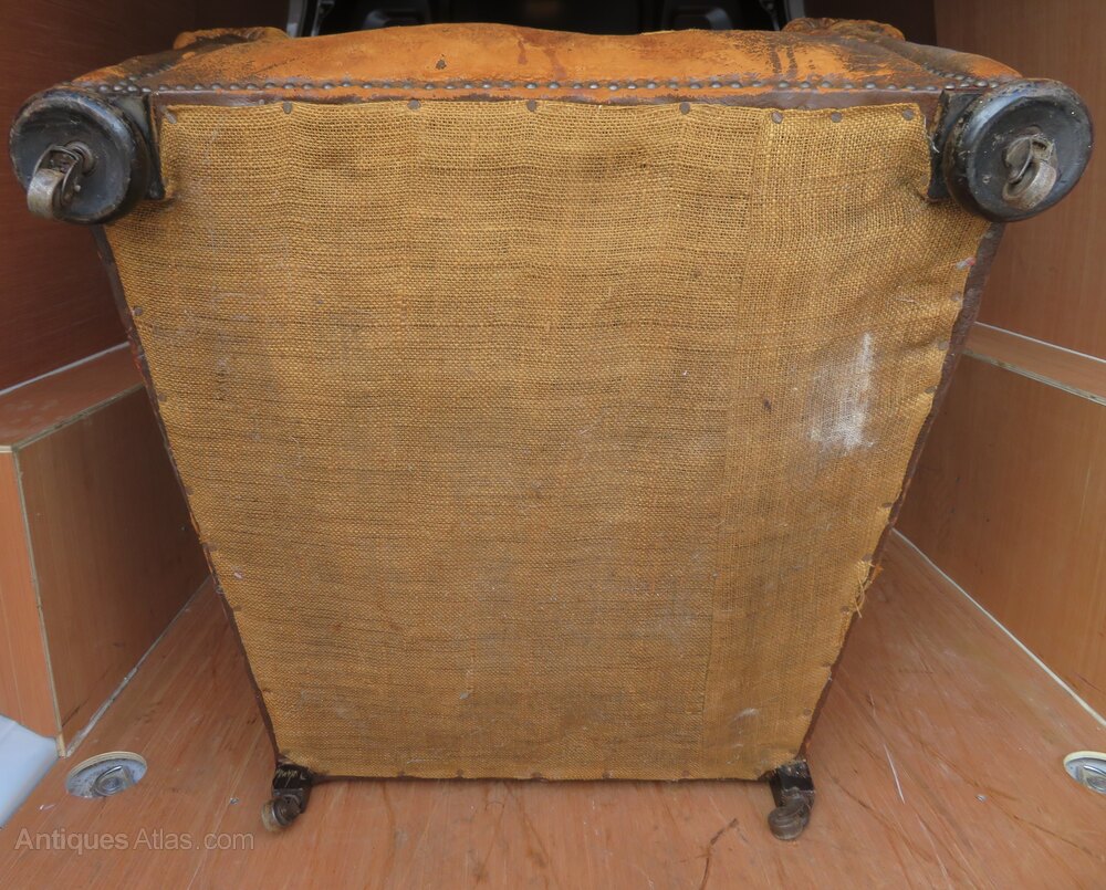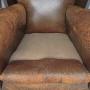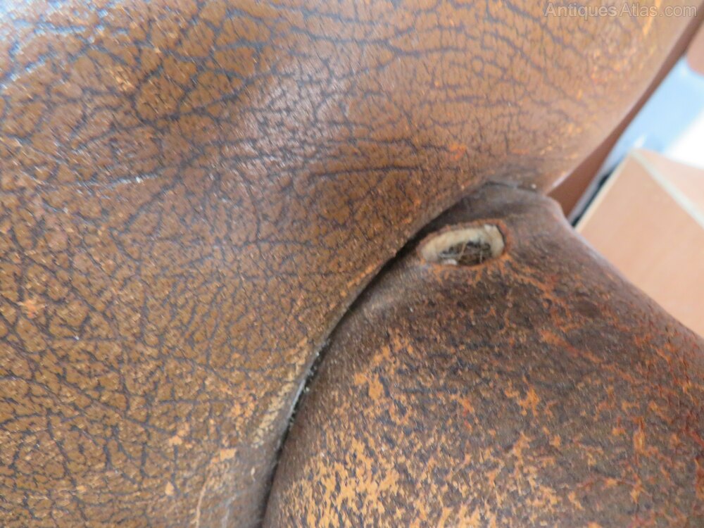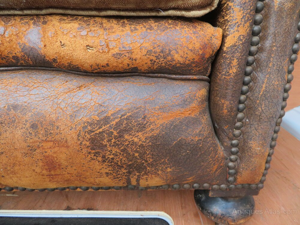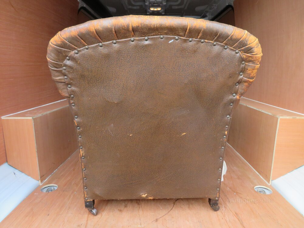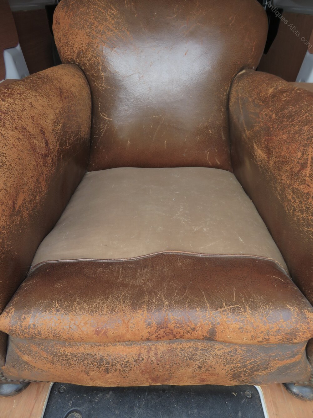 Circa 1925-30 deco original leather deep seated club armchair. All round leather meaning sides and back also leather. A lot aren''t, in fake leather / pvc. Has a sprung edge to the seat and coil sprung arms and back. Original velvet feather filled cushion. Leather could do with a polish up ,minor small circular hole to right side edge near where it meets the back and a couple of very minor holes to front edge,all imaged. With some cosmetic work would look stunning or enjoy as is. Ideal for a man''''s space///man cave. Trade sale price of just £345. Look at what others charge for leather!!!! Now selling reasonably priced items. Can deliver, inquire. Height of back 30 inches, (77cm). Max width 32 inches, (81cm)max depth 32 inches, (82cm)