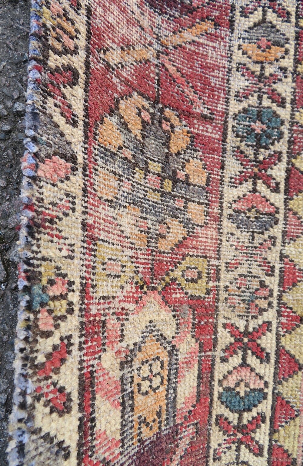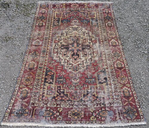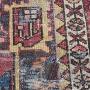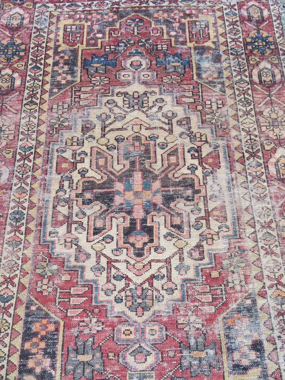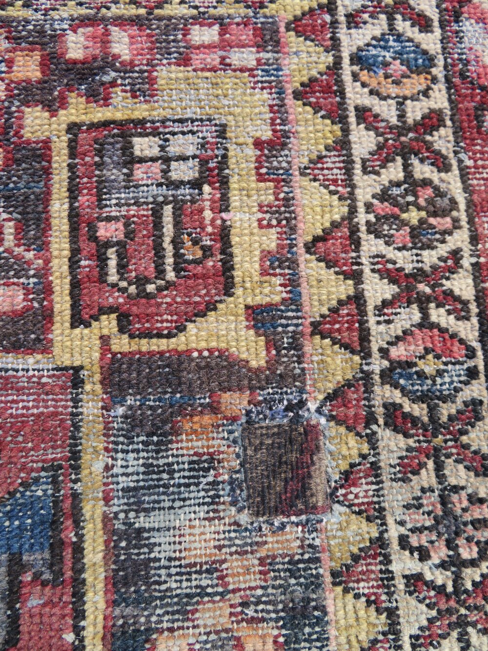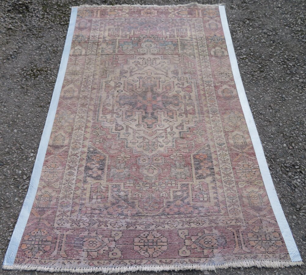 West persia,early 20th century. Well worn with a small patch,complete side cord losses,reinforced from rear to sides to prevent further loss,fringes even and secure. Been dusted from rear,all imaged. Has some nice colours including a yellow. These rugs are great as inexpensive floor coverings with that worn look also. 6 foot 7 inches by 4 foot 4 inches. 202cm x 133cm. At widest points. Fringes not measured in size. Wool pile hand knotted onto cotton foundations with wefts dyed light blue. U. K post £20. Only £245 gbp. Tak 70. Now selling very affordable antique rugs & carpets,restored,worn and everything in between.Shipping information
