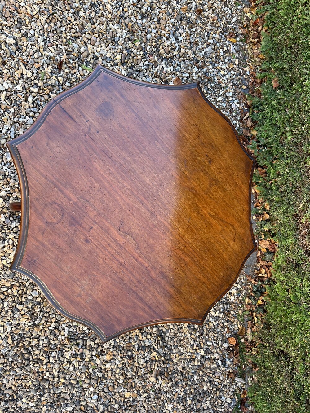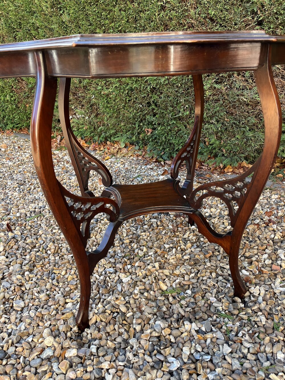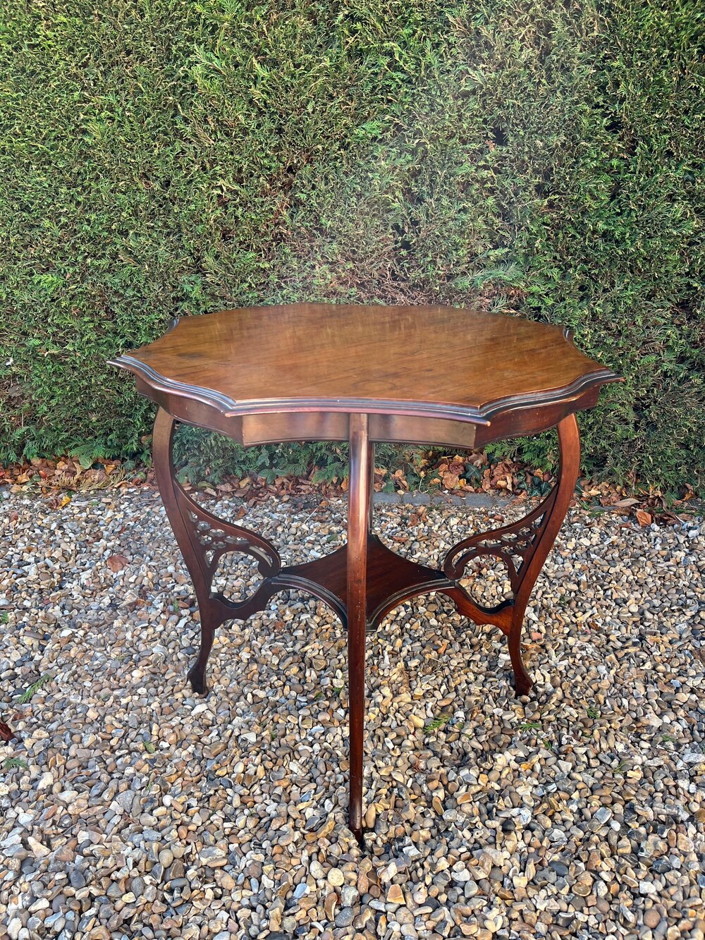A striking Victorian mahogany table with scalloped edges, decorative fretwork and undershelf stretcher. It has swept legs. It is in good condition, with marks and wear commensurate with its age and previous use.DateVictorian