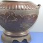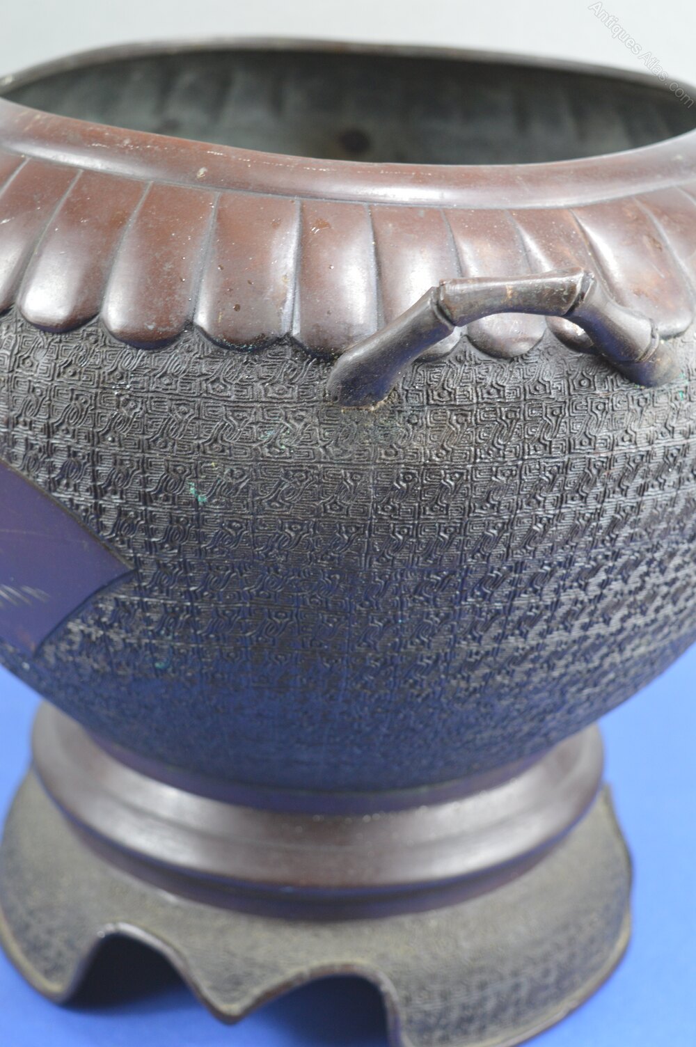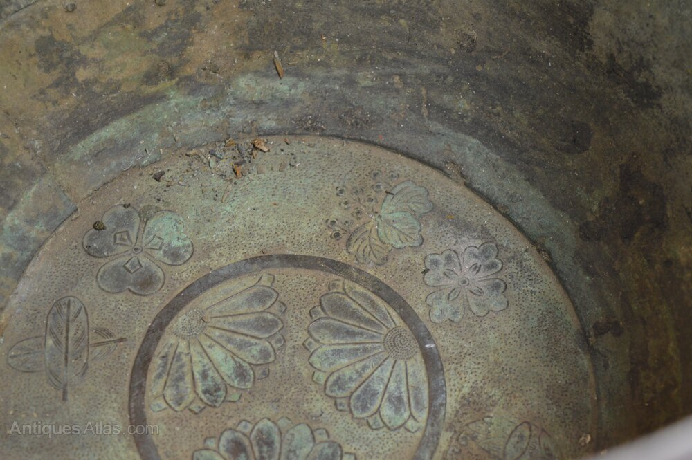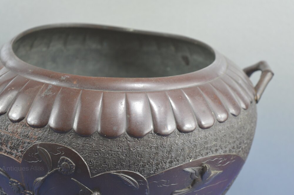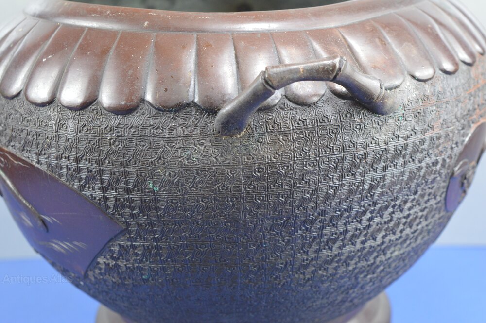 Very large and decorative mid 19th century Chinese bronze bowl,c1850. Standing on a raised base this is a highly decorative example with scalloped decoration to the rim and panels across the main body featuring birds in flight etc in relief. The stylised handles are in the form of bamboo stems. Overall condition is good, in line with age and use. There are minor scuffs/rubbing, a very small deformation to the rim and a few historical repairs which are only really visible on the inside of the bowl. All in all a large and highly decorative Chinese antique which would display well in a modern or older setting. Please refer to the detailed photographs and feel free to contact me if you would like to view the item or have any questions.Price includes FREE UK delivery. Please contact me regarding international shipping.