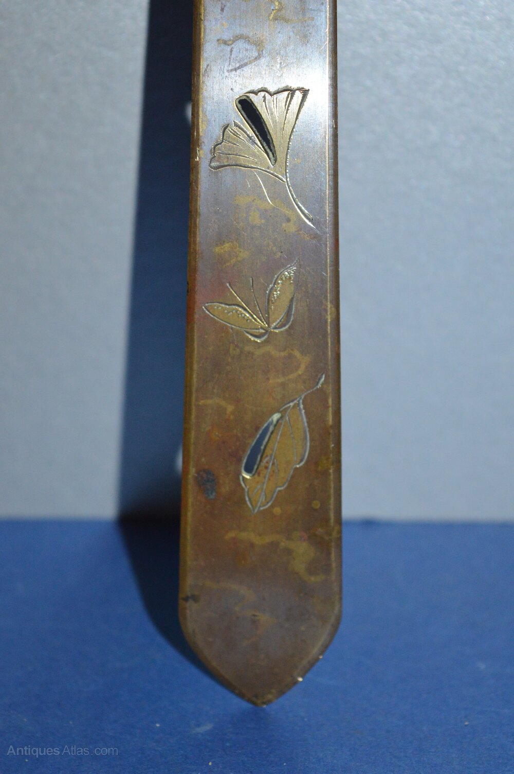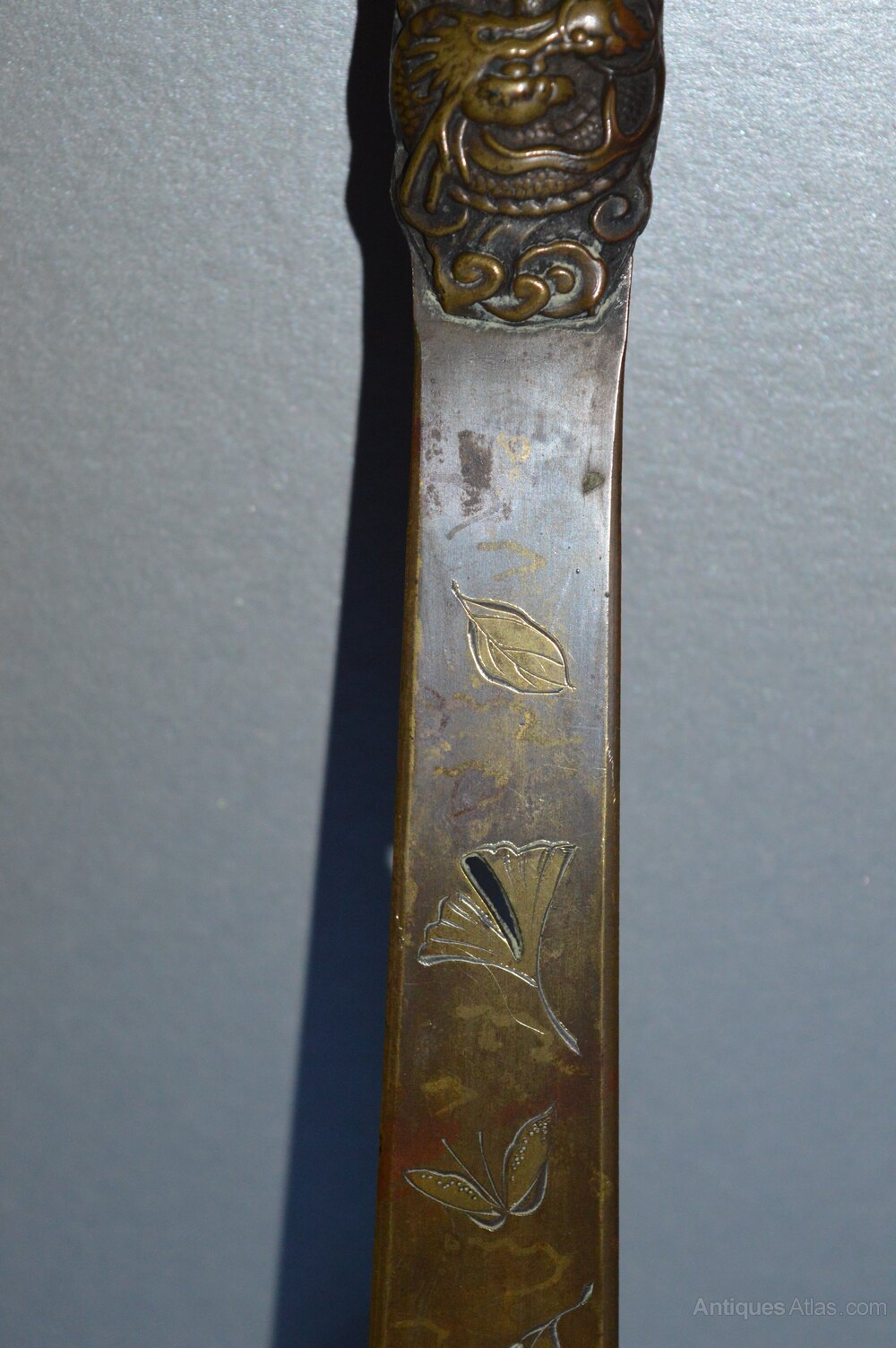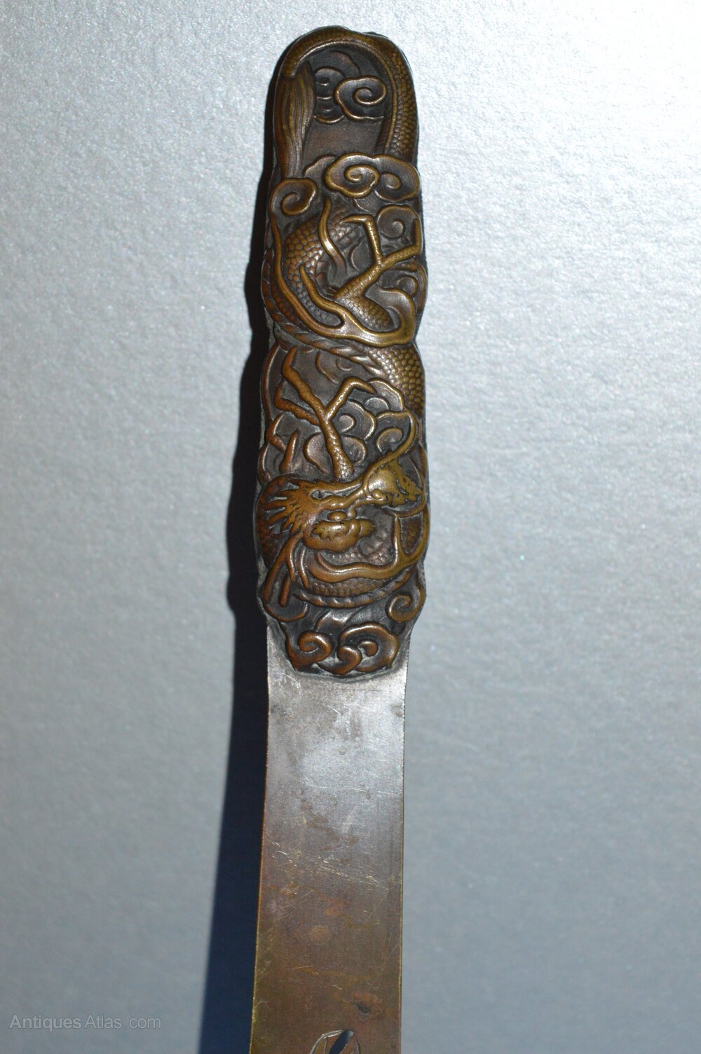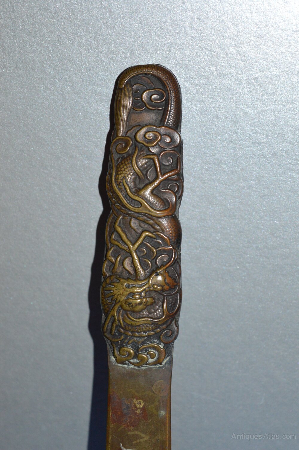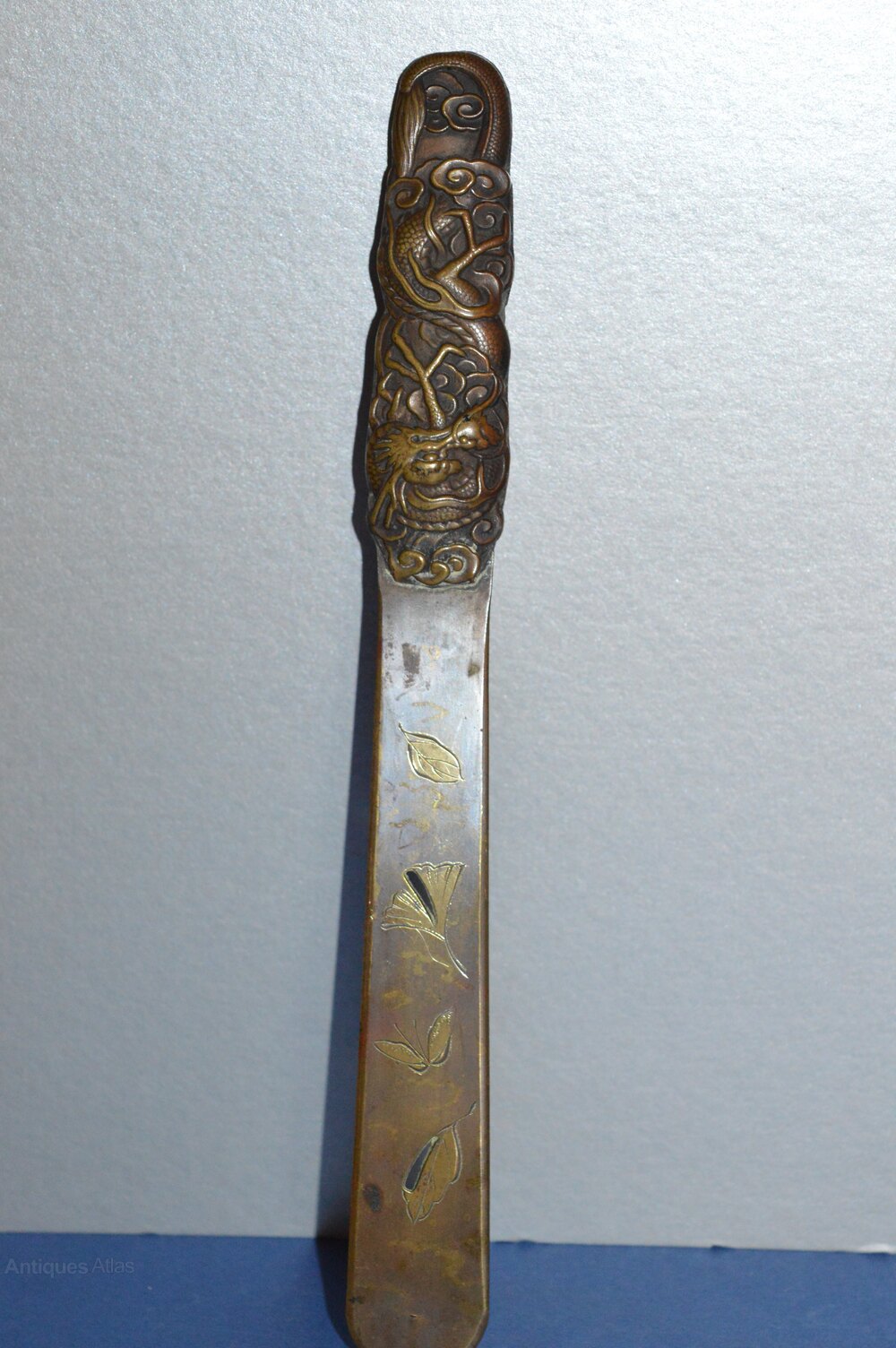 Fine quality late 19th century Japanese bronze letter opener, c1880.The handle is profusely decorated on both sides with a dragon motif, and the blade has leaf, butterfly and foliage decoration. There are 2 symmetrical slits cut into the blade to highlight the decoration. Overall condition is good and the bronze has taken on lovely colour following many years of handling and use. Please refer to the detailed photographs and feel free to contact me if you would like to view the item or have any questions.Price includes FREE UK delivery, please contact me regarding international shipping.