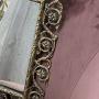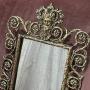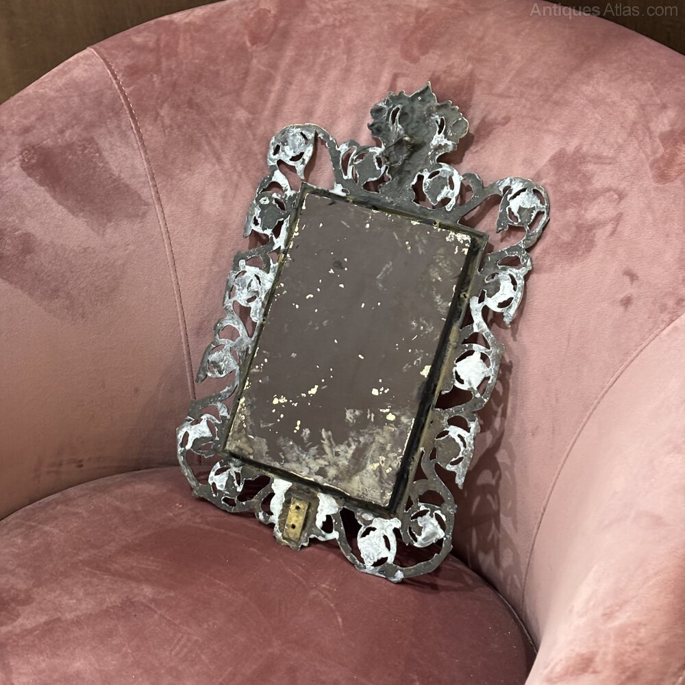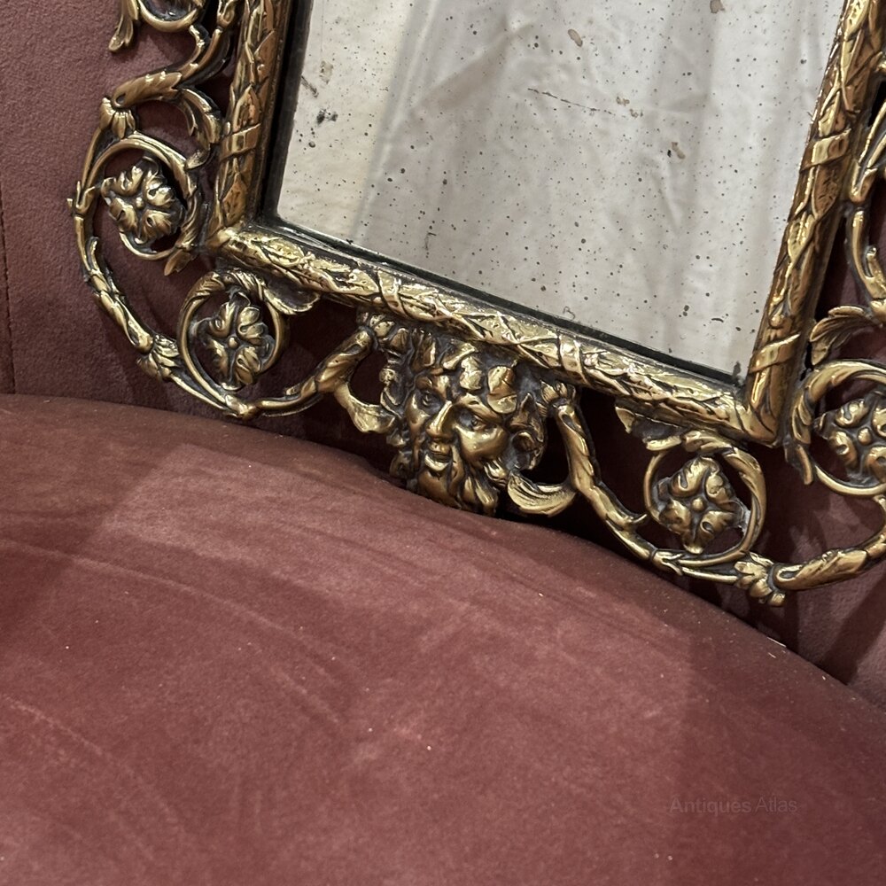 An ornate and visually striking antique wall mirror from the Victorian period . Crafted with a richly detailed cast brass frame the surround features scrolling leaves and rose medallions. A distinctive foliate mask at both the top and base, likely referencing classical mythology or the Green Man motif, symbolising nature and rebirth.The frame exhibits a beautifully aged patina and retains its original mirror plate, which shows attractive signs of foxing consistent with its age. The backplate appears to be untouched, with traces of old paint and a single integral mounting point.