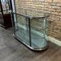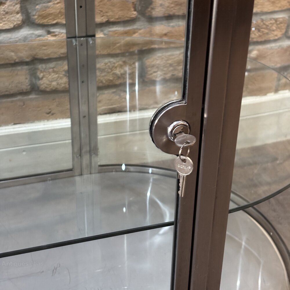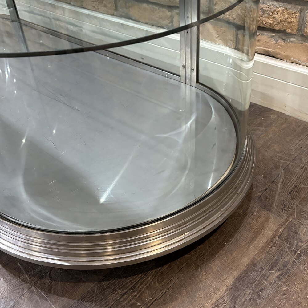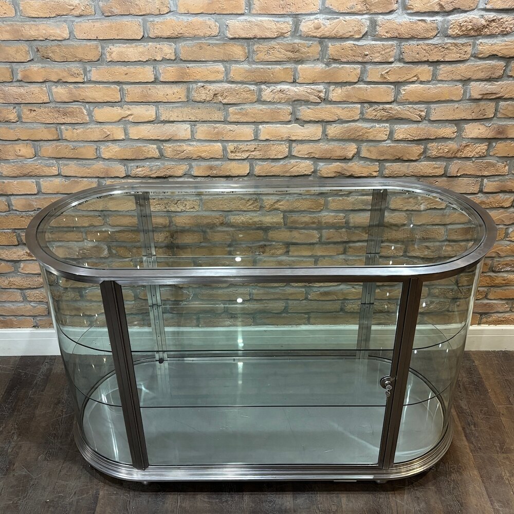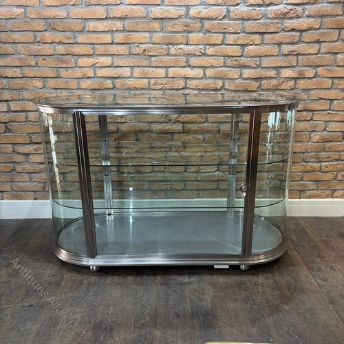 A stylish curved glass and aluminium display counter dating from the 1930s.This elegant cabinet features bowed glass sides, supported by a polished aluminium frame with art deco lines. Fitted with a lockable glass door and internal glass shelving, it provides excellent visibility for display.