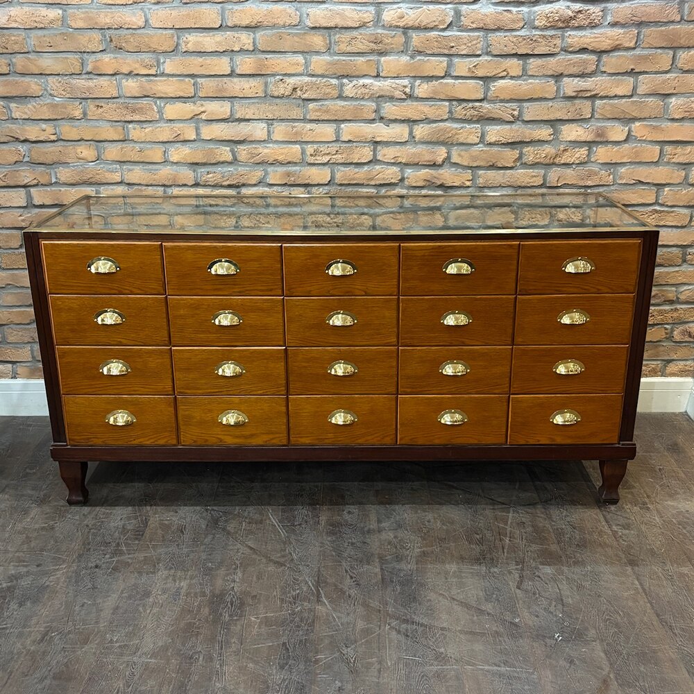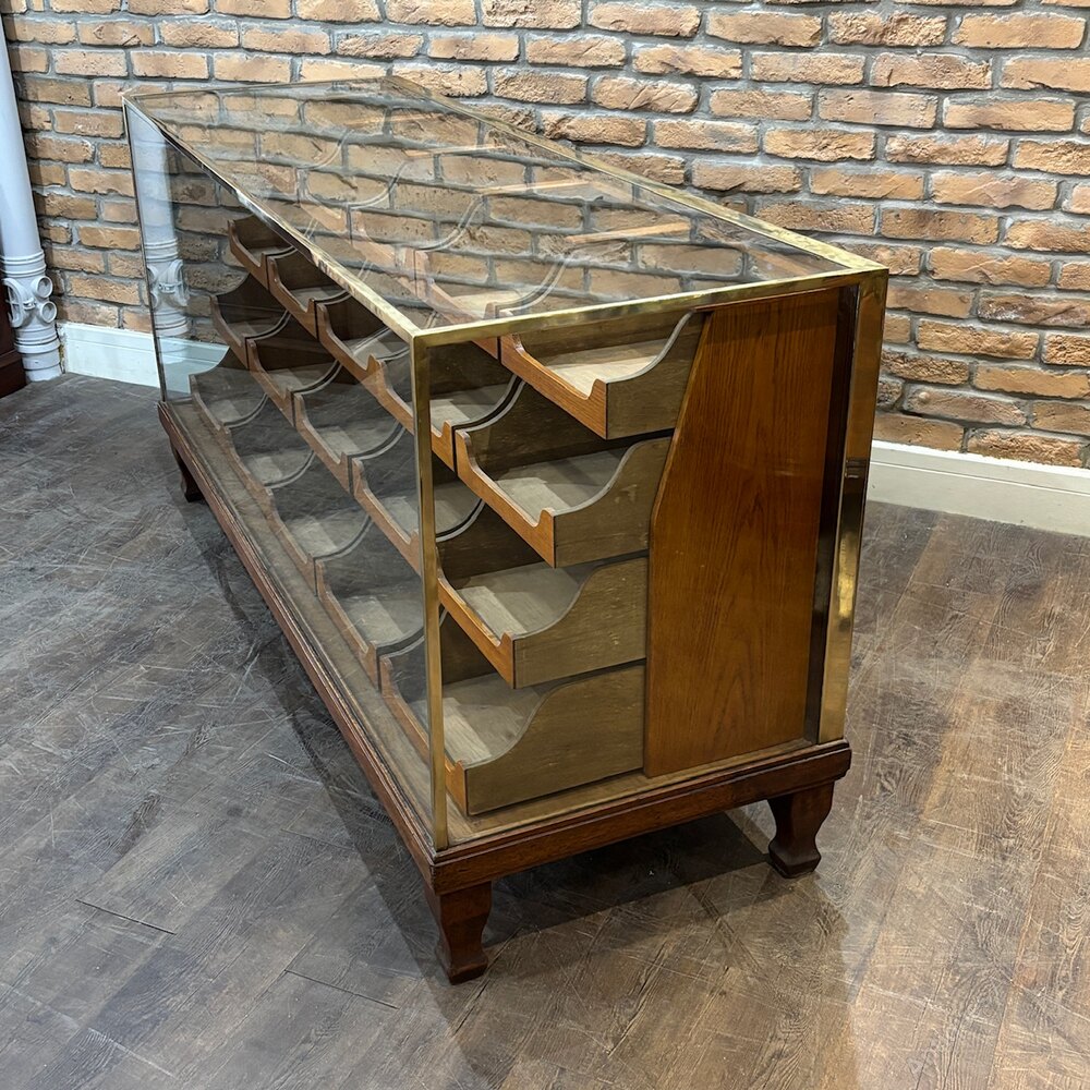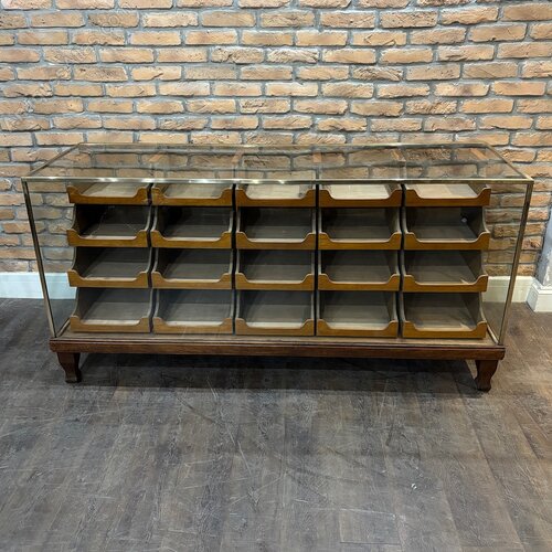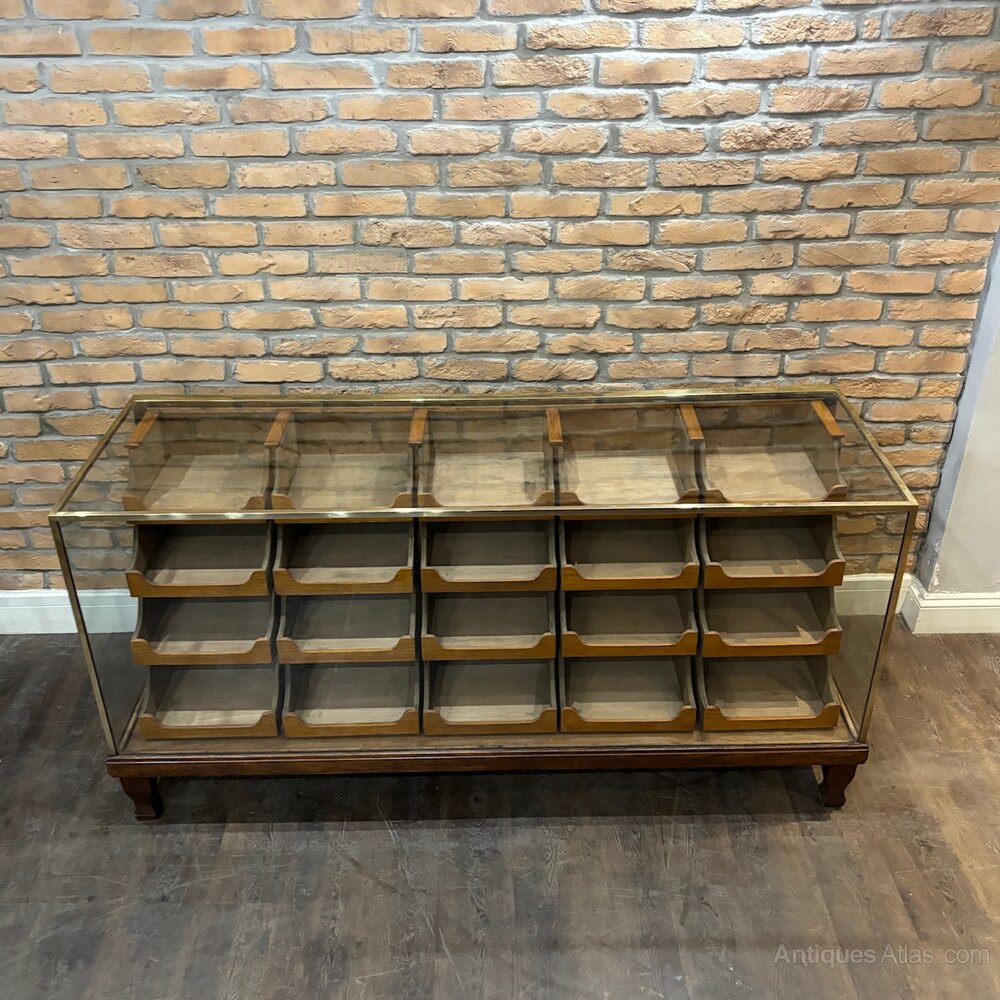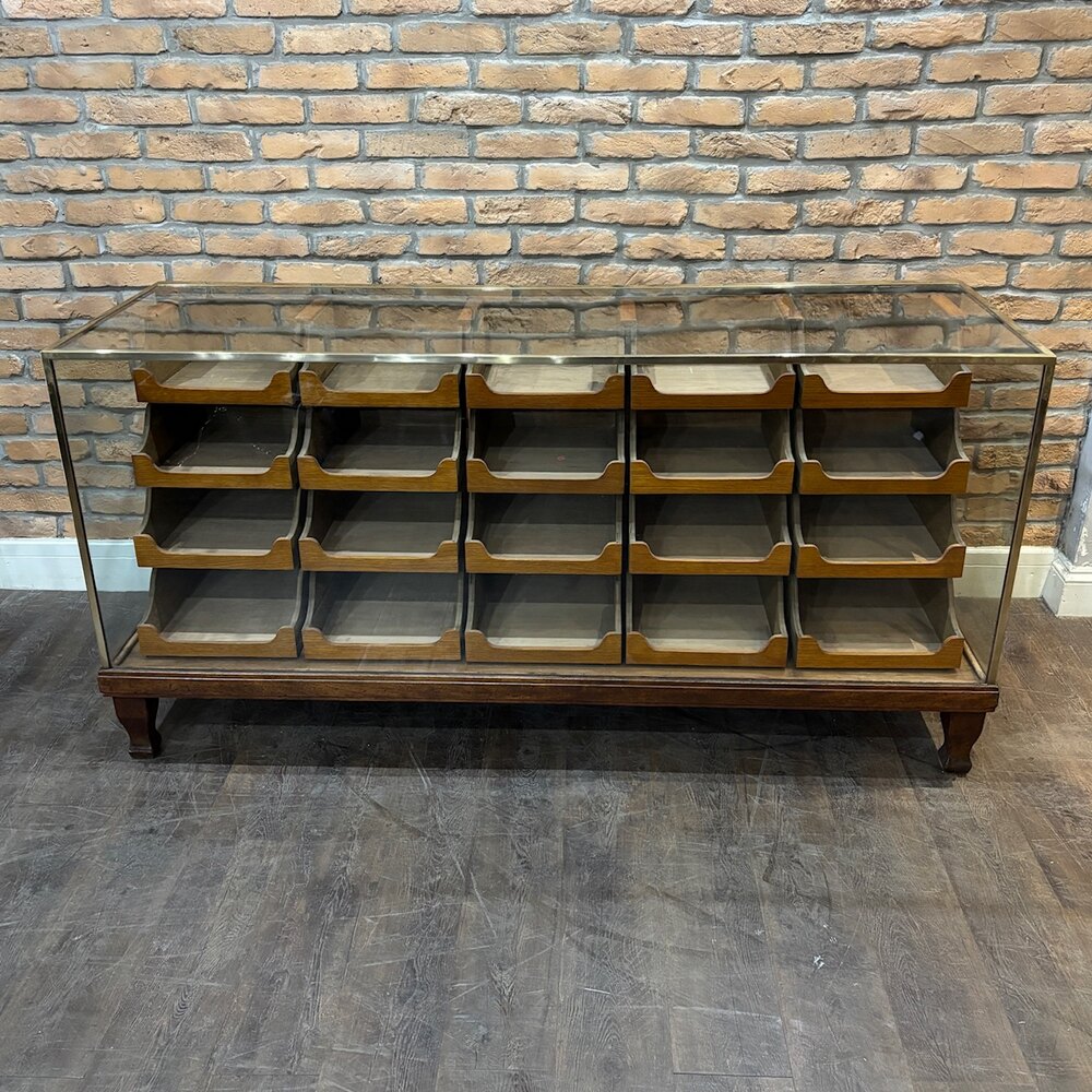 A lovely brass and mahogany haberdashery counter dating from the 1920s, refurbished for modern use while retaining its original structure and materials.The counter features twenty display drawers framed in brass and set on a solid mahogany base with shaped feet. The interior fittings and staggered drawers are crafted from oak. To the reverse, a full bank of drawers fitted with polished brass cup handles provides generous storage.