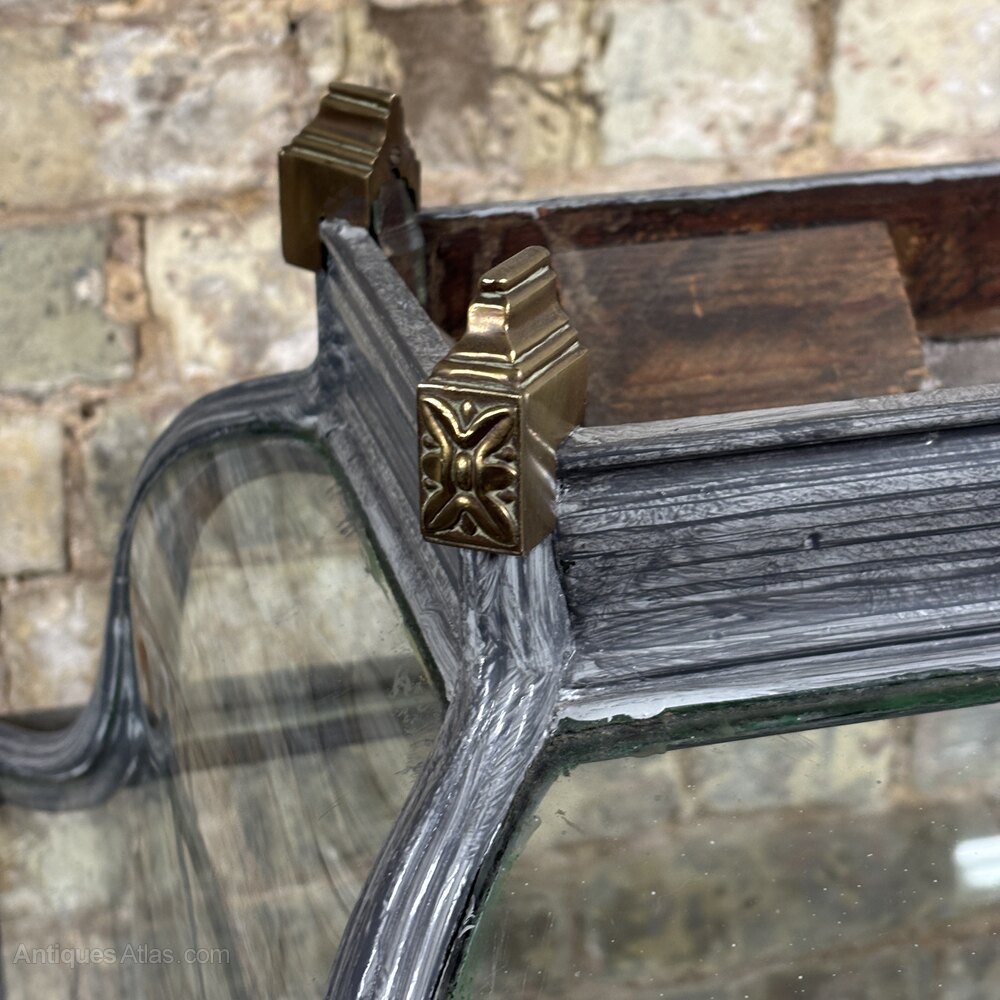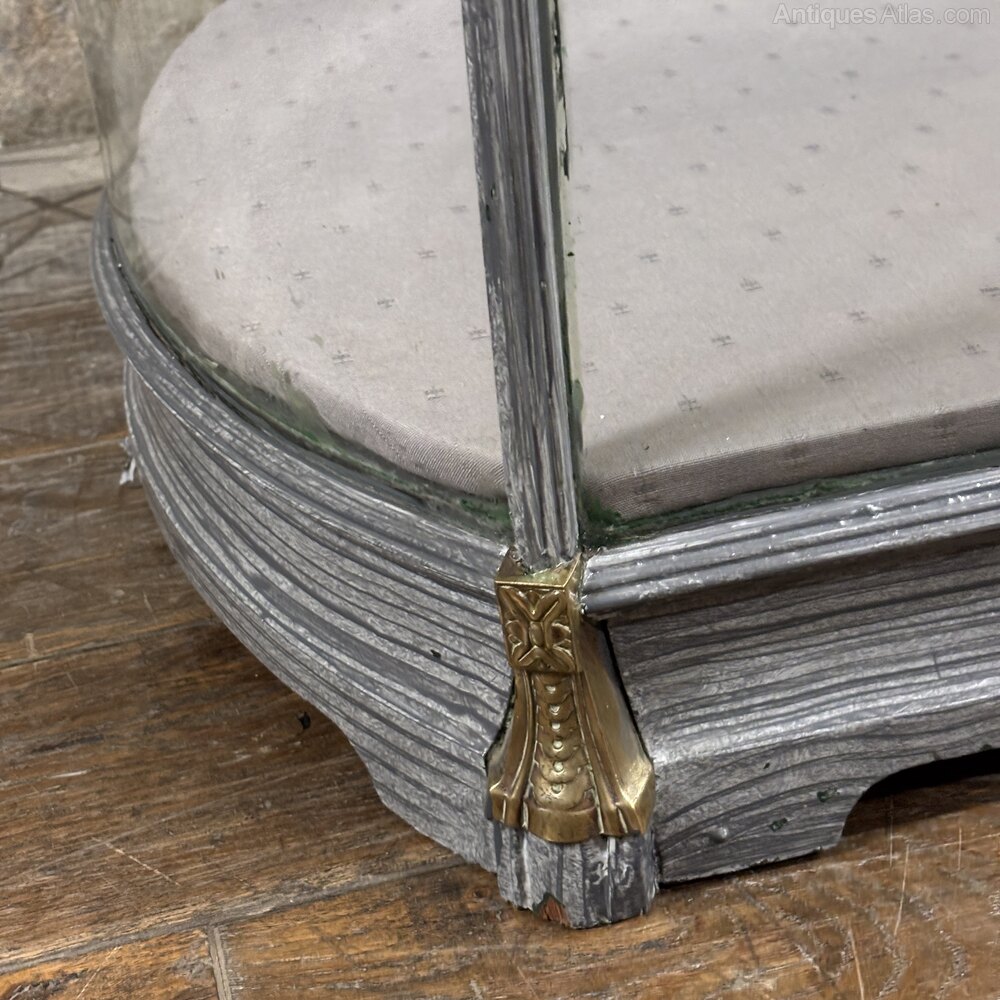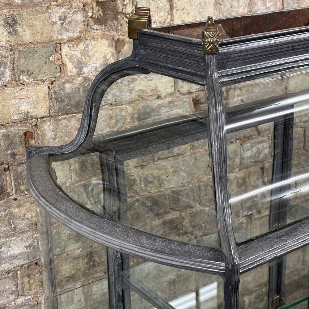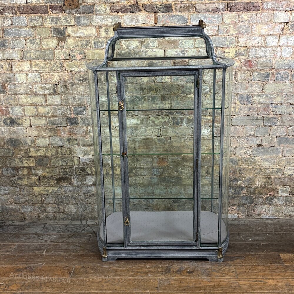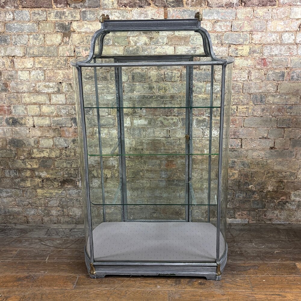 An elegant curved glass display cabinet dating from the early 20th century. The cabinet features a painted wood frame with its curved glass panels to the front and sides, three adjustable glass shelves, and a front-opening door fitted with a brass ring catch. Originally used in a fine boutique, this display case embodies the refined aesthetic of interwar French design. Perfect for showcasing treasured objects or as a feature piece in a contemporary interior.H: 157 W: 90 D: 52 cm