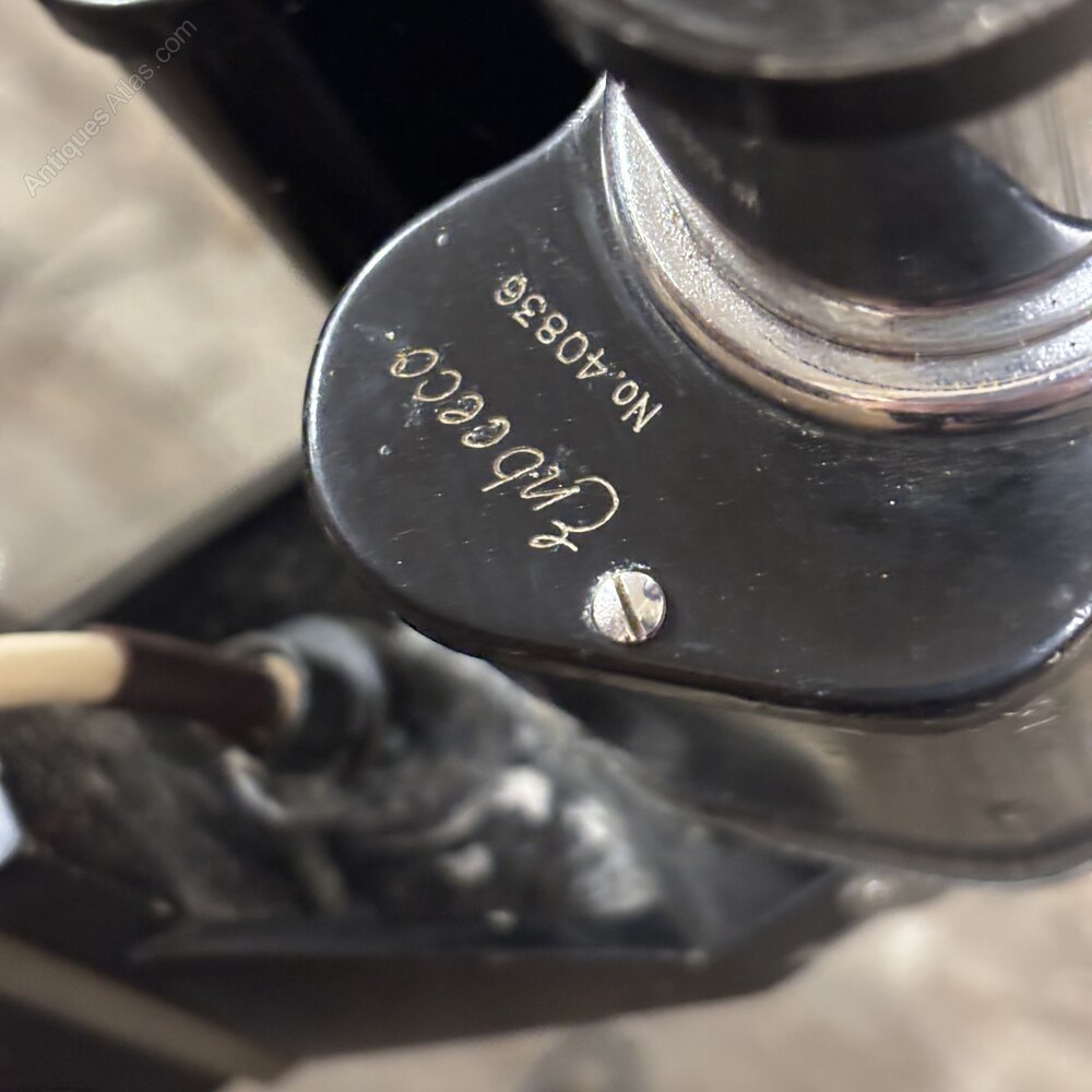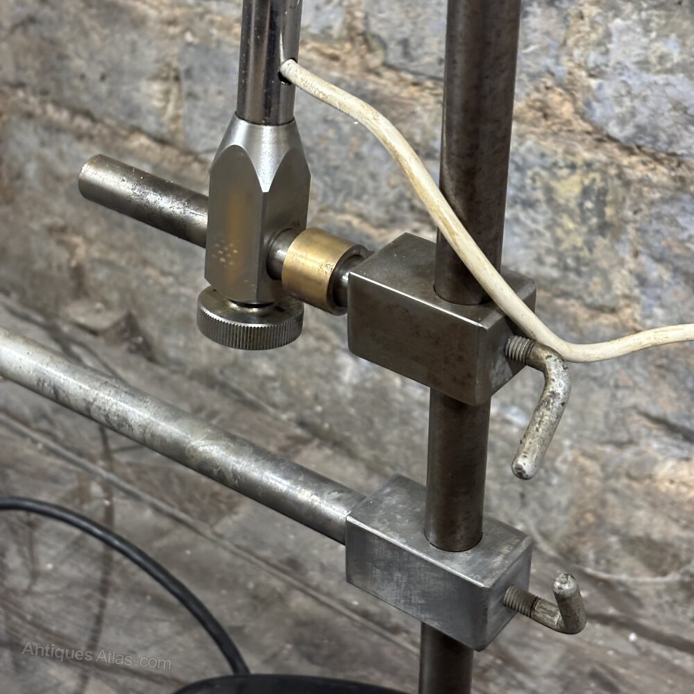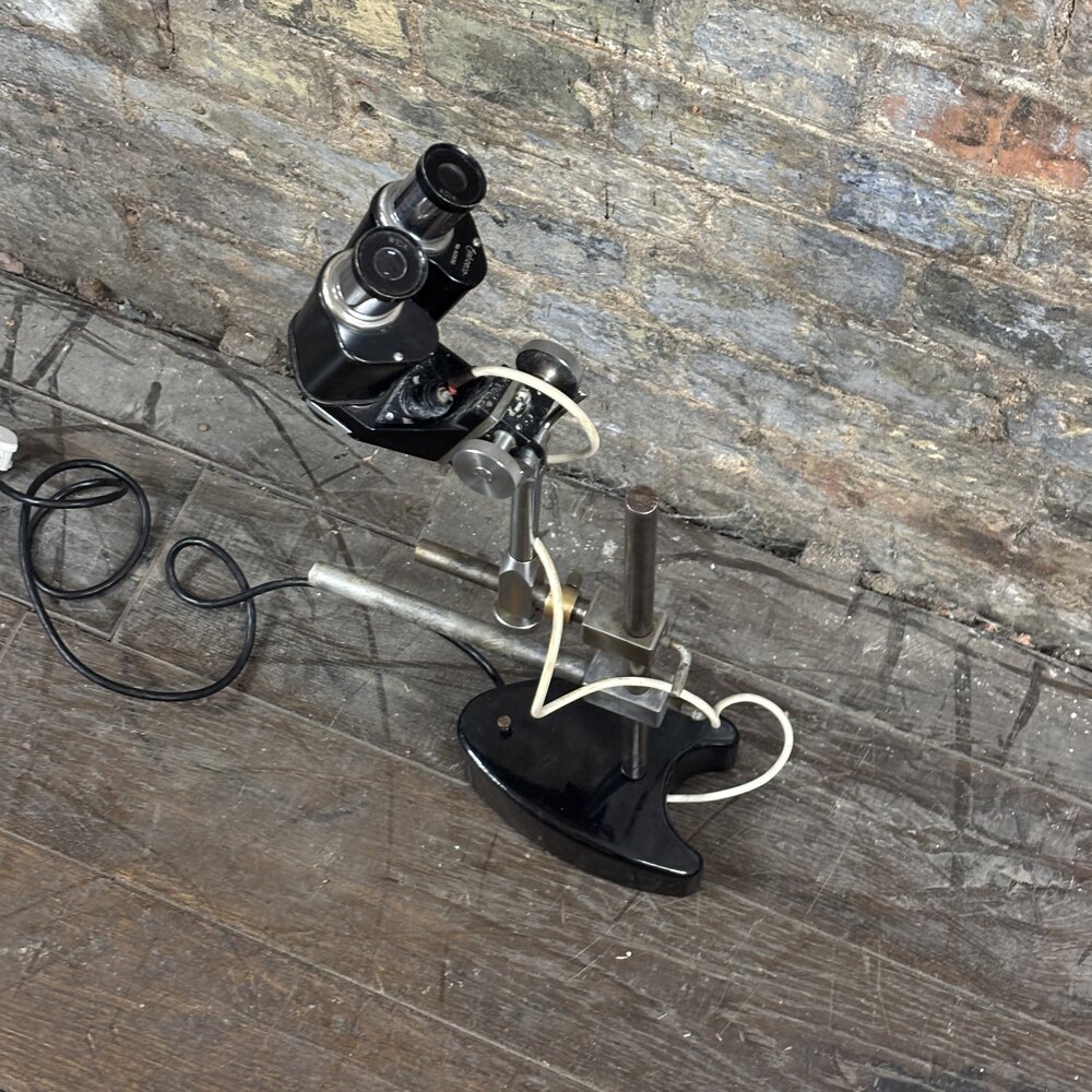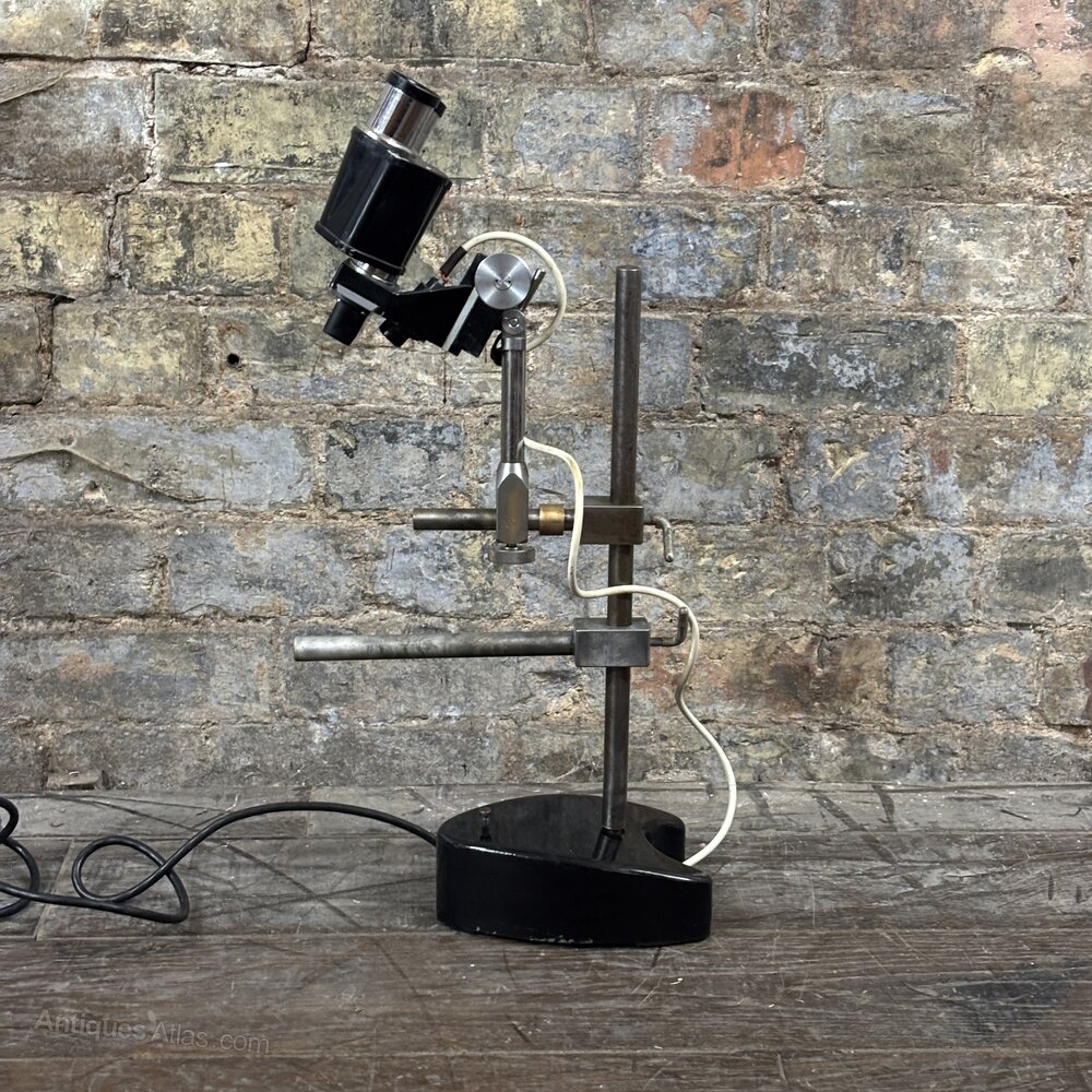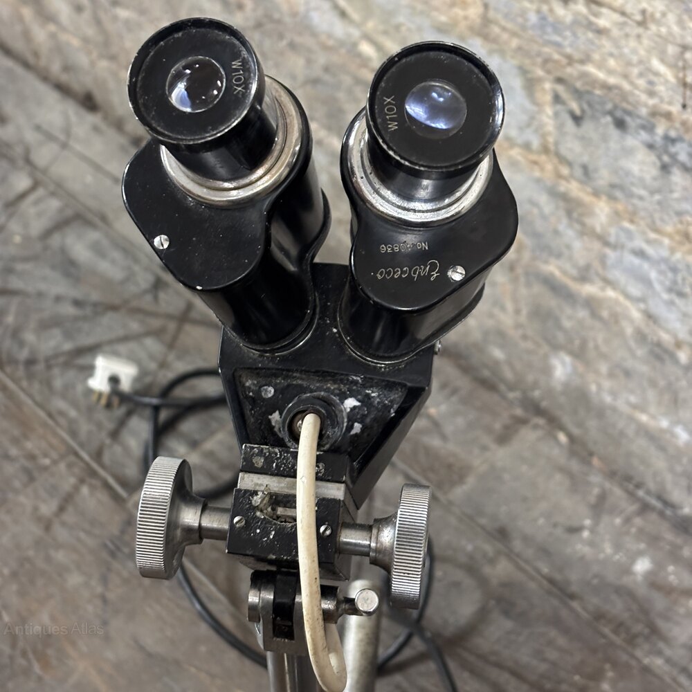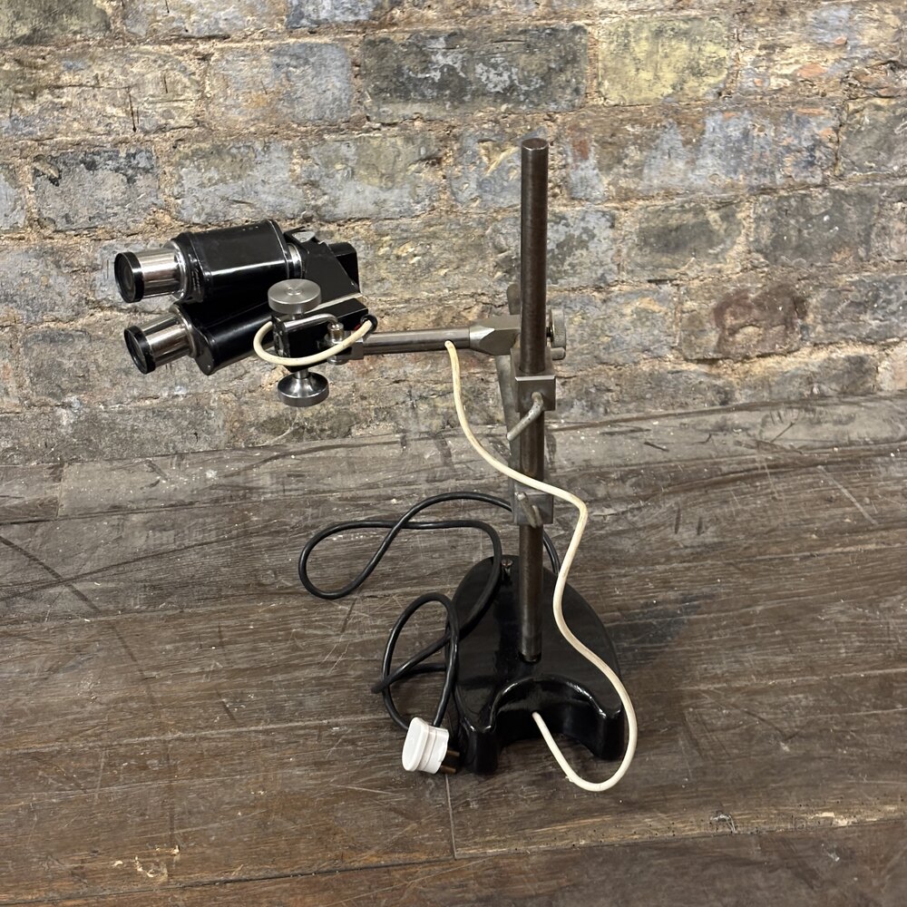 This Enbeeco binocular inspection microscope features a robust adjustable steel stand and cast base, with twin 10x eyepieces marked Enbeeco No. 40836. The piece is great example of precision engineering combined with an industrial aesthetic. The microscope’s articulated arm and adjustable height allow for versatile positioning, while the polished metal fittings and black enamel finish retain their original patina and character. It remains wired with its original electrical fittings.A fascinating addition to any collection of vintage laboratory instruments, this piece would also serve beautifully as an industrial decorative object or conversation piece in a modern interior.