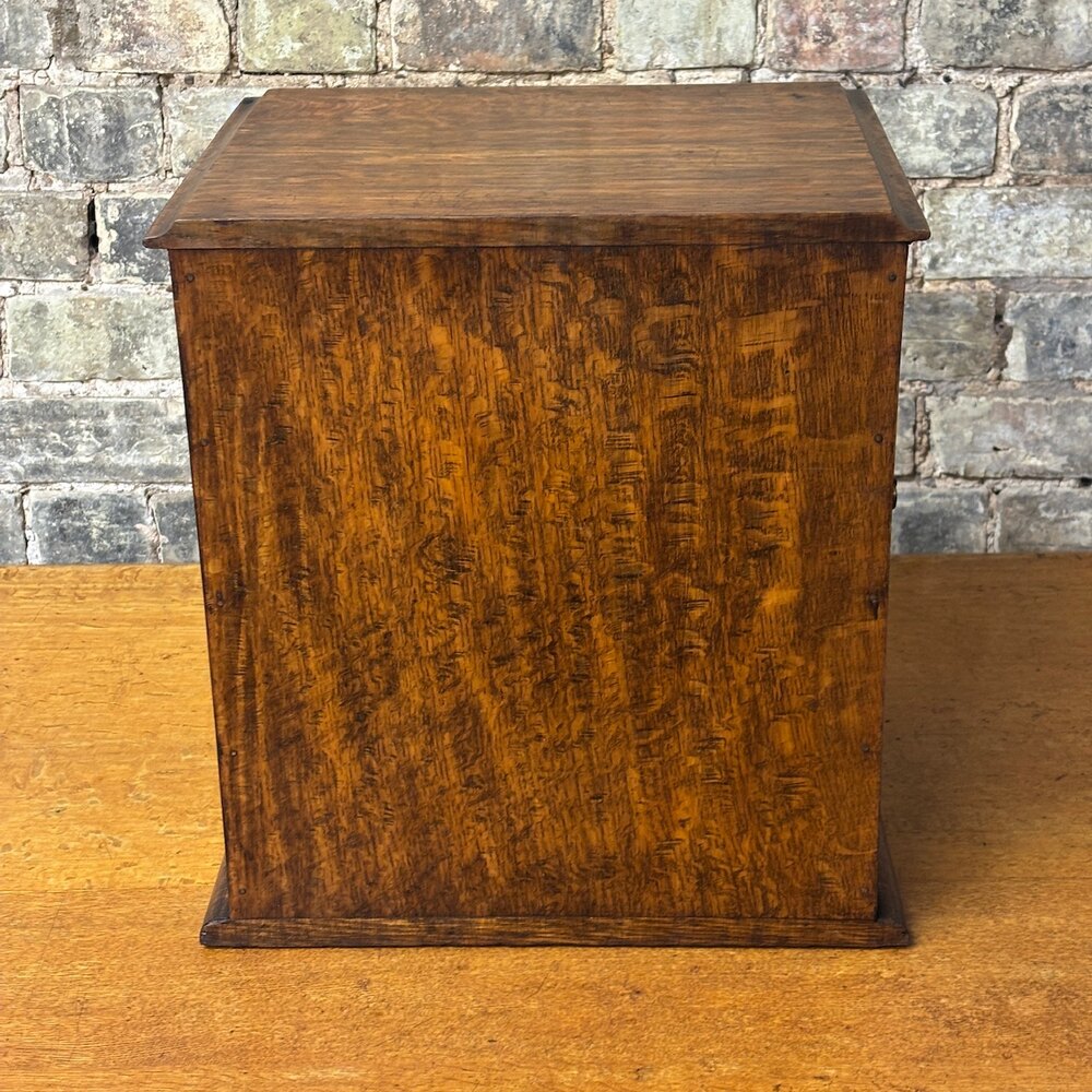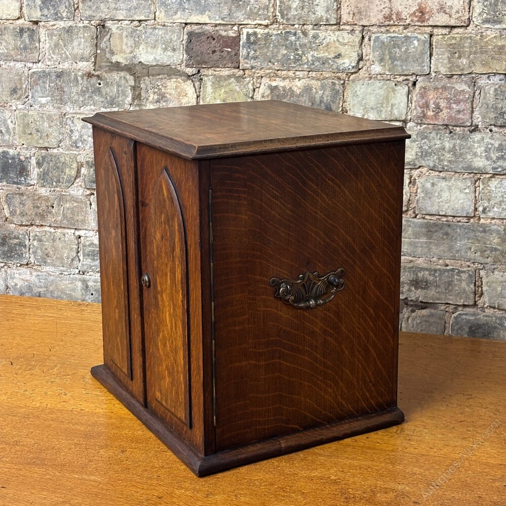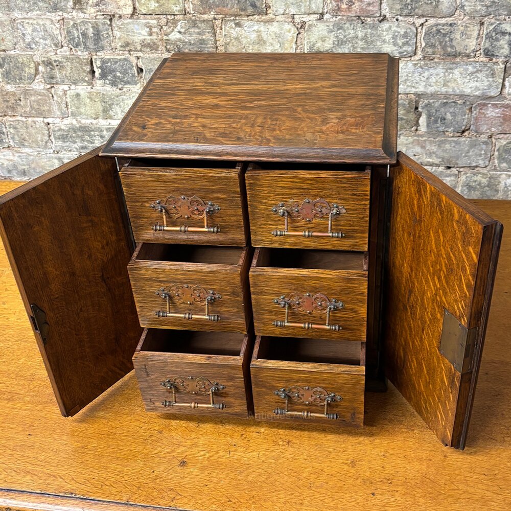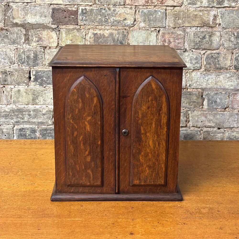 We have this lovely petite antique oak table cabinet, likely British and dating to the late 19th century.The cabinet is beautifully made in solid oak, with a rich, warm tone and striking grain throughout. The front features a pair of panelled doors with Gothic-style arched detailing, opening to reveal an arrangement of six small drawers. b