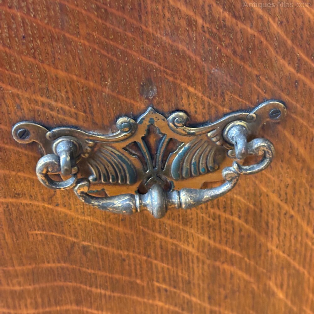 Each drawer is fitted with decorative brass handles, adding a nice period touch and complementing the overall character of the piece. The proportions make it both practical and highly decorative, ideal for organising smaller items.