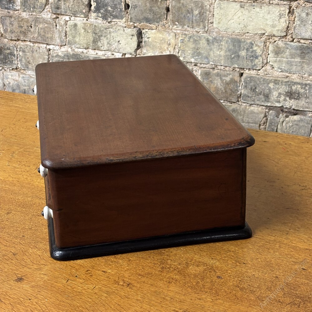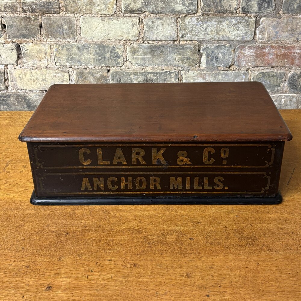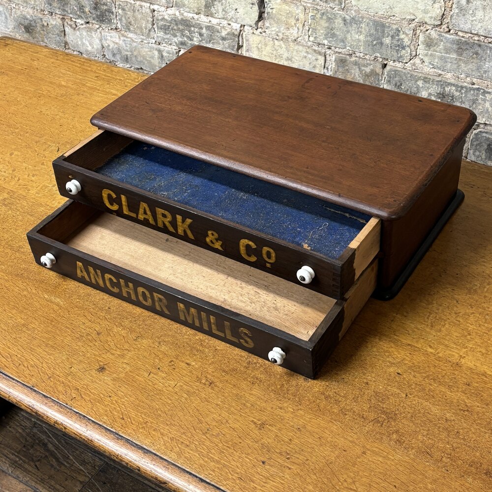 Made from solid mahogany this cabinet features two shallow pine drawers, each with original white ceramic knobs and hand-painted gilt lettering reading “Clark & Co” and “Anchor Mills.” These names relate to the well-known thread manufacturer J. & J. Clark, whose Anchor brand was widely used in haberdashery shops during the late 19th and early 20th centuries.The drawers retain their original interiors, showing honest wear from use, while the exterior has developed a rich, warm patina. The hand-painted signage remains beautifully visible, adding strong decorative and historical appeal.