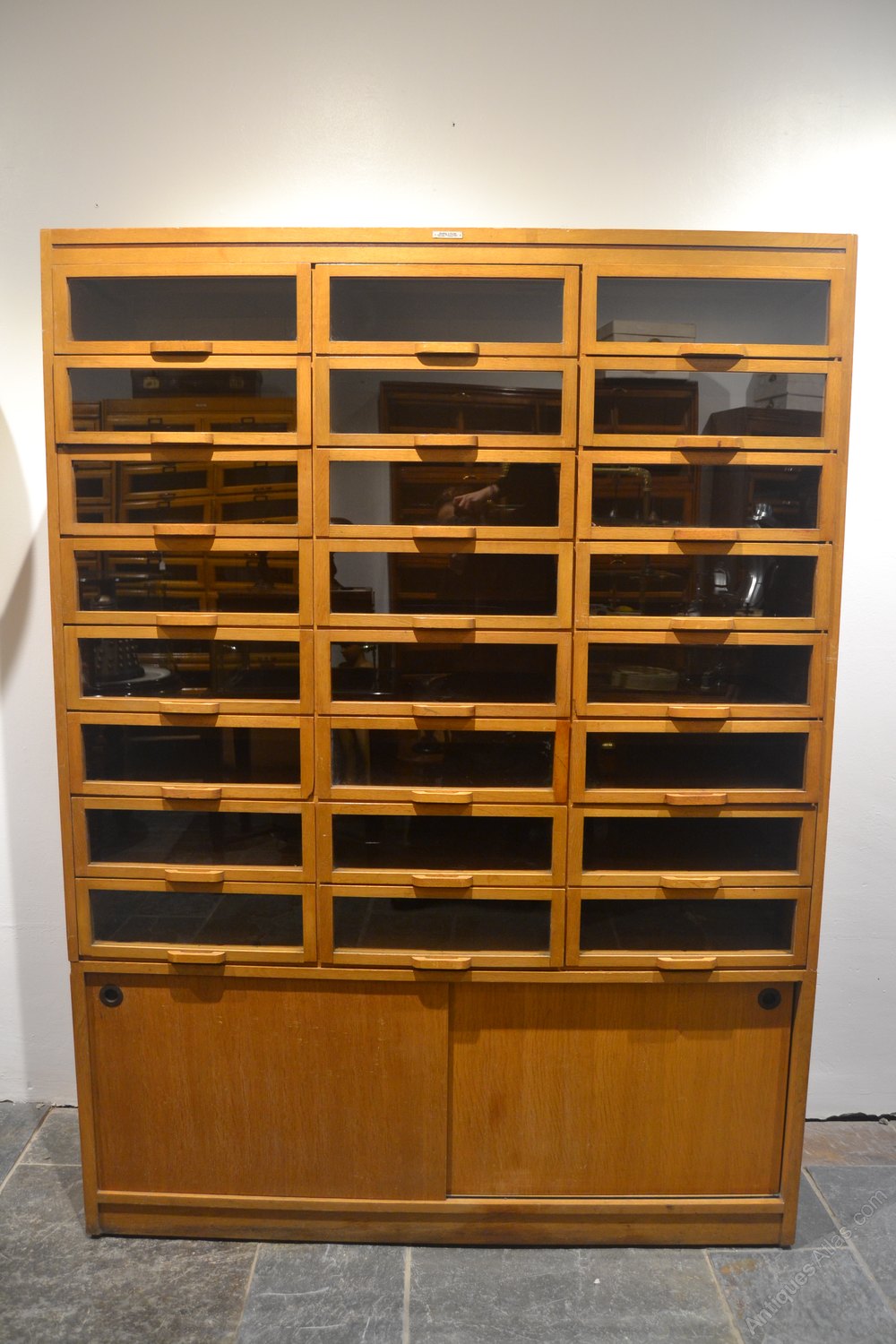 1950s oak haberdashery cabinet - in good original condition. Has three columns worth of storage with sliding door storage below.W: 148cm (58.3")H: 200cm (78.7")D: 50cm (19.7")