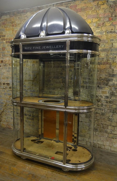 These are unbelievable chrome art deco display cabinets. This is a once-in-a-lifetime opportunity to purchase these cabinets - they were originally made for the Ritz hotel and would be gorgeous for any jewellery shop, home or gallery. They have bow ended glass on both sides and say on the front 'Ritz Fine Jewellery". This cabinet also has lights inside, as well as 2 shelves on the top and 2 on the bottom. We're able to rent all of our display items as well as sell, so if you want to hear more, talk to us to arrange a rental.W: 200cm (78.7")H: 200cm (78.7")D: 67cm (26.4")