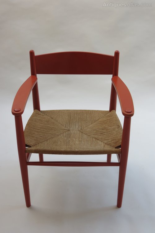 Vintage CH37 chair designed by Hans J Wegner and manufactured by Carl Hansen, Denmark.Retains the original coral lacquer. In good condition, with minimal signs of loss to the lacquer finish.