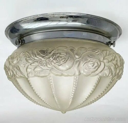 Beautiful 1930s English Art Deco ceiling light in molded pressed glass. The globe is decorated with stylized embossed rose patterns developed on the skirt of the shade, tinted in sepia satin glass. The chrome gallery is plated brass with three fastening screws. Opening at the neck 7.8 cm, bayonet socket B 22. This lamp could also work well as a table lamp, perhaps for a bedside table or desk lamp.The shade sits within a chrome gallery. A good size that would work perfectly for entryways, hallways or medium sized room.