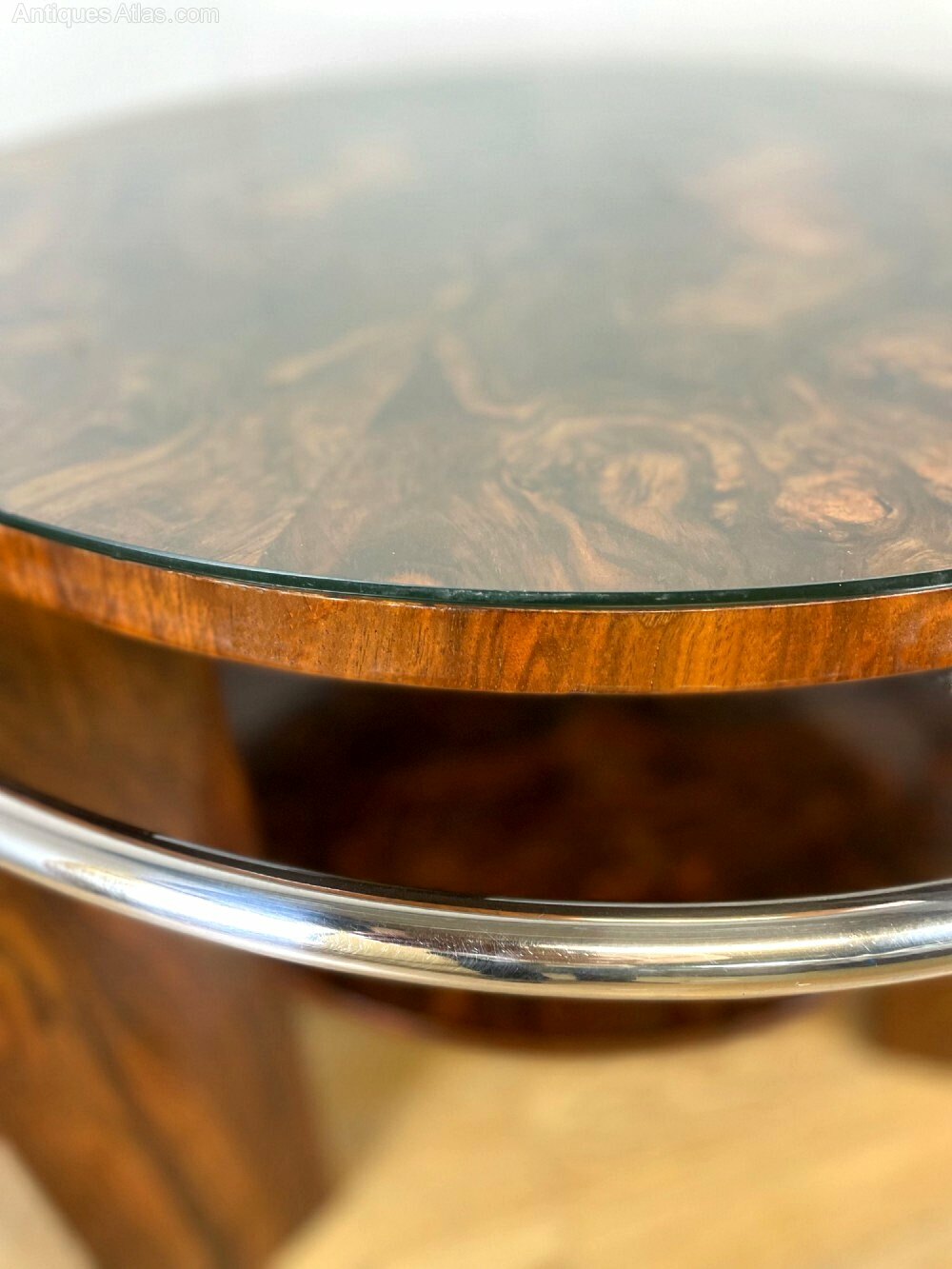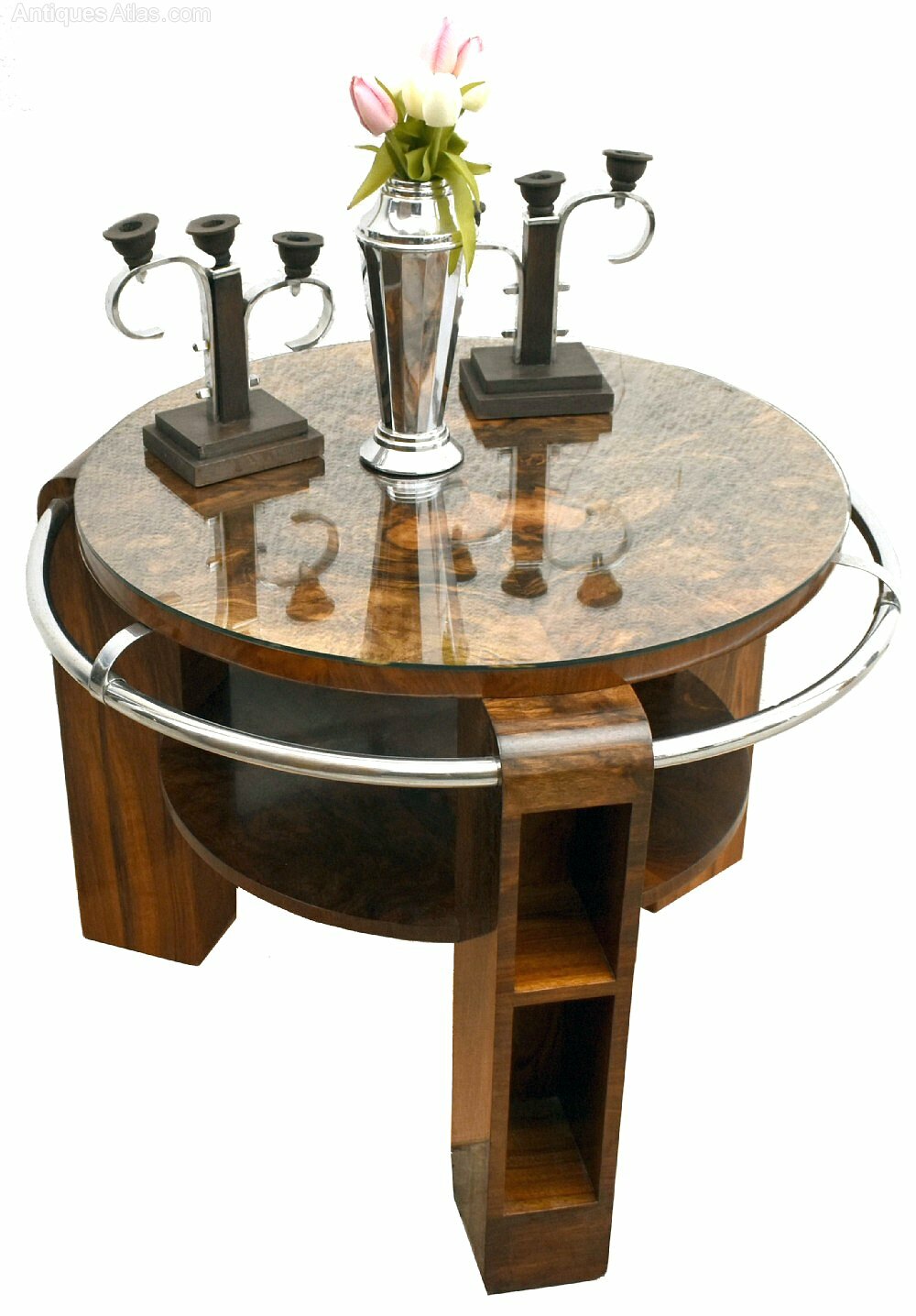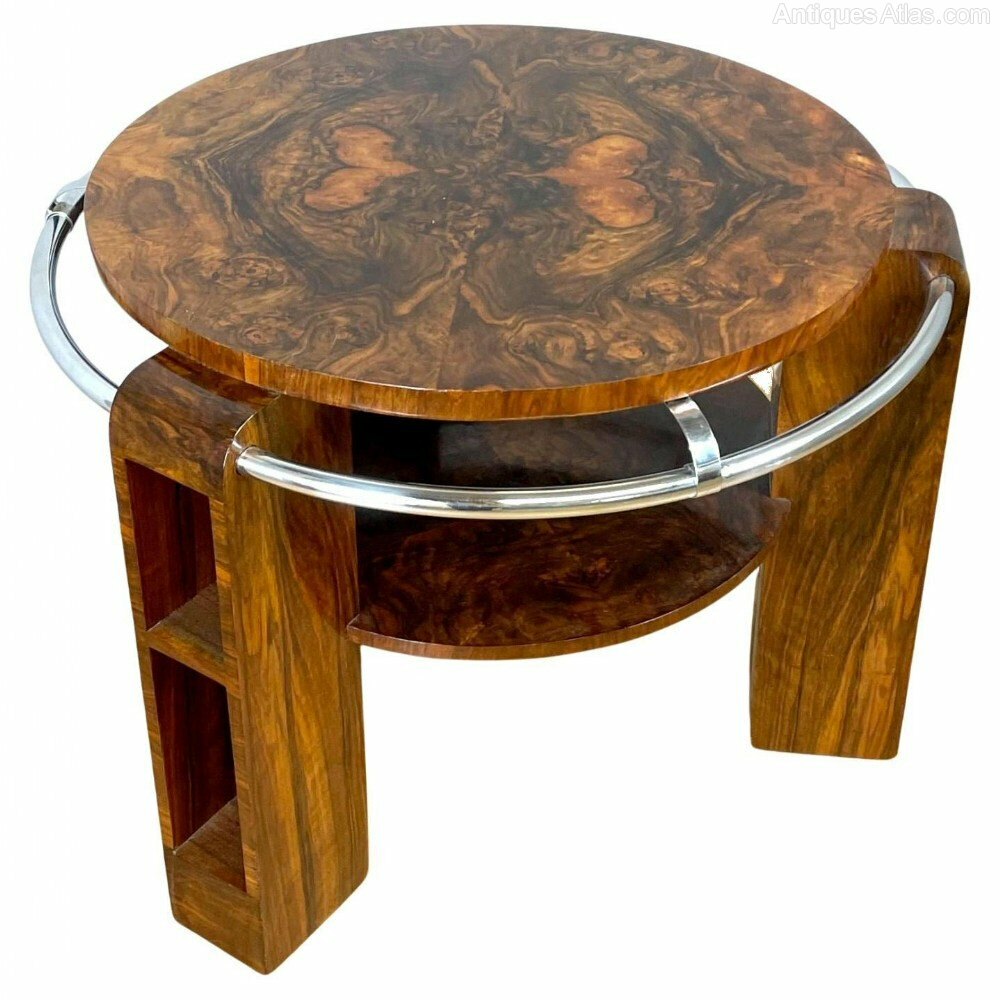 For your consideration is this rare opportunity to acquire a highly styled Art Deco circular occasional/ centre table dating to the 1930's and believed to be English in origin. A chrome tubular outer rail encircles the table top and is in unusually good condition being completely free from both pitting and tarnishing. The are three large supporting legs which sit proud of the table with pigeon hole open shelves running down the length which offers storage opportunities or display area as does the second under tier. The whole piece has been fully and professionally restored and so comes to you in fabulous condition with no damage or defects to report. This particular shape is one of the more rare shapes and particularly hard to source, this being our only second ever example in 15 years. This table would not have been cheap in it's day and wasn't marketed for the masses but the decerning monied clientele who seek both kerb appeal and exceptional craftmanship. Totally original having come from one family from new and it's first time being offered to market, , we know the new owner will love it. The table is very heavy and of sturdy construction and will work well in many settings and uses for seating areas it will make perfect end, centre or coffee table.Height = 60 cm (24")