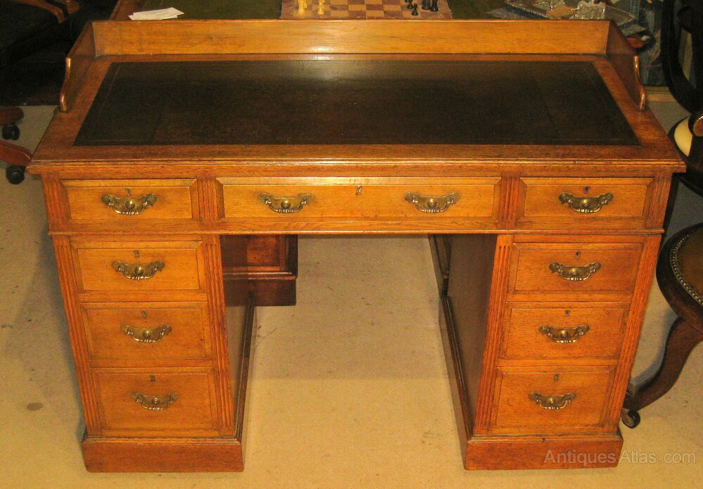 Victorian solid oak pedestal desk. The 9 drawers of a good, hand-cut, dovetailed construction with mahogany linings, the original brass plate handles and working locks. Currently with a back and side gallery and the original tan leather insert.Size 45 x 21 x 33 inches tall with a writing height of 30 inches (114 x 53 x 84 with writing height of 76 cm )