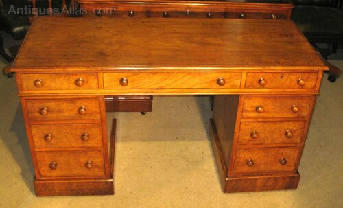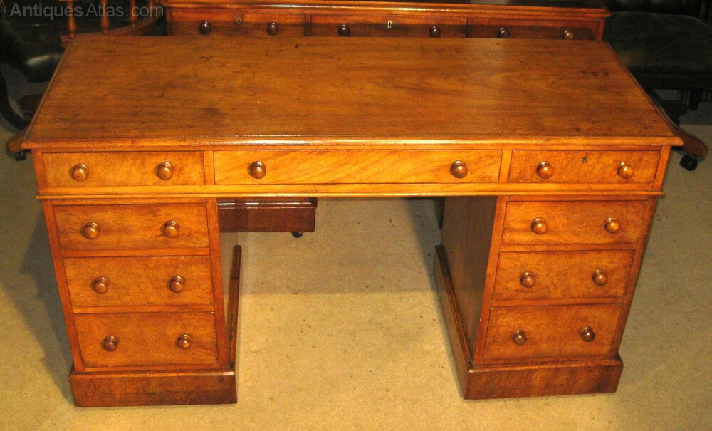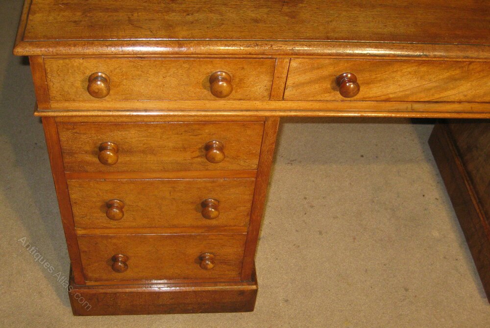Victorian faded mahogany pedestal desk. The nine drawers of a good, hand-cut, dovetailed construction with solid linings and the original turned knob handles. The solid top made without leather but could be leathered to suit or a leathered writing pad supplied.Size 54 x 21 x 31 inches tall (137 x 54 x 78 cm tall)
