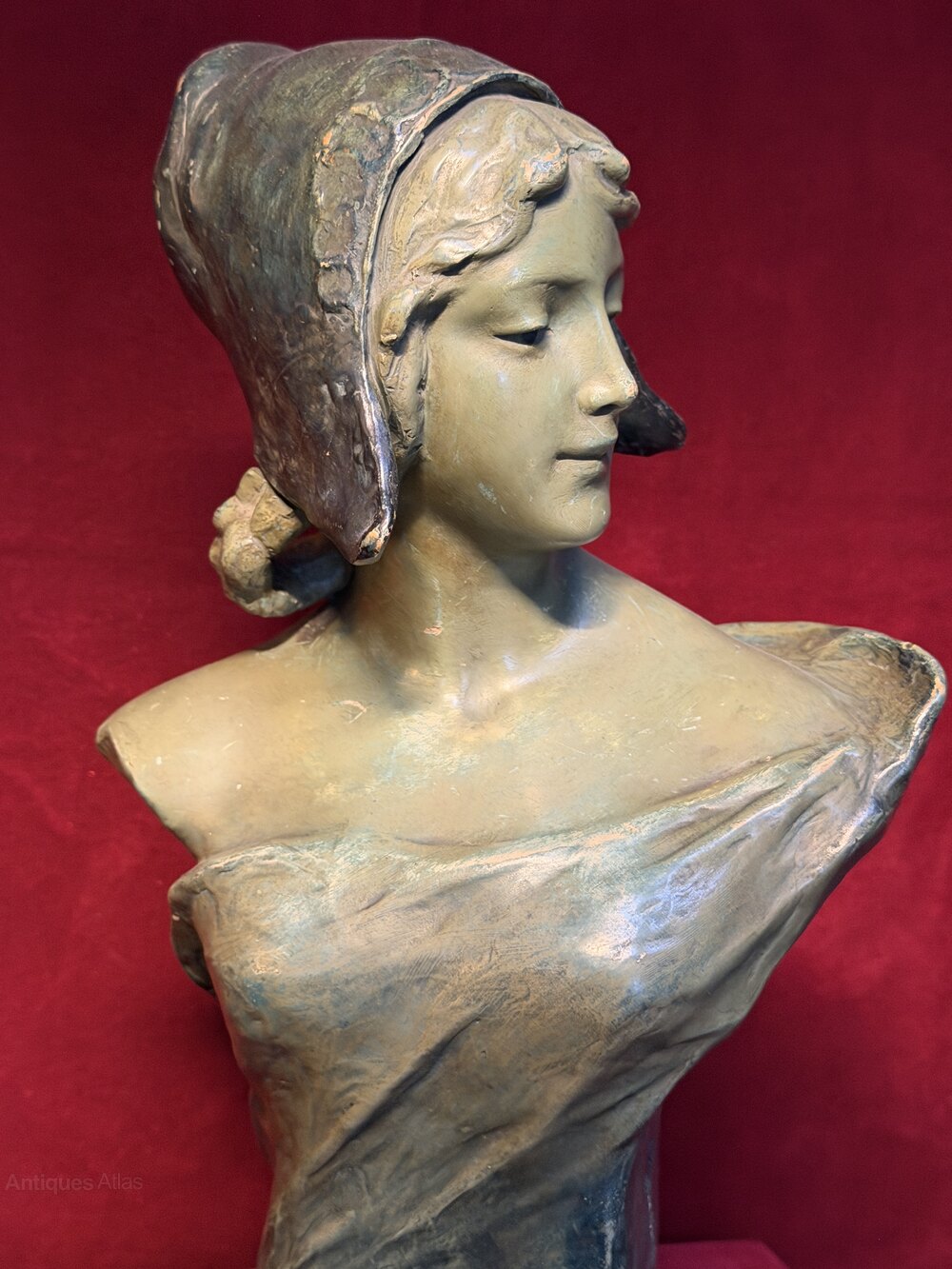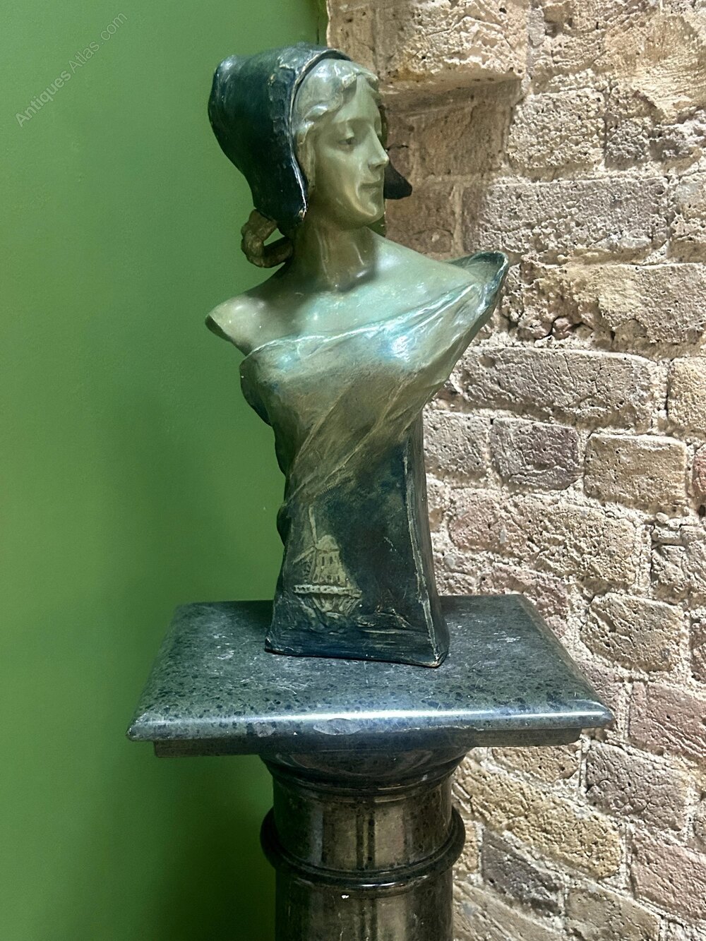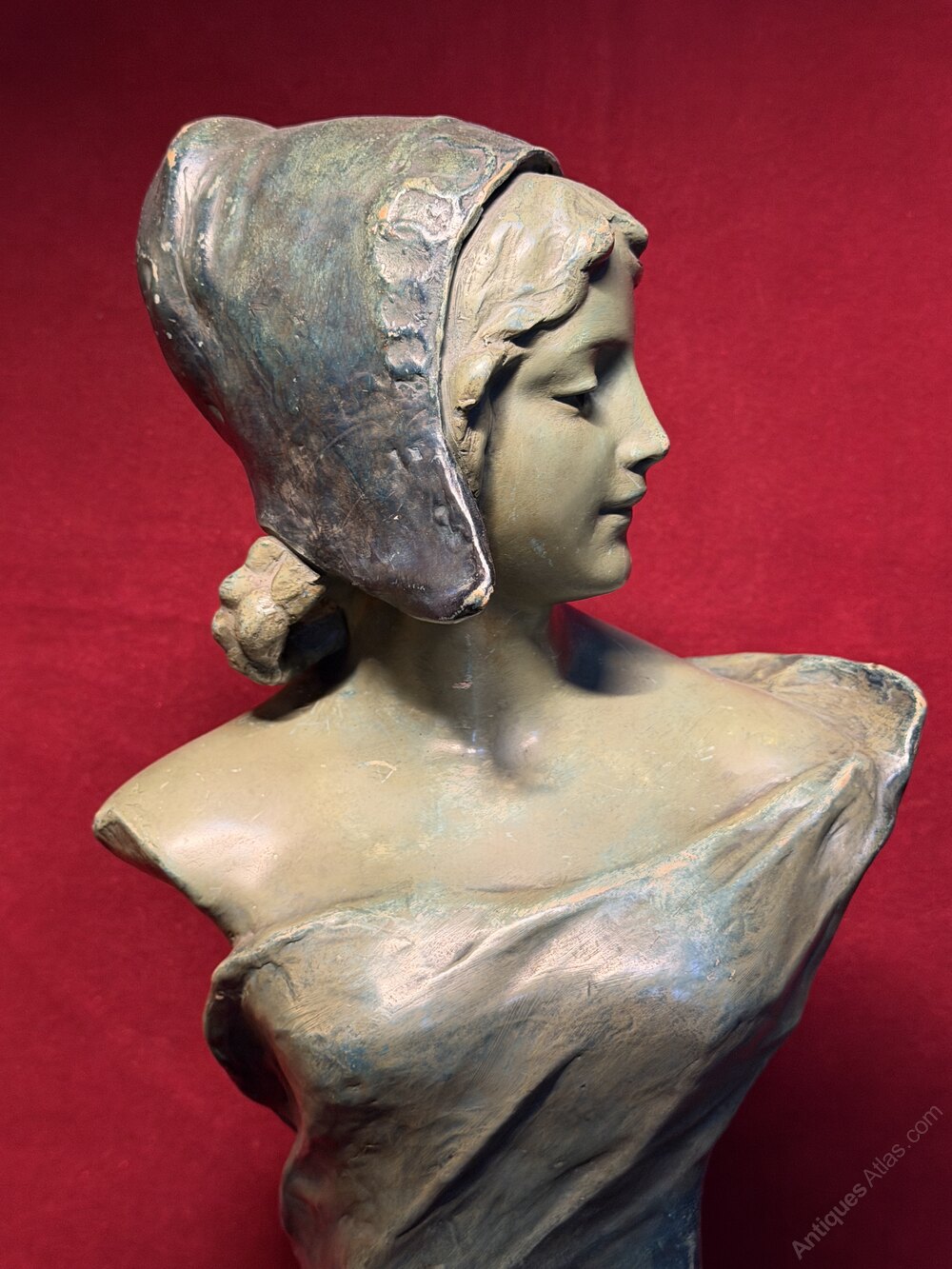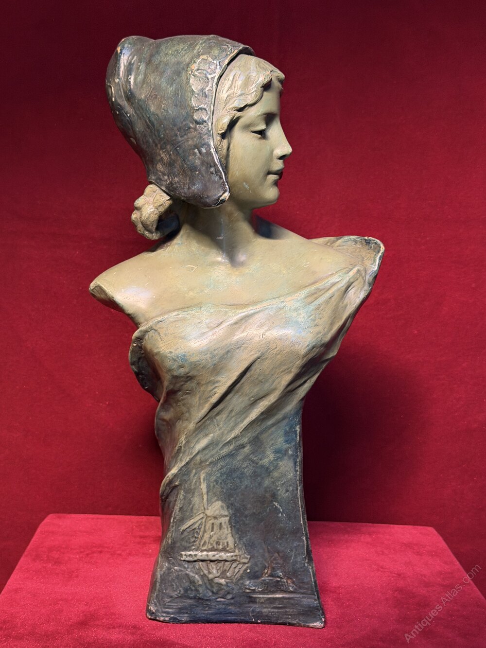 Antique Friedrich Goldscheider (1845-1897) Art Nouveau Polychrome Terracotta Bust of a Dutch Maiden C. 1900.Very attractive and decorative, with a beautiful green / blue colour and patina.