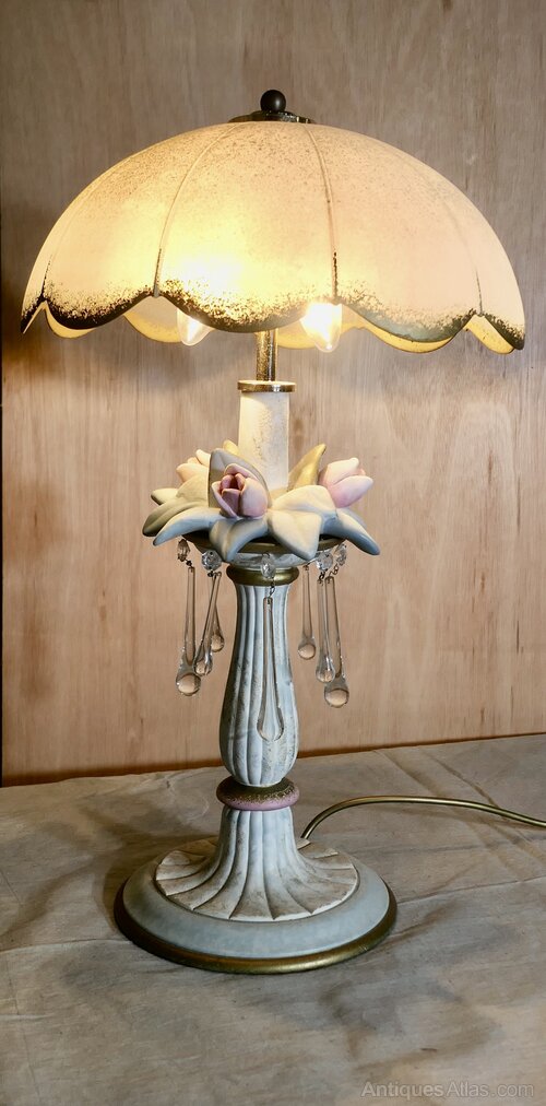 Vintage Italian Table Lamp in Porcelain and GlassMade in porcelain and glass with crystal lustres, this wonderful large lamp has a soft pastel palette, beautifully finished with gold dust decoration