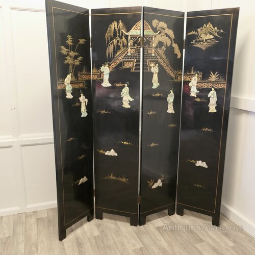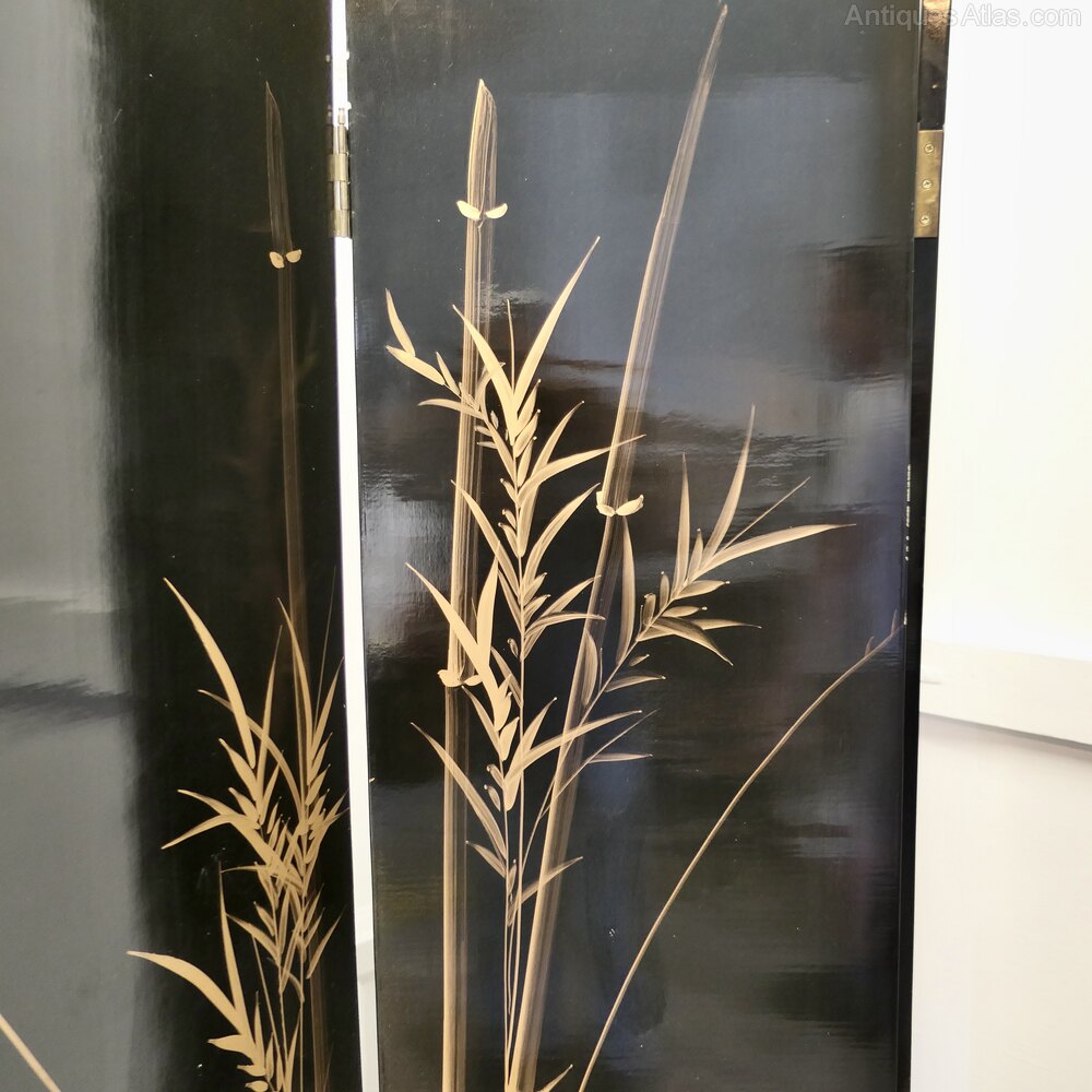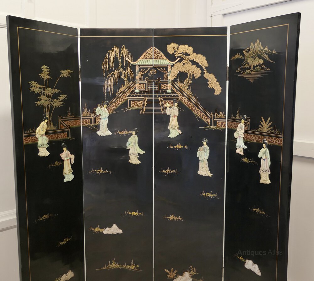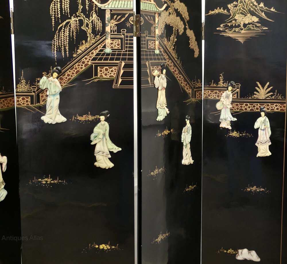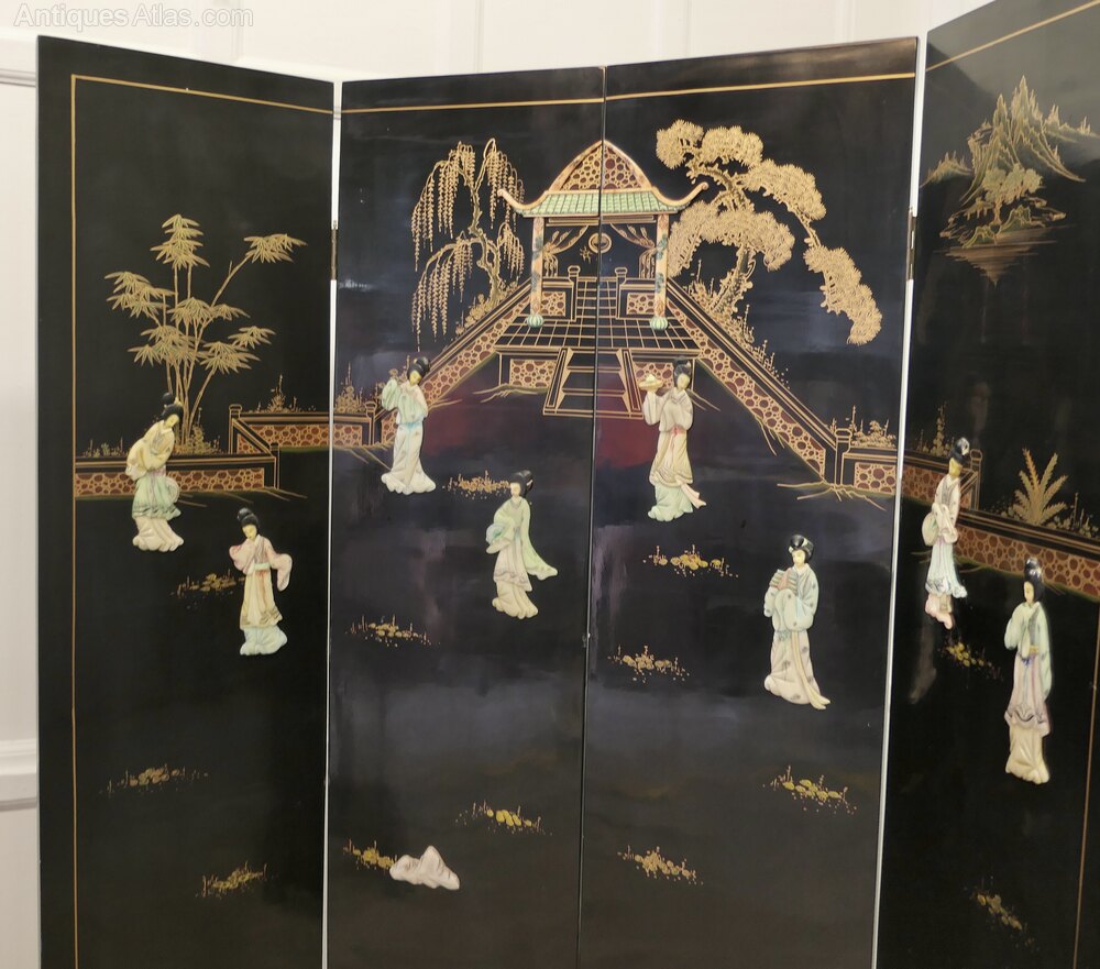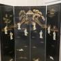 Japanese Etched Lacquer and Painted Folding ScreenThis impressive screen has four superbly decorated panels with a pagoda and Mount Fuji in the background and a montage of Geisha carrying food and musical instruments.