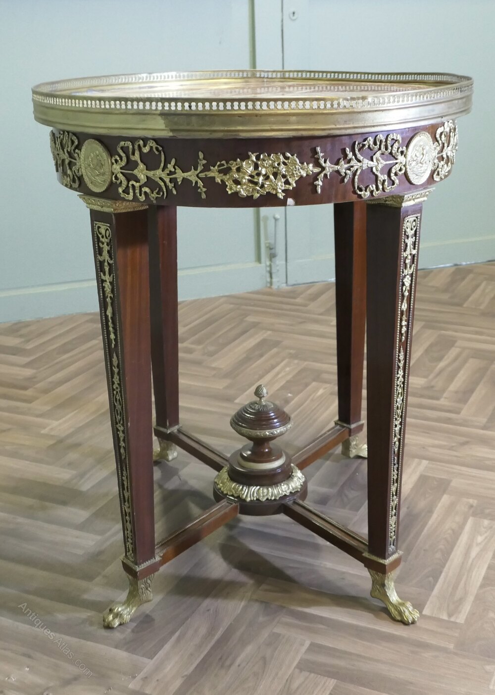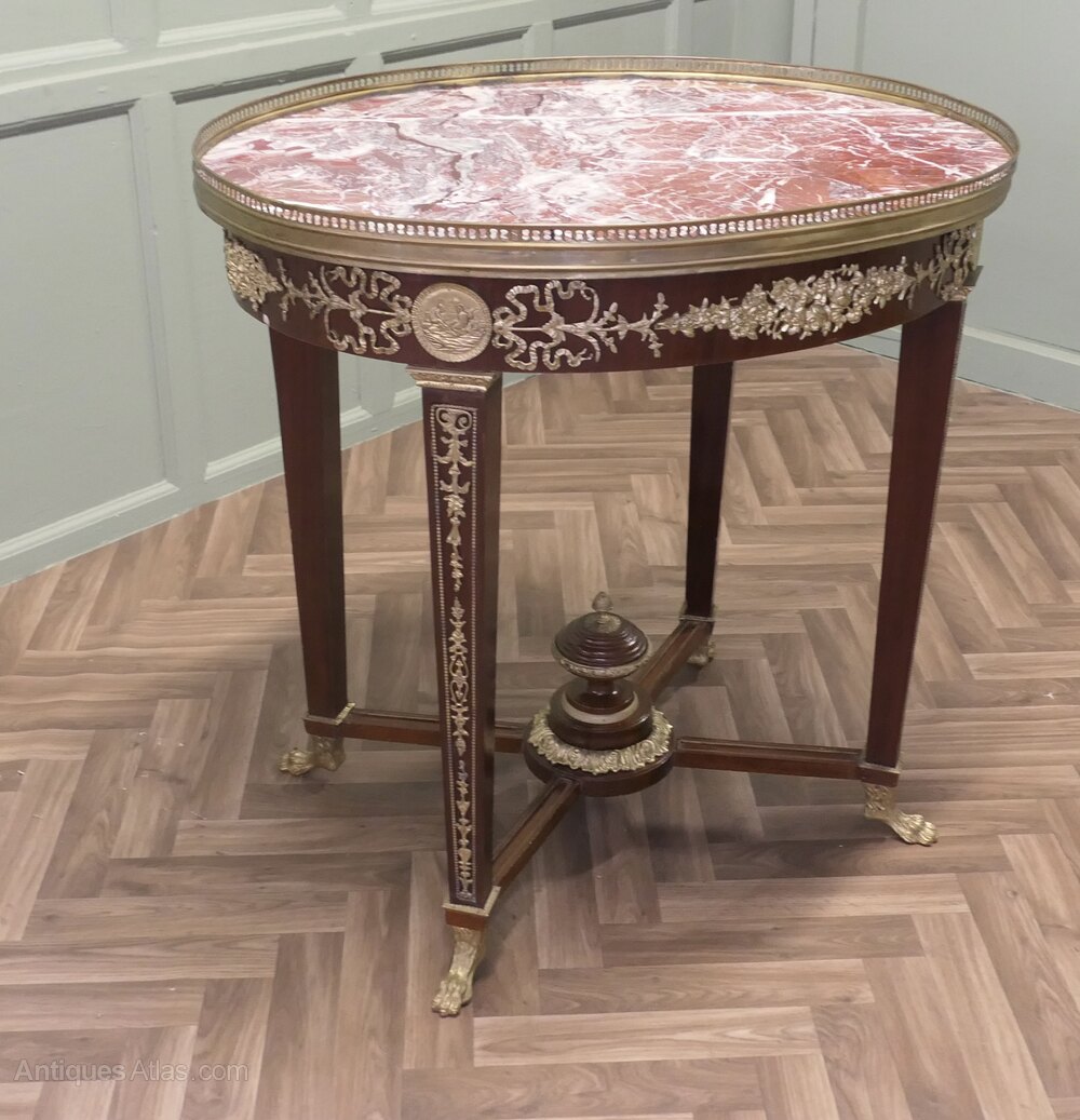 French Empire Style Oval Centre TableAn amazing piece, the table is made in walnut it is a large Oval, the table top is made with Rosso Levanto Marble and set with a pierced brass gallery over an ormolu decorated apron, the legs and the centre turnings of the stretcher are also decorated with ormolu and the table is set on small paw feet.