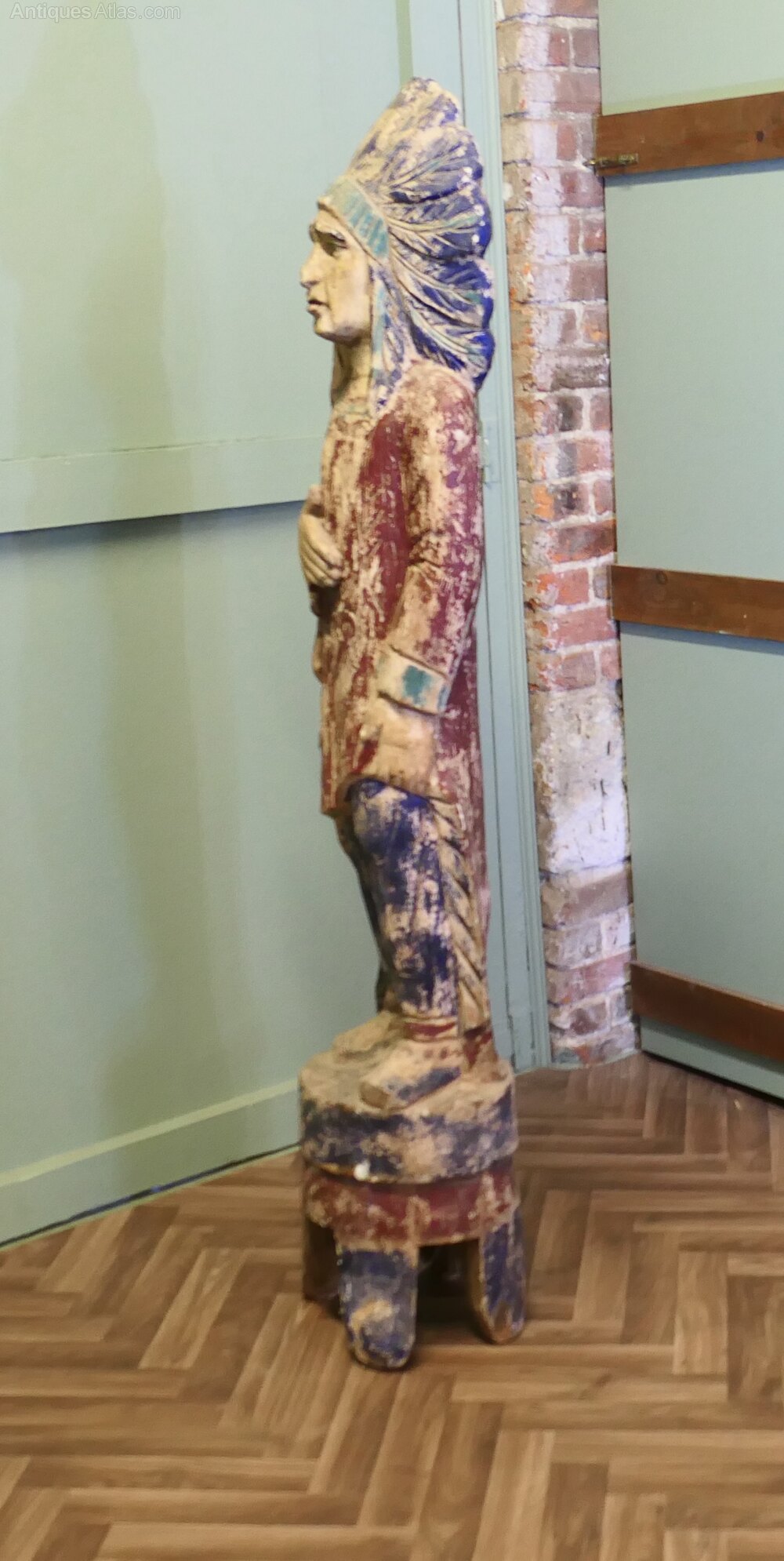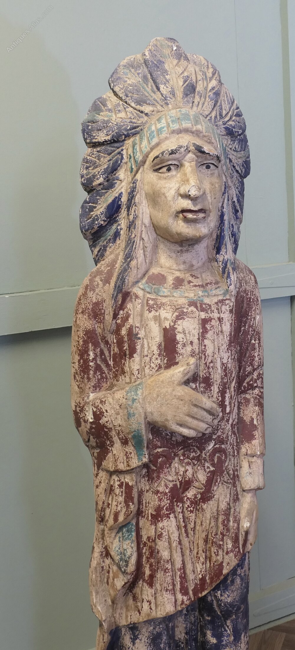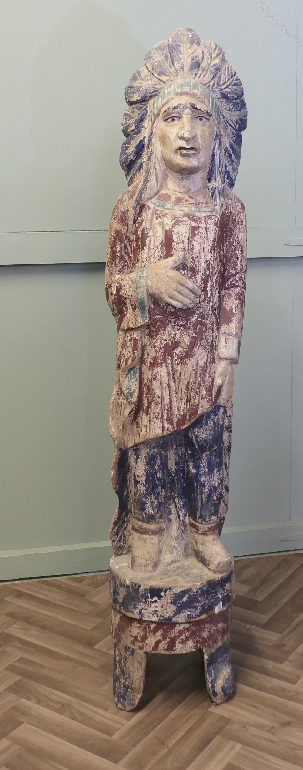 Carved Cigar Store Native American Indian, Shop Trade SignThis is a very rare find, he is an almost full size American Indian Chief, he is carved from one piece of wood ( a tree trunk, possibly pine ) Our Indian Chief stands on a small plinth he has a full headdress and the carved detail on his clothing is clear