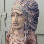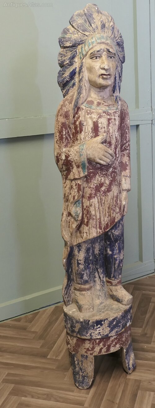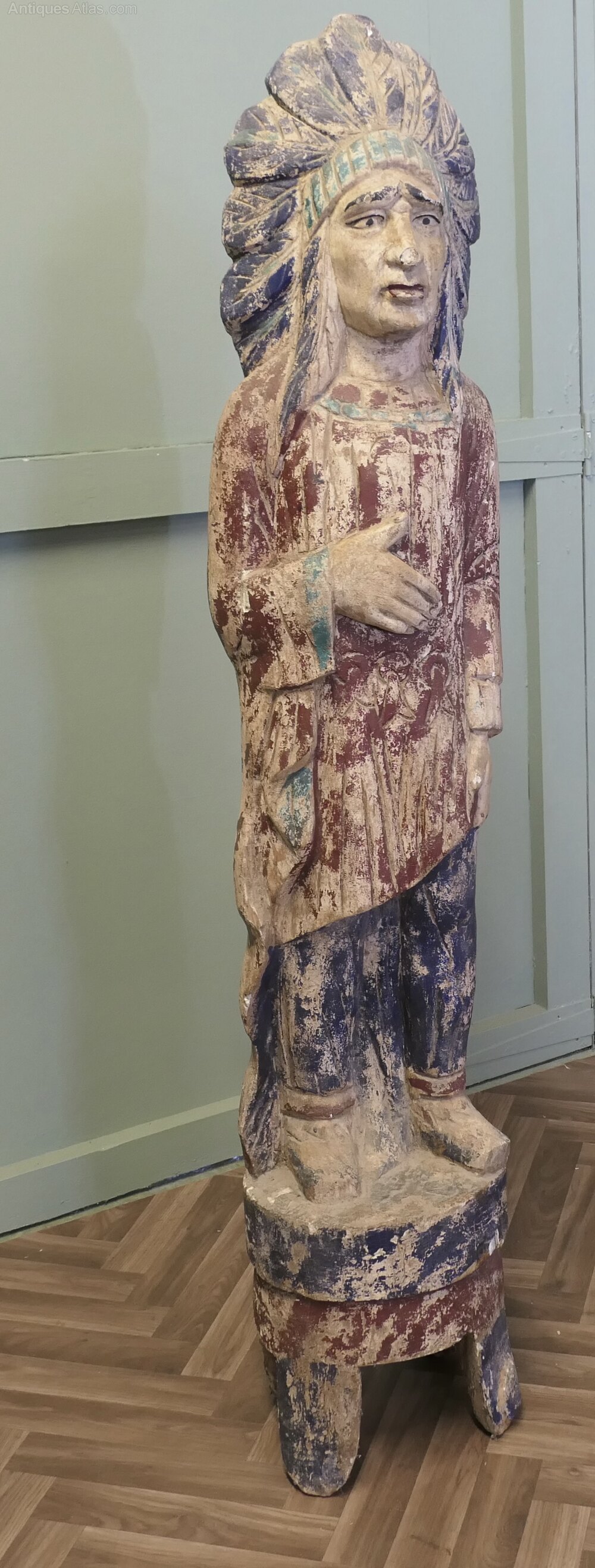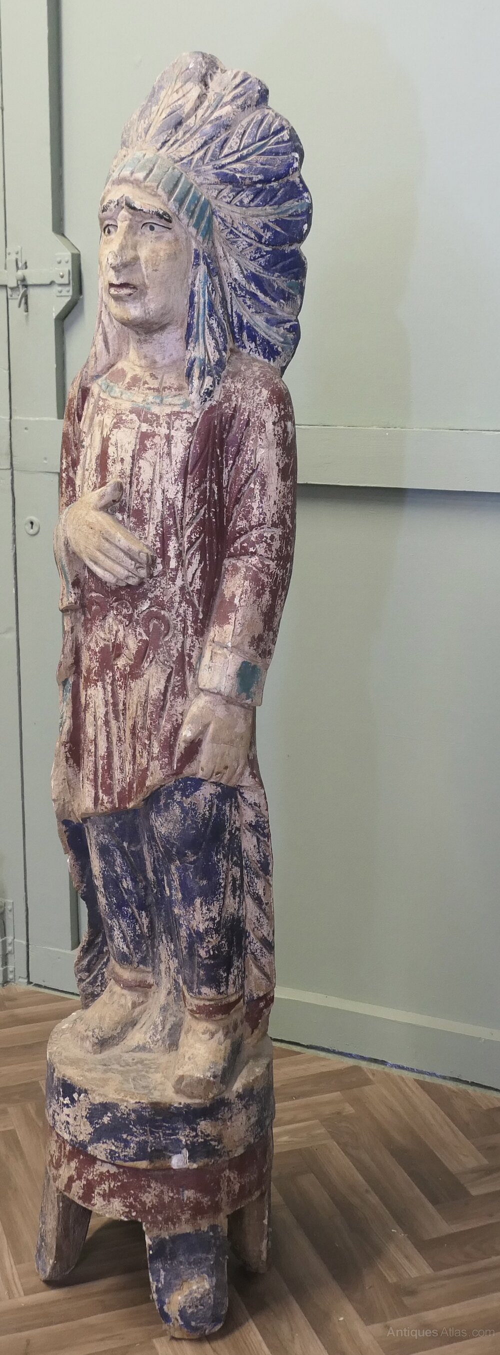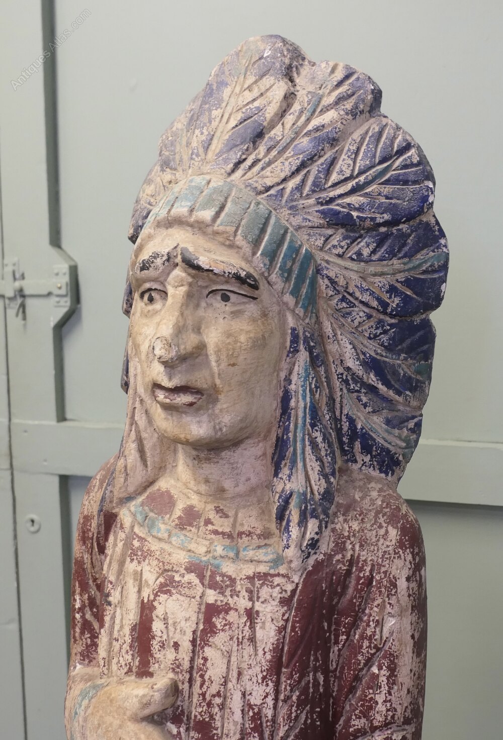 Carved Cigar Store Native American Indian, Shop Trade SignThis is a very rare find, he is an almost full size American Indian Chief, he is carved from one piece of wood ( a tree trunk, possibly pine ) Our Indian Chief stands on a small plinth he has a full headdress and the carved detail on his clothing is clear