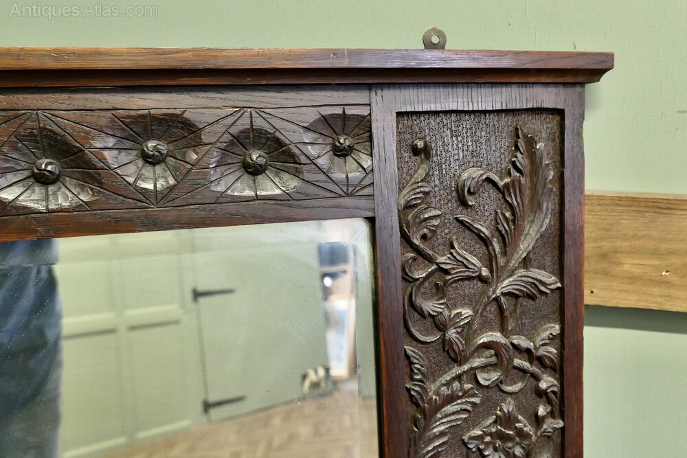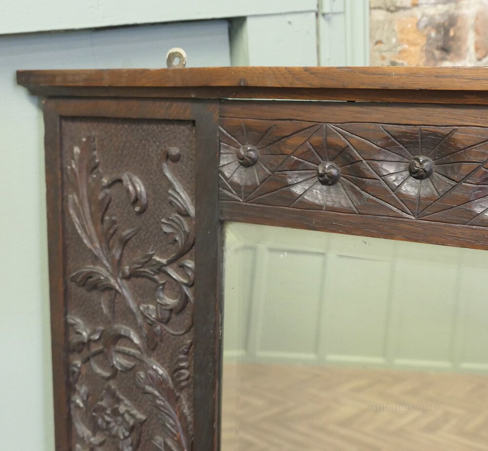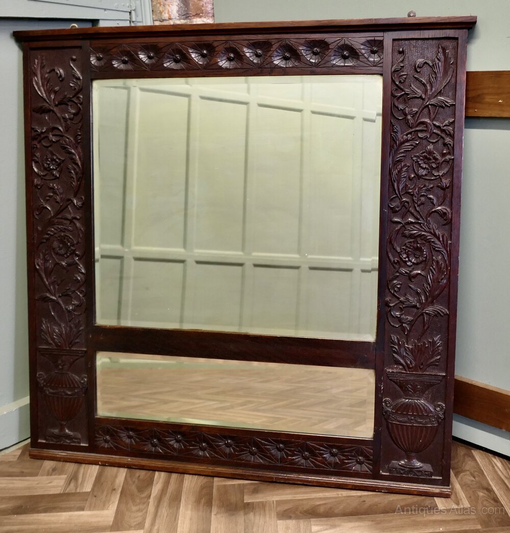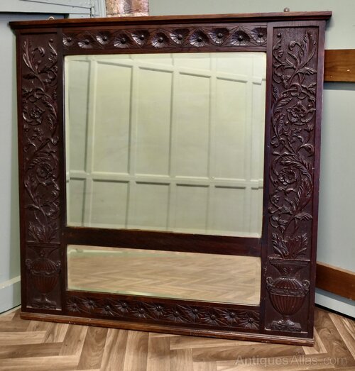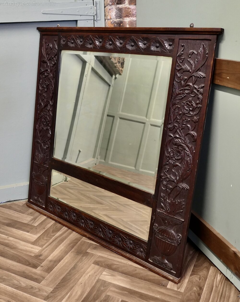 A Large Carved Oak Wall MirrorThe wide Oak Mirror Frame is Beautifully Carved it has deep flower like roundels along the top and both the sides are carved with a classical urn filled with a tall acanthus arrangement