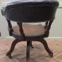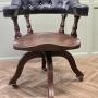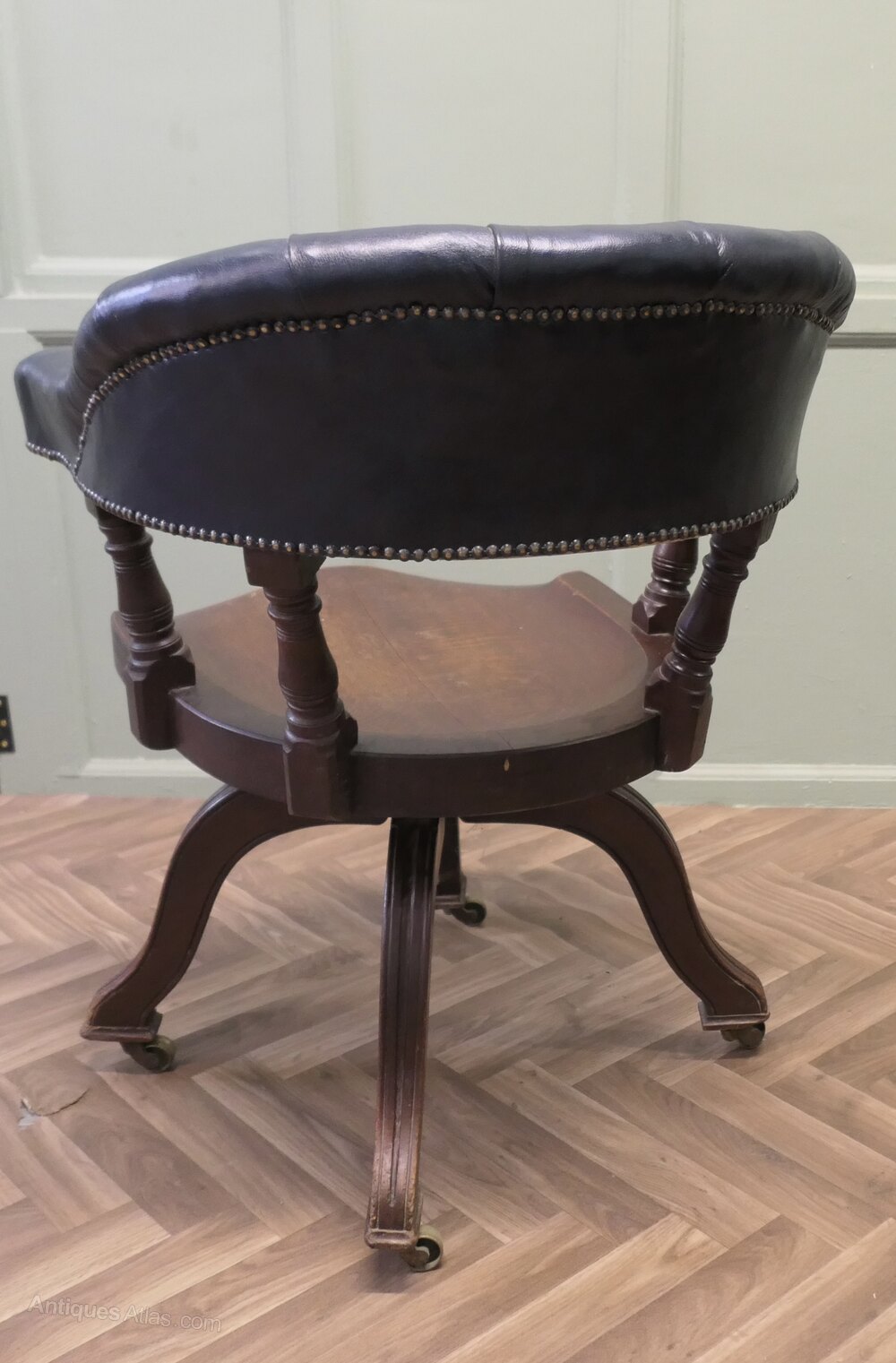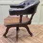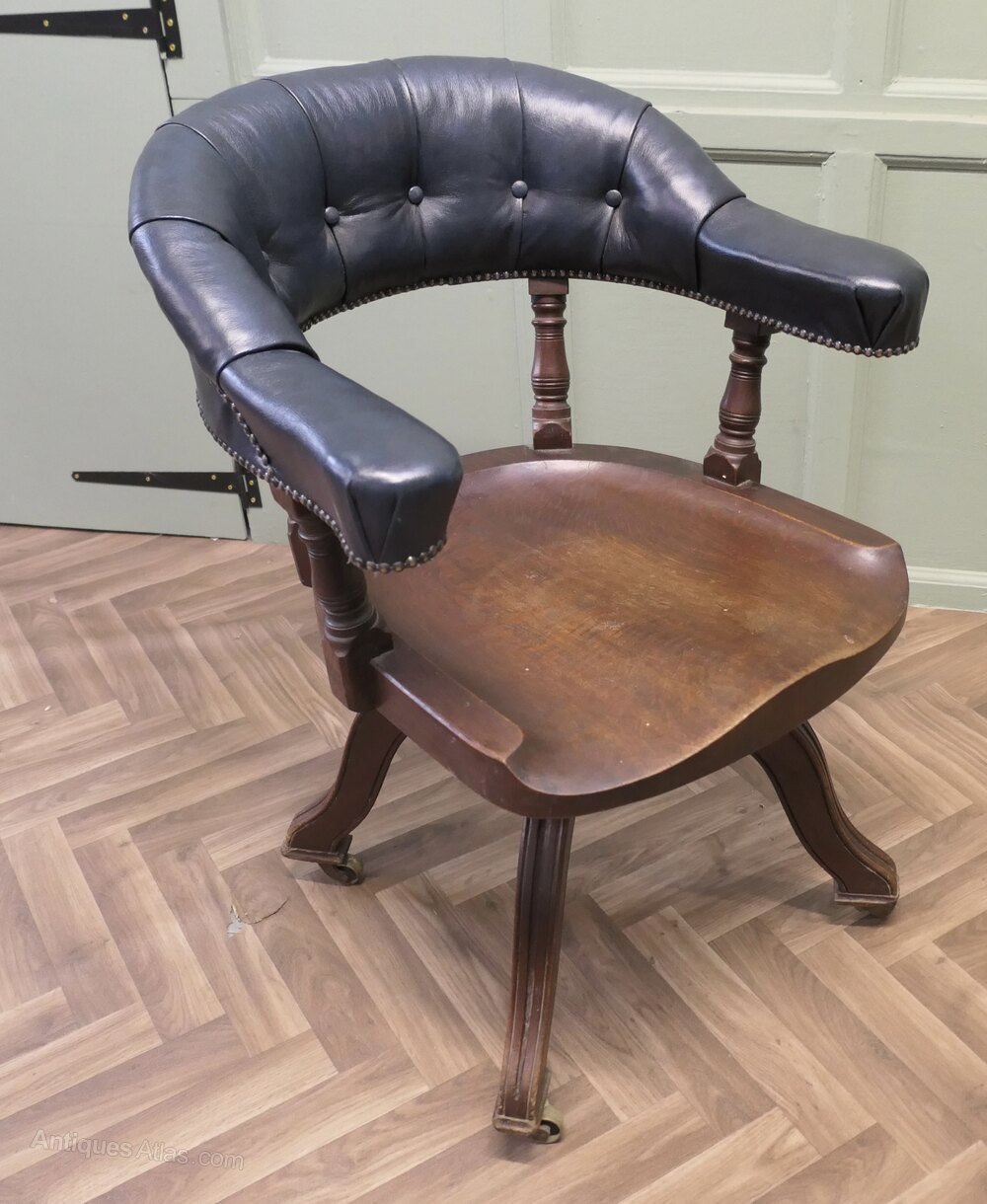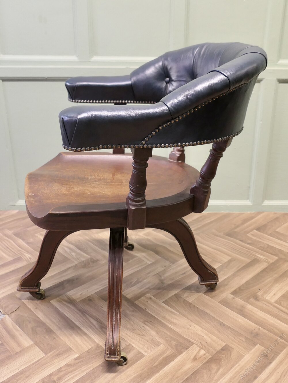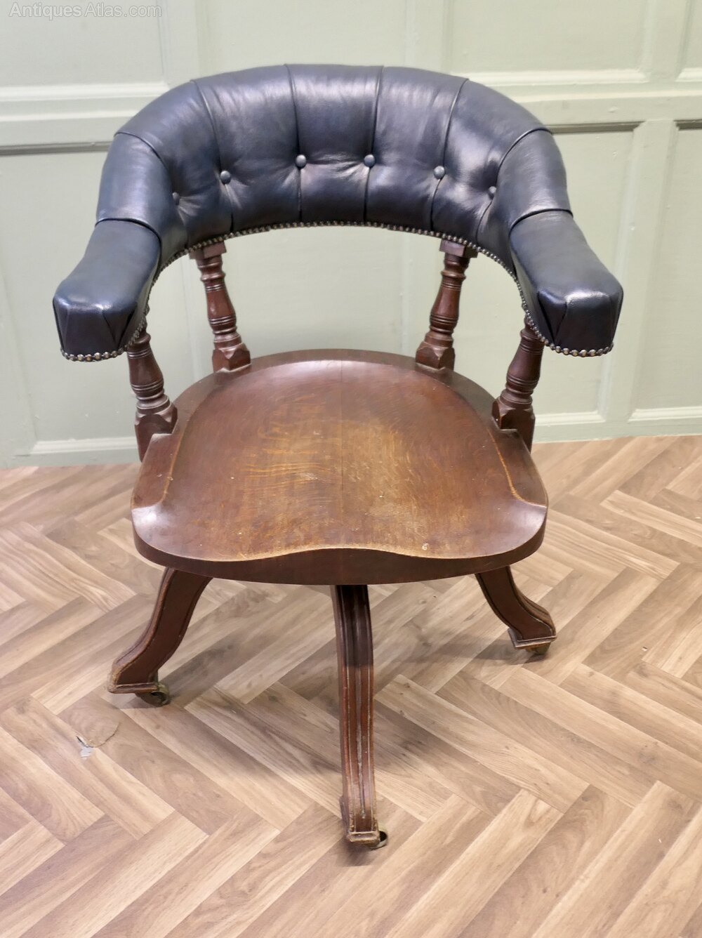 A Superbly Comfortable 19th Century Swivelling Desk ChairThe Chair has a deep curving top rail which forms the arm and back rests, is is deeply buttoned dark blue leather upholstery giving great comfort for the back and arms. The chair also has a large beautifully shaped saddle seat, it swivels fully all the way around and is very stable and comfortable, this is larger than normal chair.