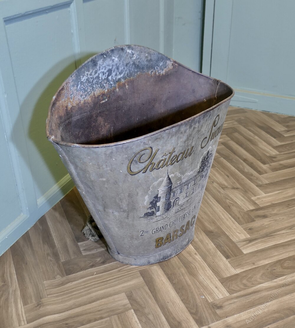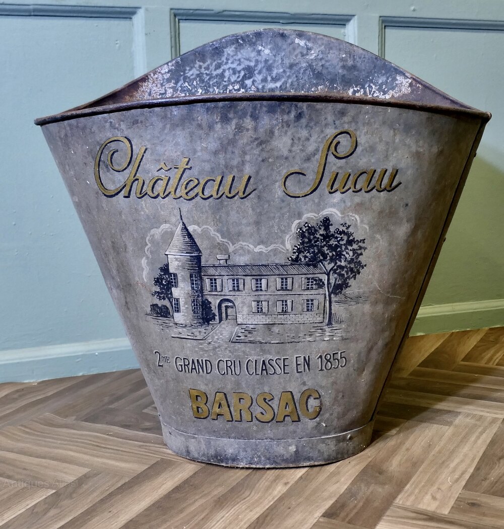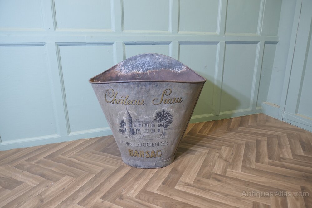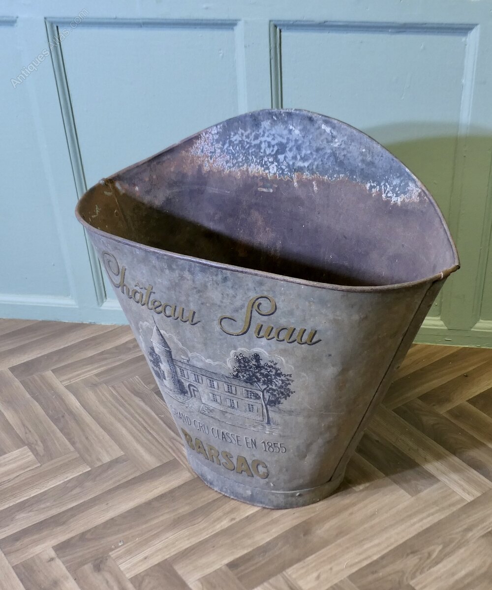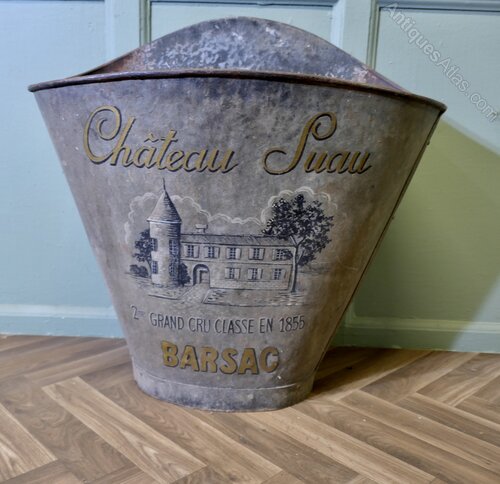 19th Century French Vineyard Grape Hod From Chateau Suau, BarsacA French Grape Pickers’s Hod from the Gironde Region in the South West of France, this galvanised hod would have been worn on the back of the grape picker. The hod has a painted grey background and on the front we have a picture of the Chateau Grand, the painted finish is good