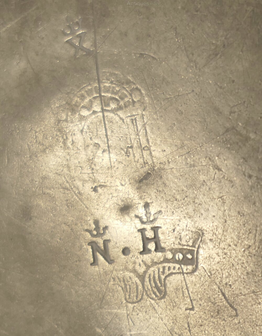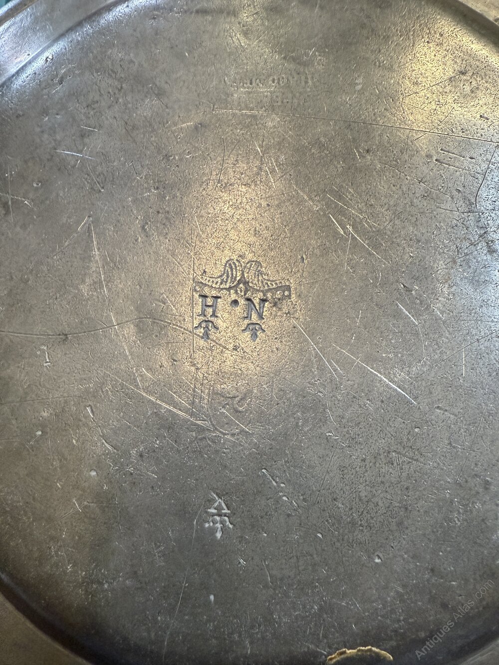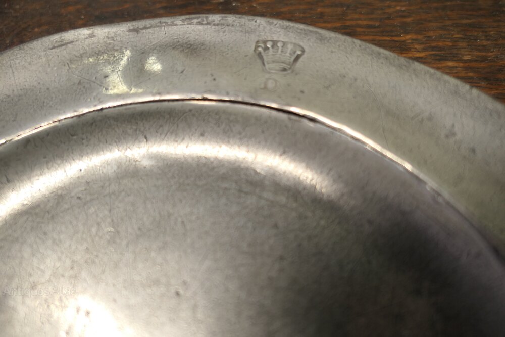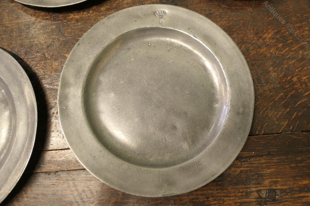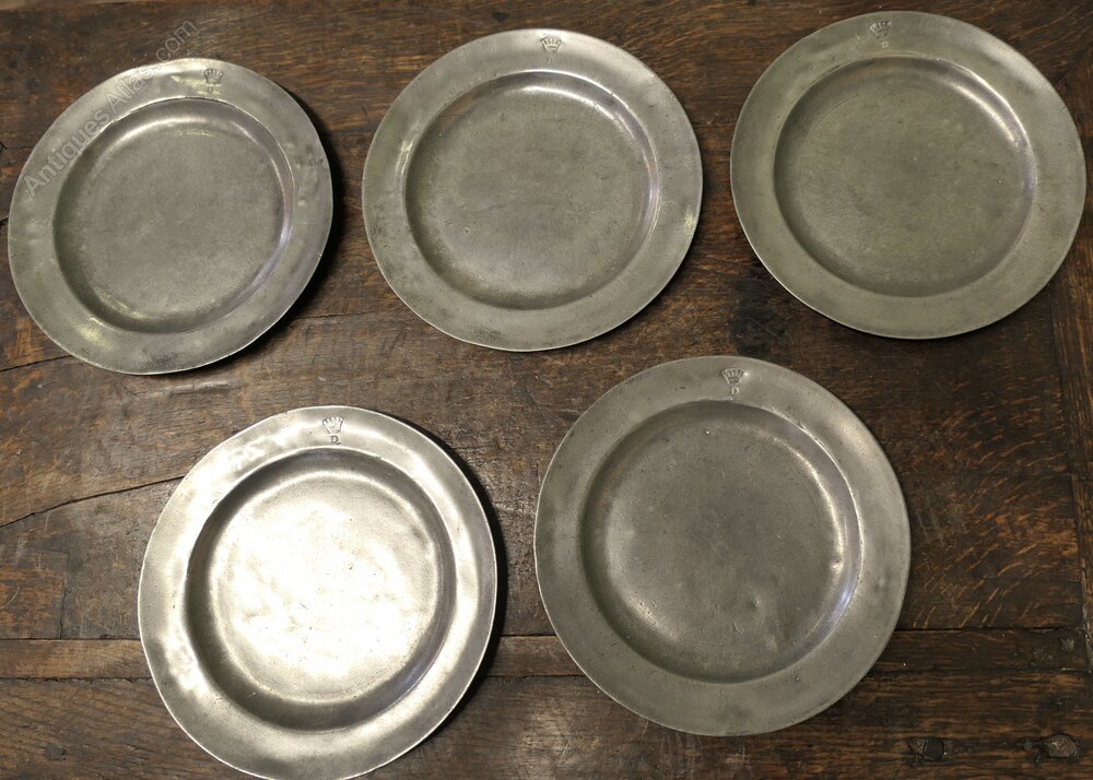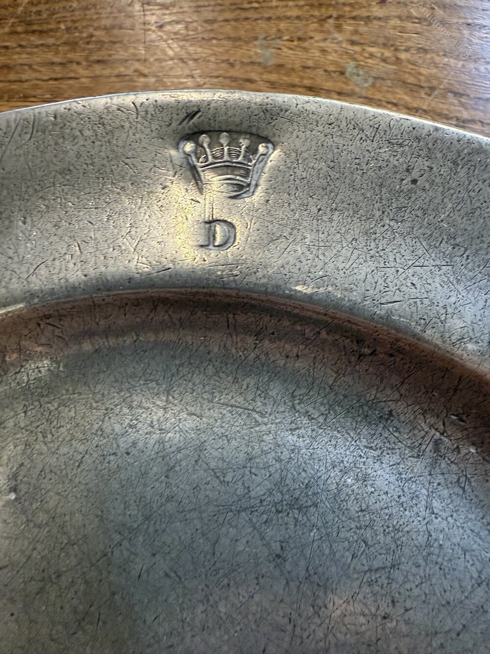 5 Pewter Chargers, Embossed with a “Crown over D”Antique English pewter plates, the front rim is engraved with a Crown over the Letter D, on the underside they all have the same touch marks