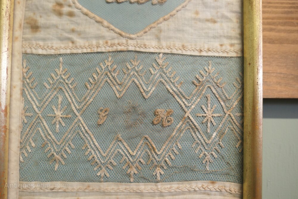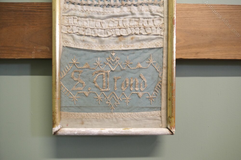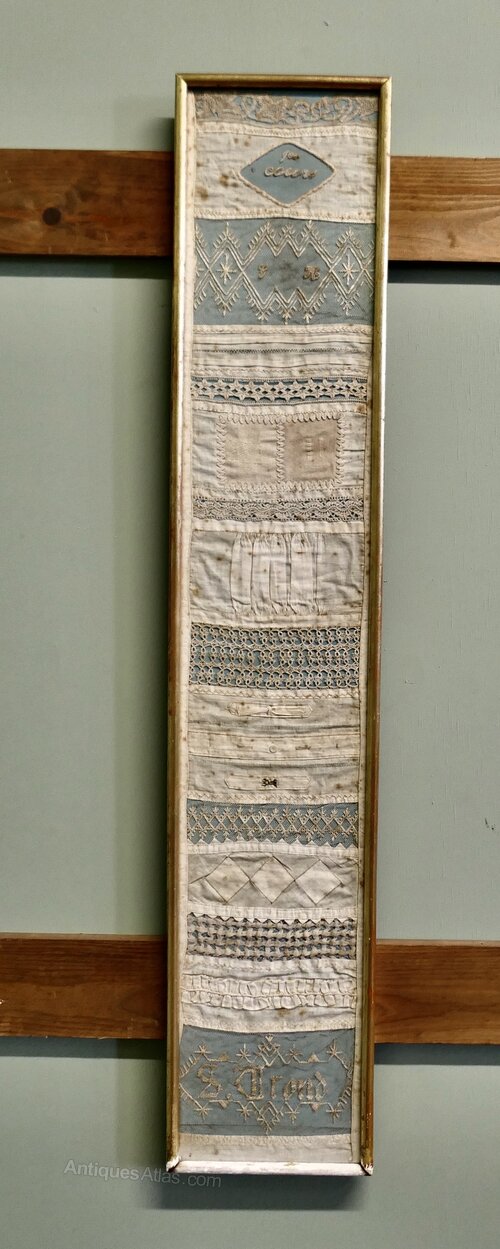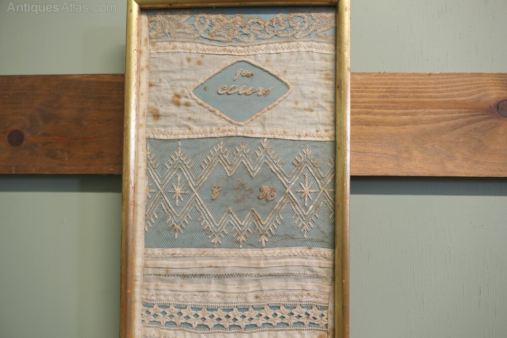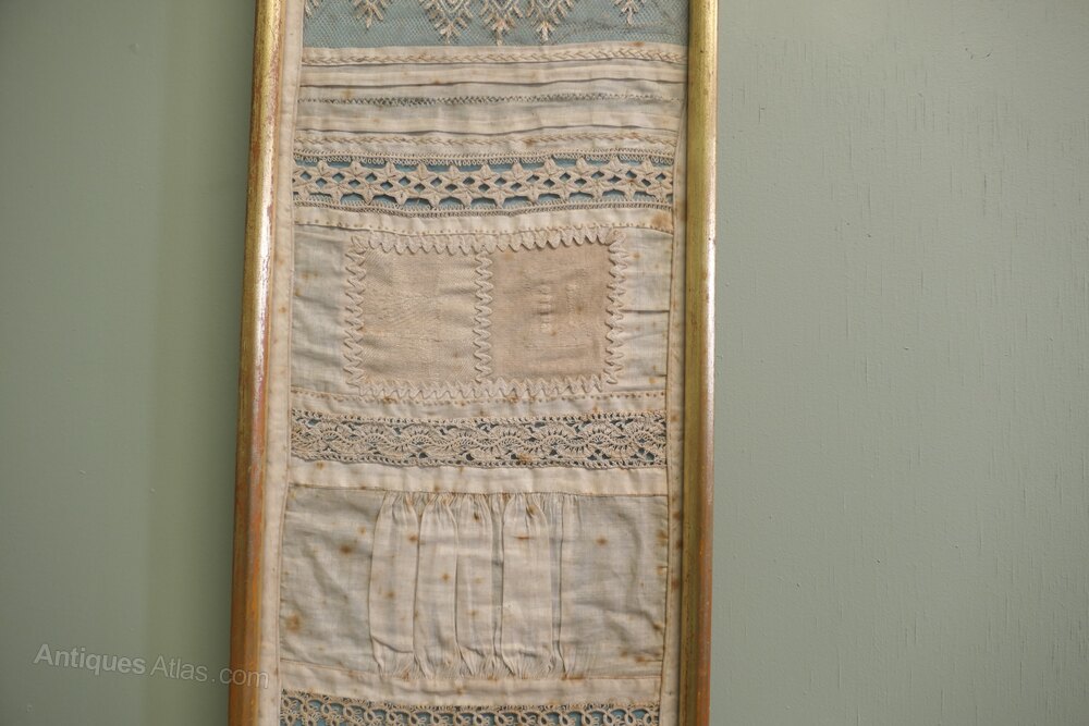 Early 19th Century French Lace SamplerA Sampler in the true sense, many lace samples presented in a long old gold frame, the frame has protected the lace and linen samples, there is quite a lot of iron staining