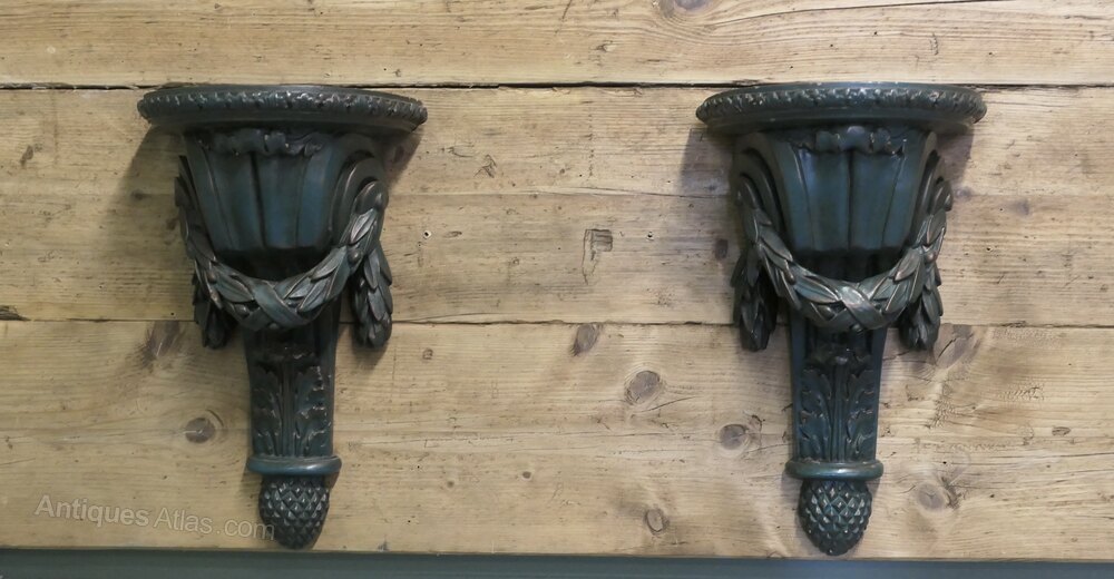 Pair of 19th Century Green Wall BracketsThese are beautifully designed pieces, they are in a classical style and painted in a very dark green, they could be used as wall brackets or shelves