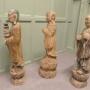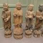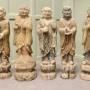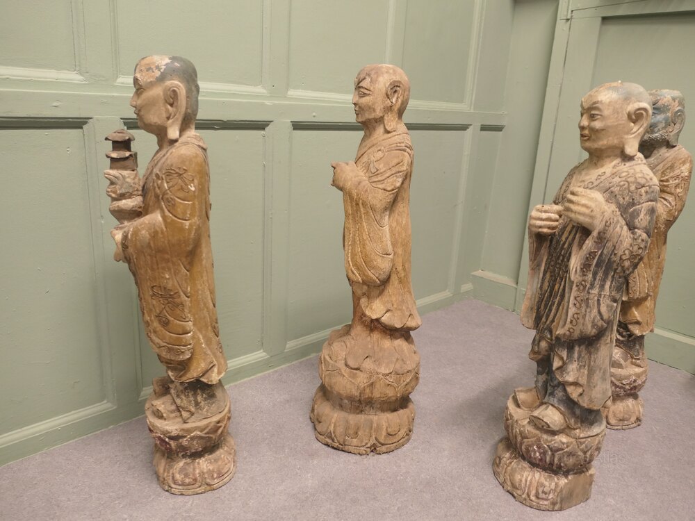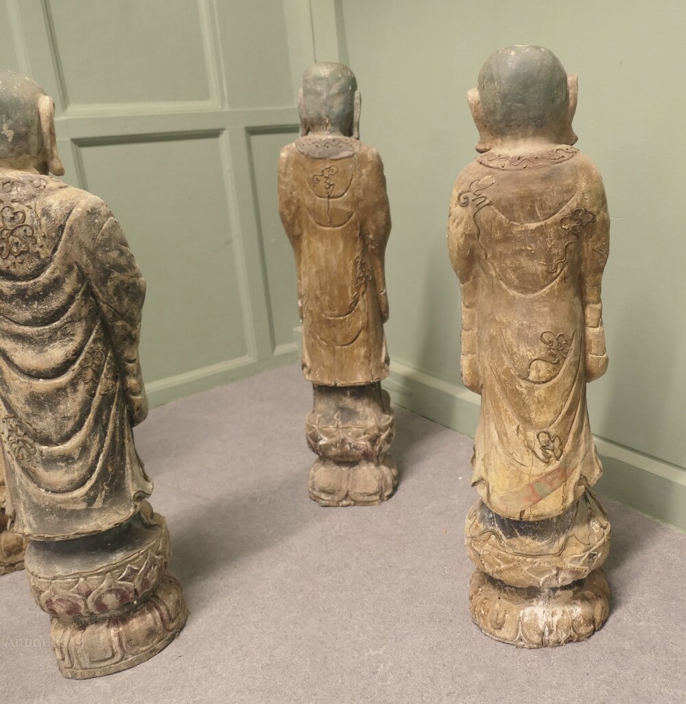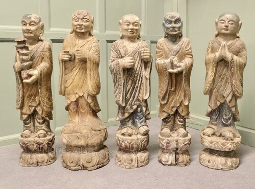 5 Very Old Carved Figures of Buddhist ImmortalsThese lovely statues date from the 18th/19th Century, each one is carved from a single piece of wood, the garments are carved in fine detail, the Deities have their hands held in different gestures.